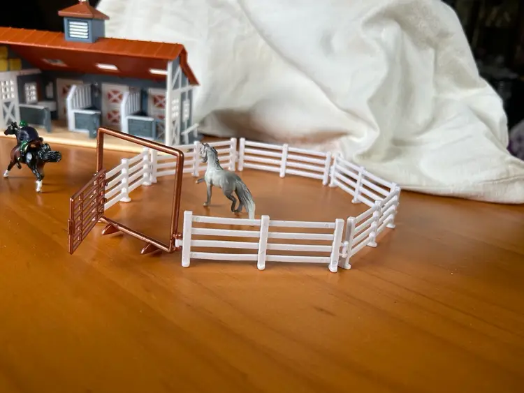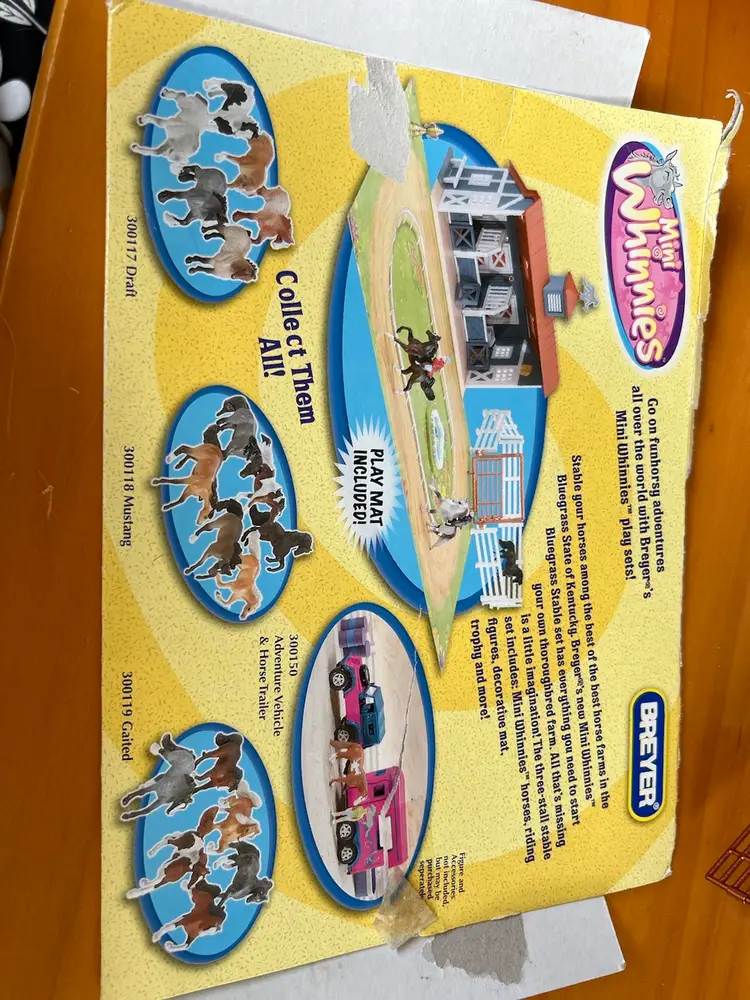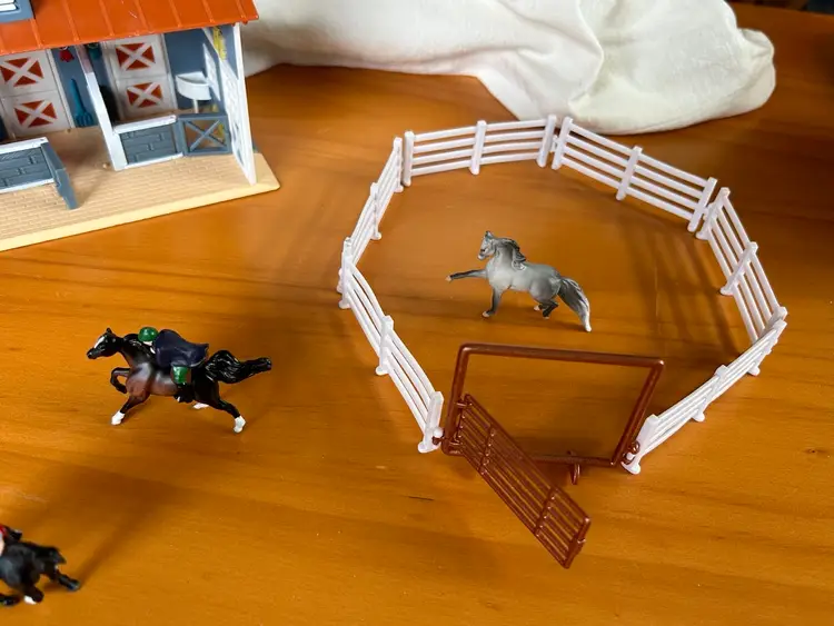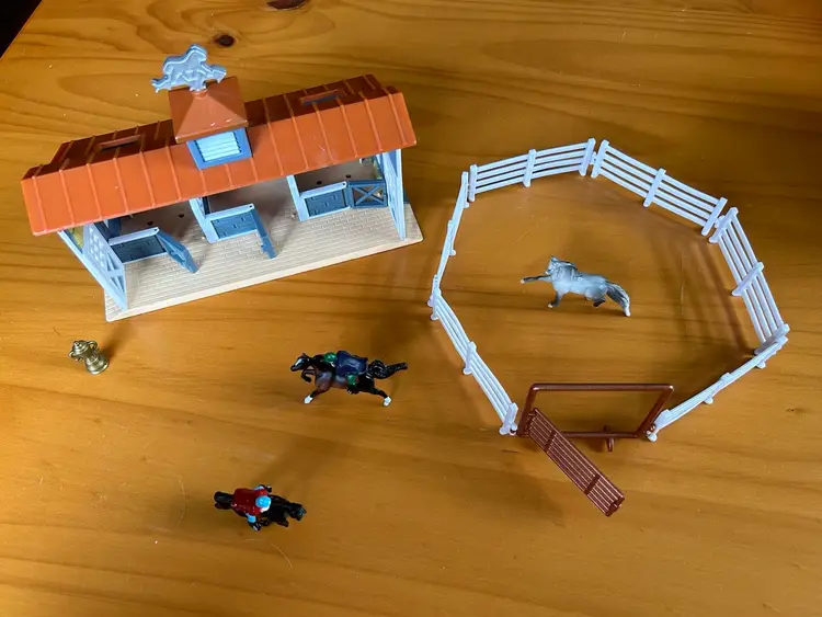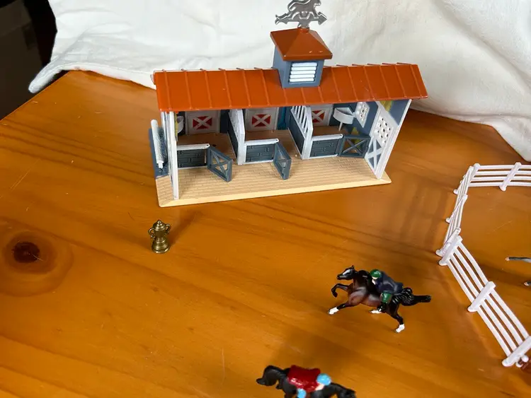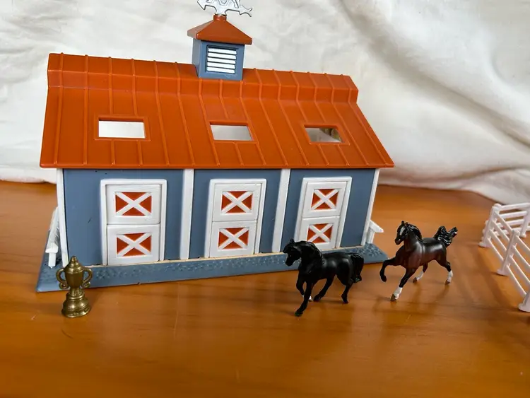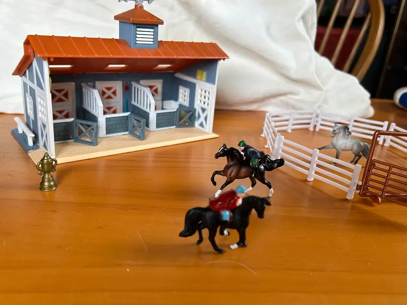 Complete set: blue barn, 3 horses, 2 riders, trophy, 6 pieces of white fence, and gate. No play mat. Super bargain for Breyer collectors or young horse lovers.