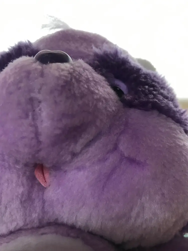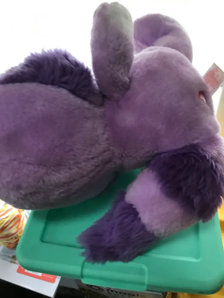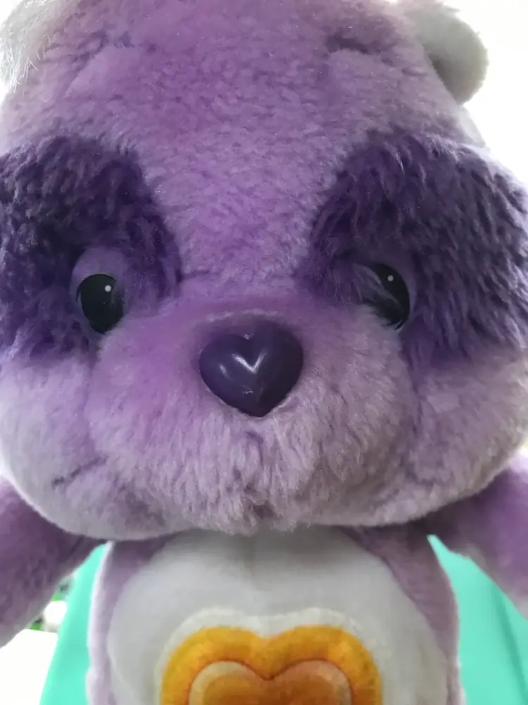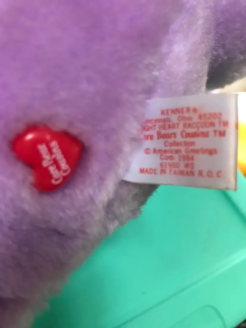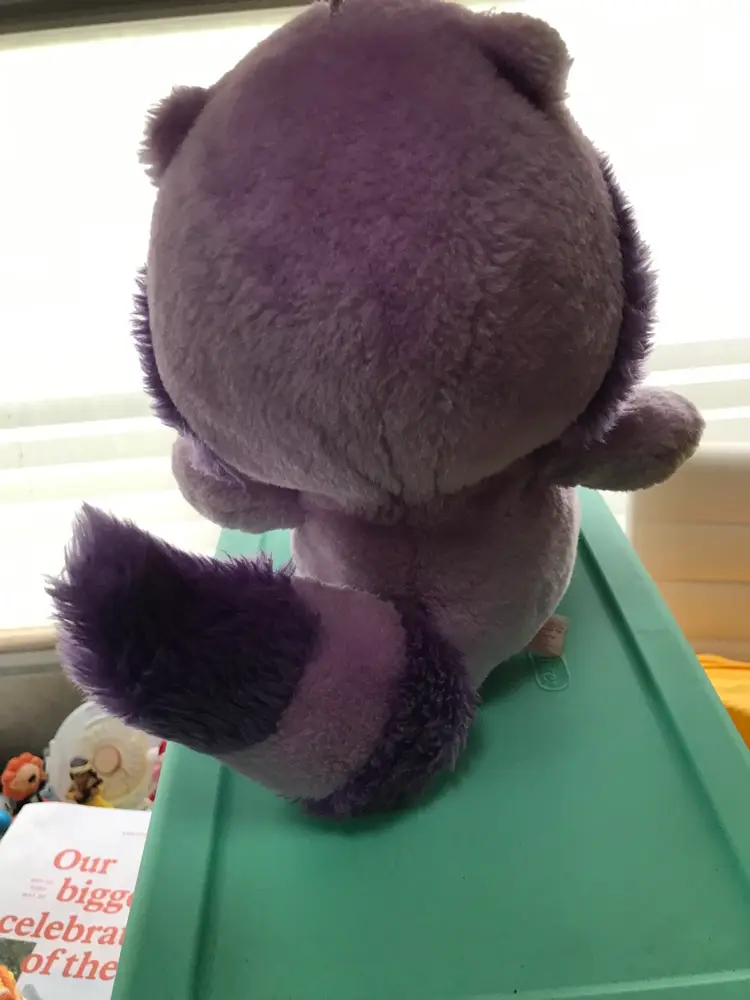 Purple & Lavender Raccoon plush Care Bear Cousin Bright Heart. He is Pre Owned with no stains, spots or rips. May have very minor rubs on plastic parts such as eyes, nose, and tush heart. Tag says American Greetings 1984 Kenner. Depending on how you measure he is 12-14 inches tall. Questions are always welcome. And welcome to the site.