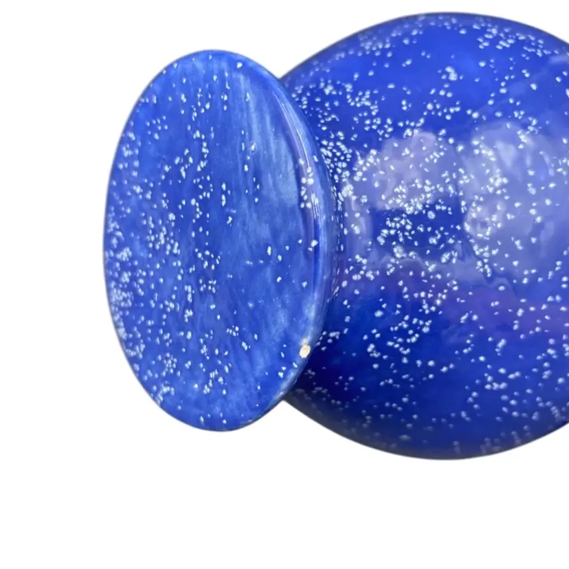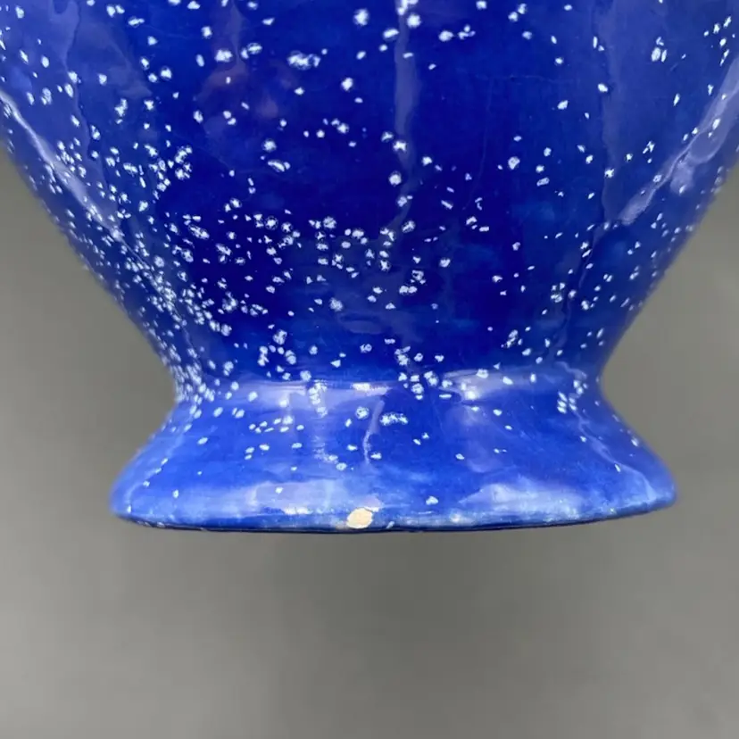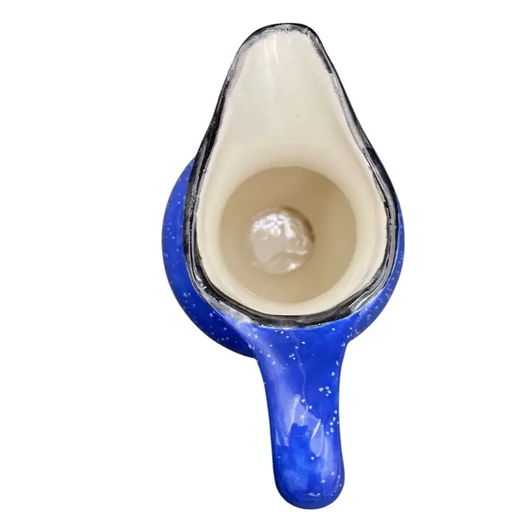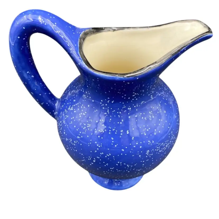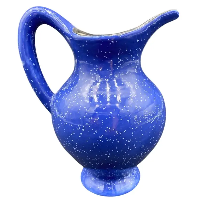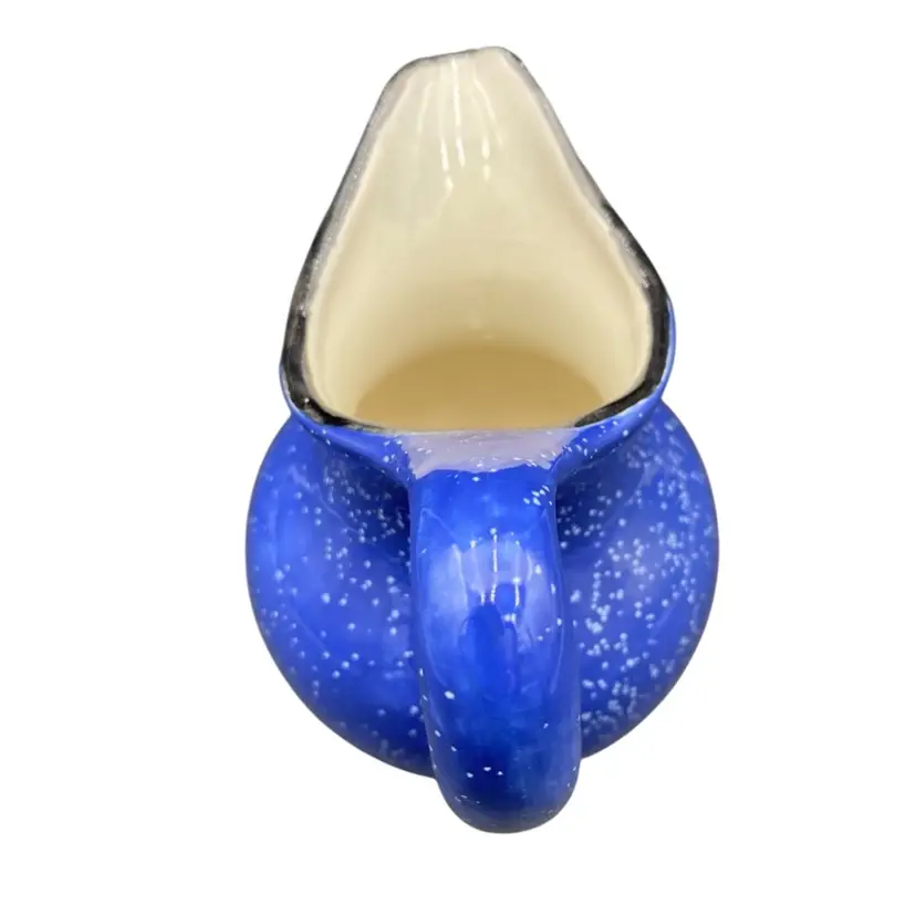 This beautiful bright navy blue art pottery pitcher vase has a glossy finish and white speckles to give it a unique look. The sculpted handle adds a touch of grace. Measuring 6 inches in height and 5 inches in width, it has a weight of 10.6 ounces, making it easy to move around and display. The black rim adds a pop of contrast to the bright blue, making it an eye-catching piece. Perfect for displaying fresh flowers or as a standalone decorative item.