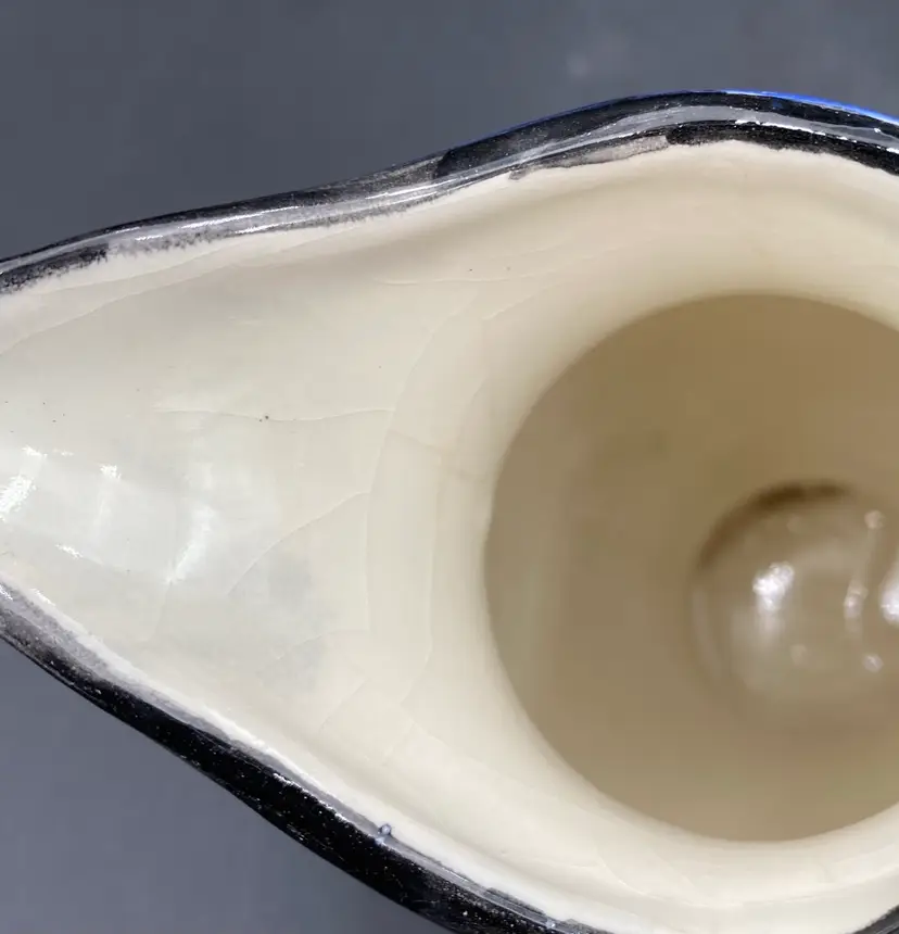 The vase is in very good condition. There is one spot in the inner base that is unglazed and there is some crazing on the inside. There is also a small nick on the base. Please see the pictures. The color remains quite vibrant and there are no issues with the outside of the vase.