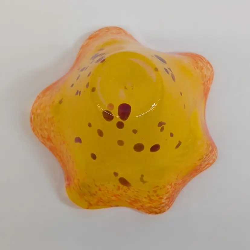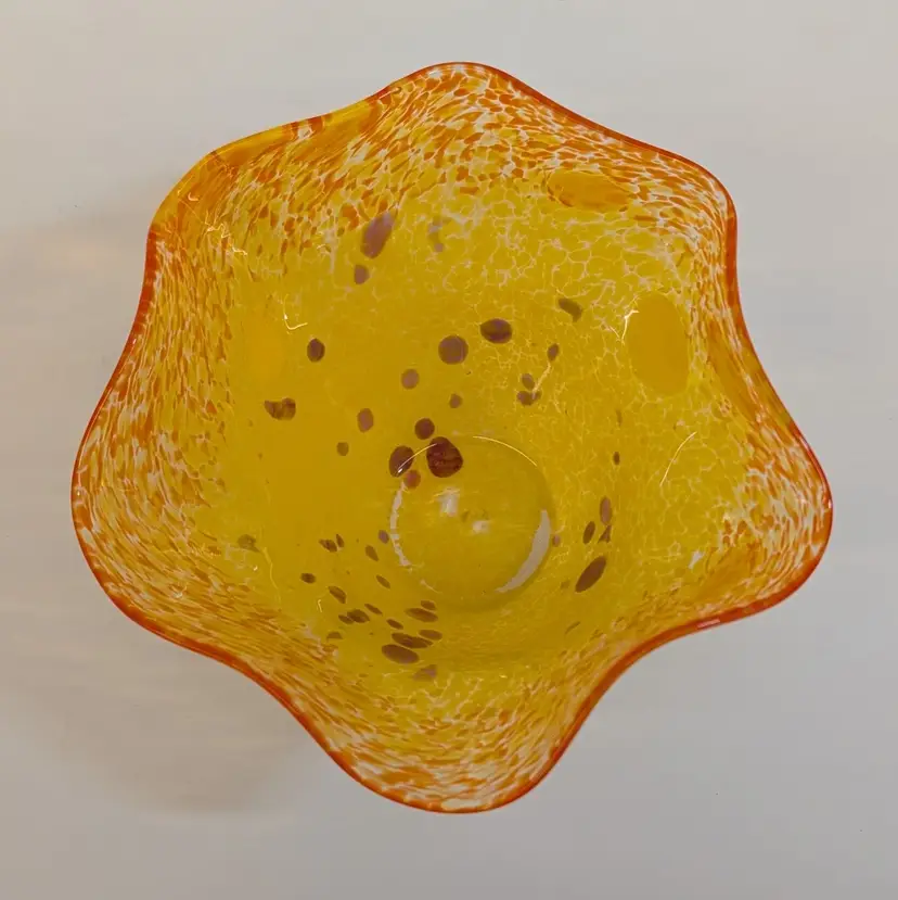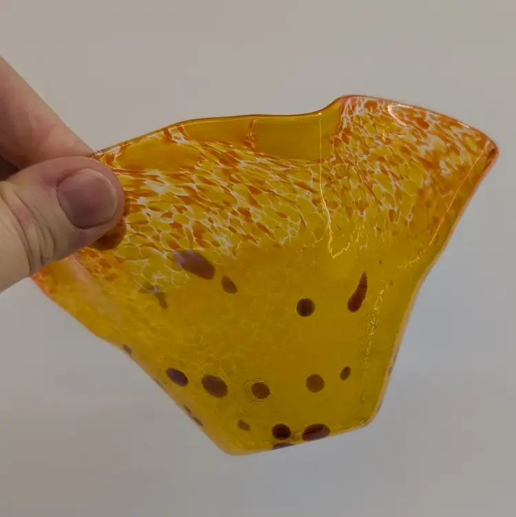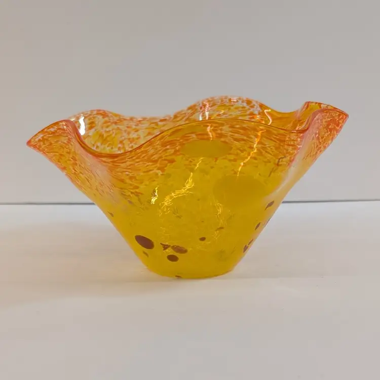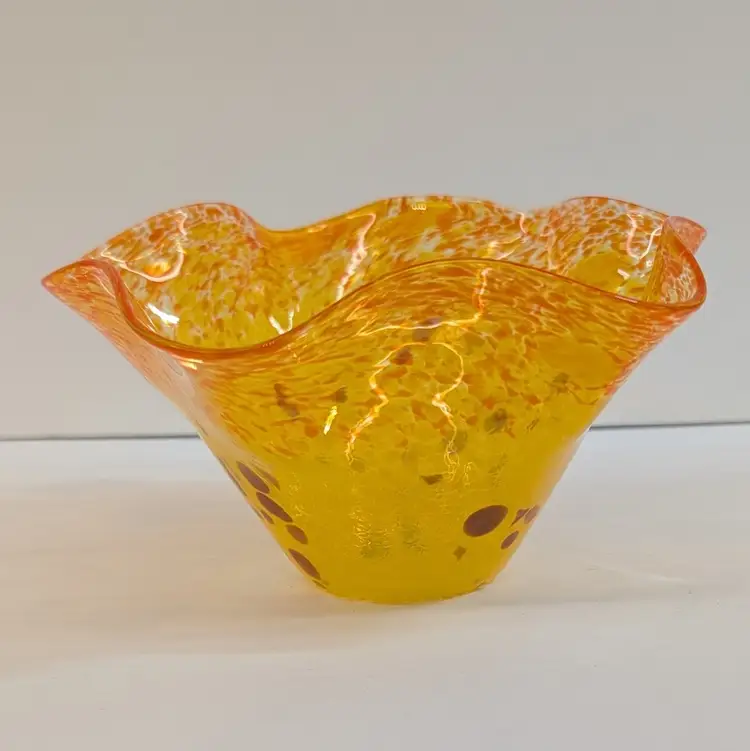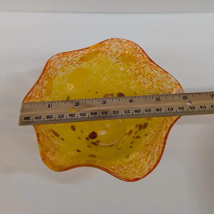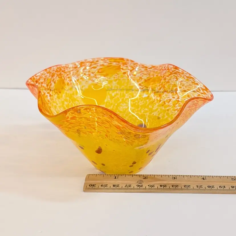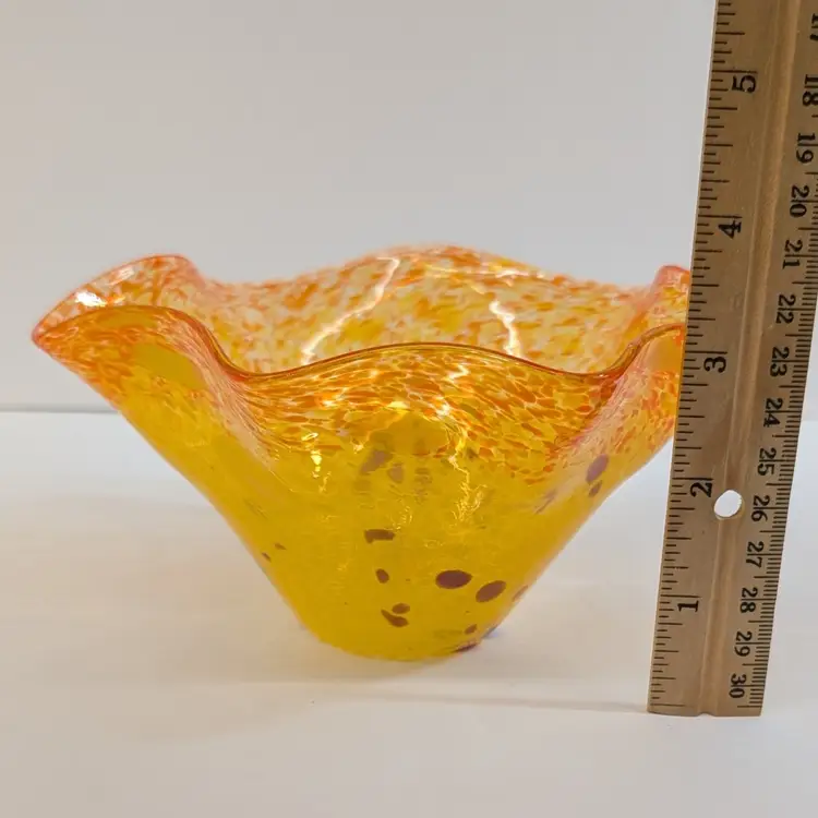 A beautiful, bright and colorful art glass bowl with yellow, orange and red speckles. In nice, used condition with no chips or cracks. Not signed that I could see. Measurements ~ 2 x 6 x 3.25"