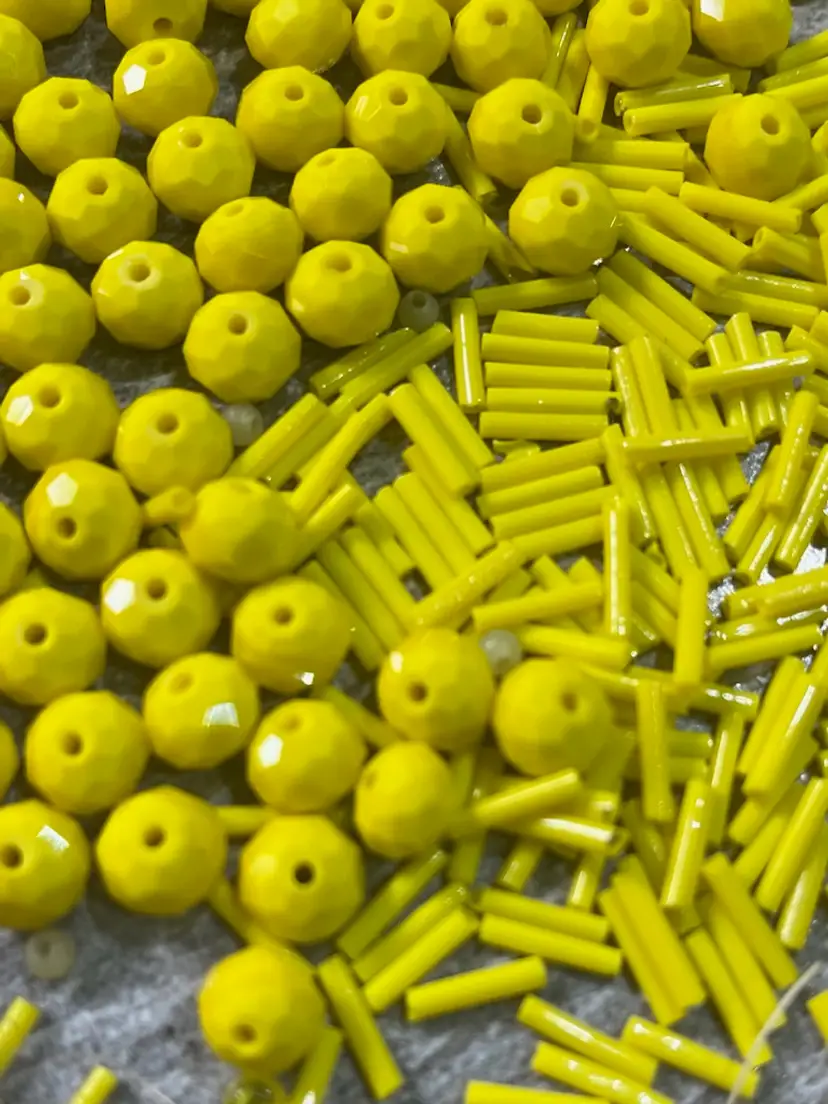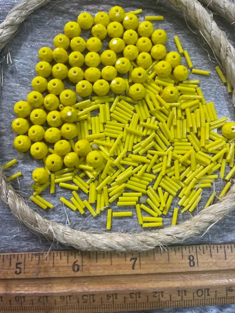 A mix of bright yellow beads. The faceted round beads are 6mm. The tube beads are approximately 3/8" long.