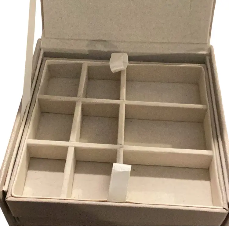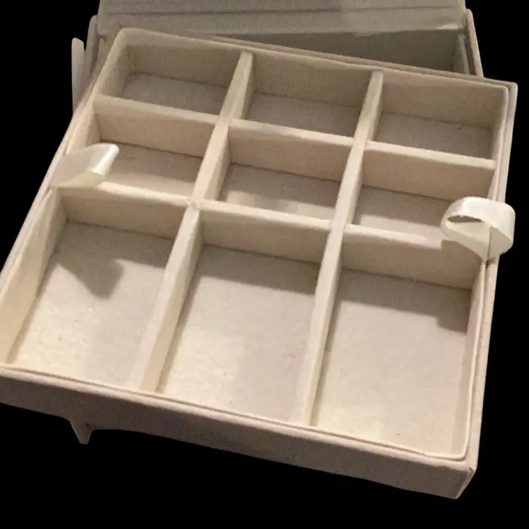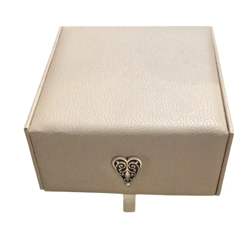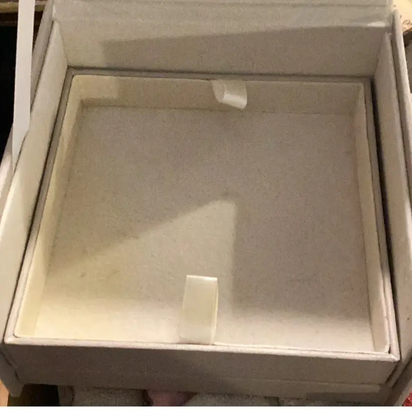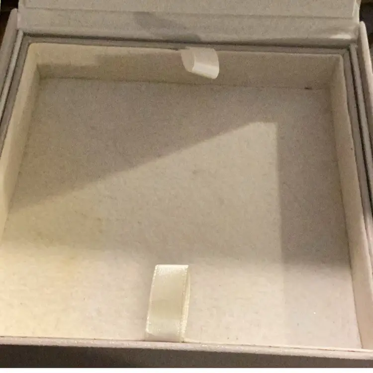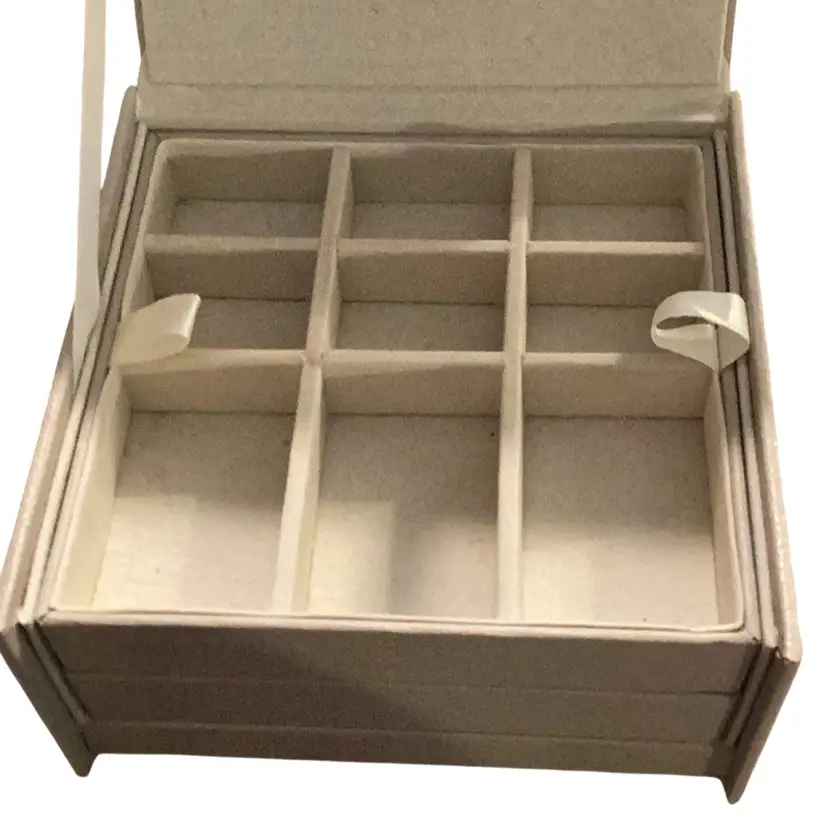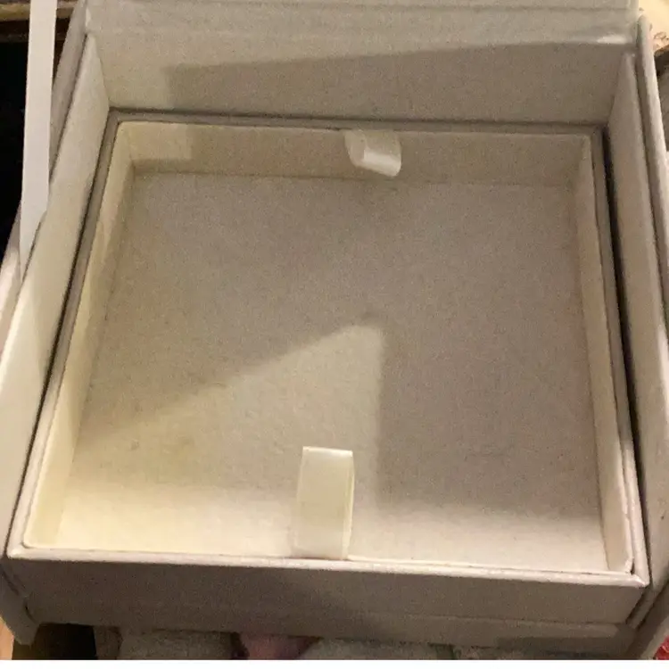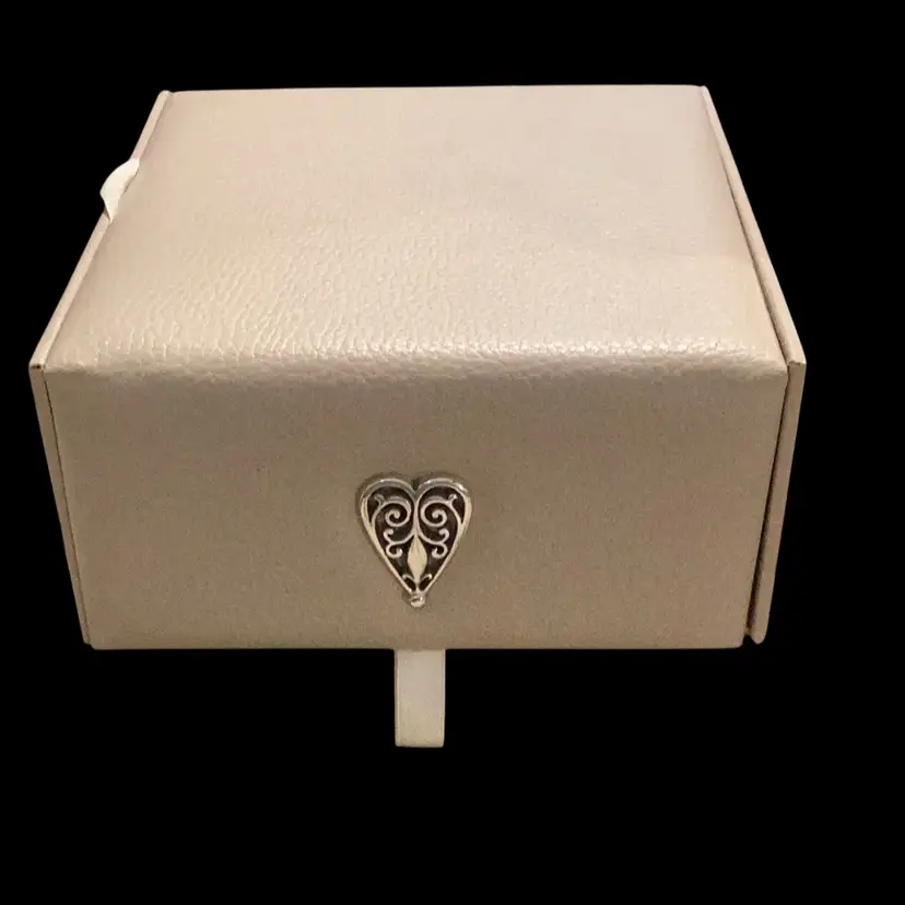 This is a brighten jewelry box. It is used by me. I had my jewelry in it and now I’m passing it on to you. I measures 5” x 5” x 2 1/2” tall has two levels to it. You open it up. You can see the bee on the back for Brighton and then there’s two levels that can come out one is a one whole complete compartment by itself and the other one is separated. It’s great jewelry box I will miss it.