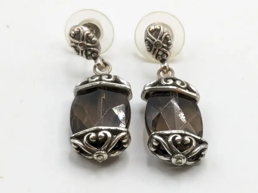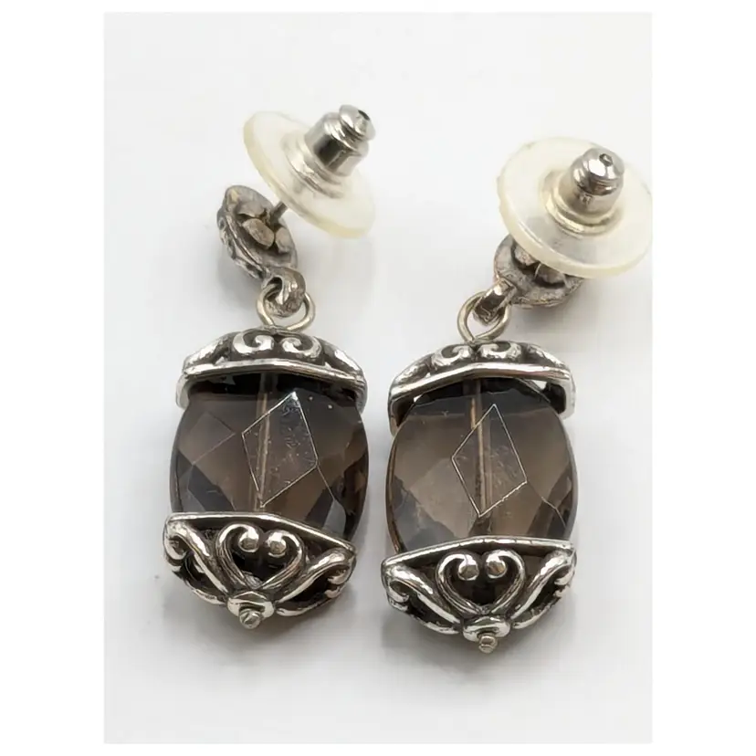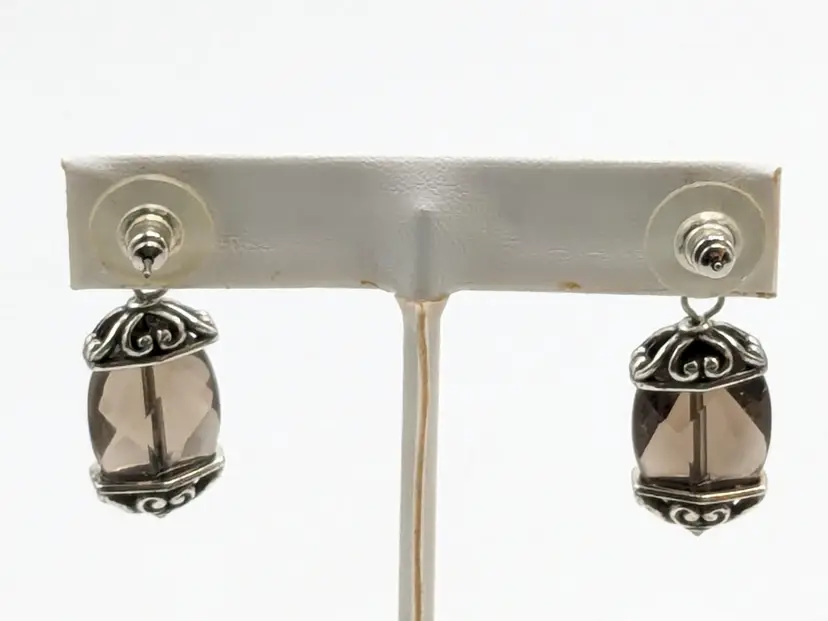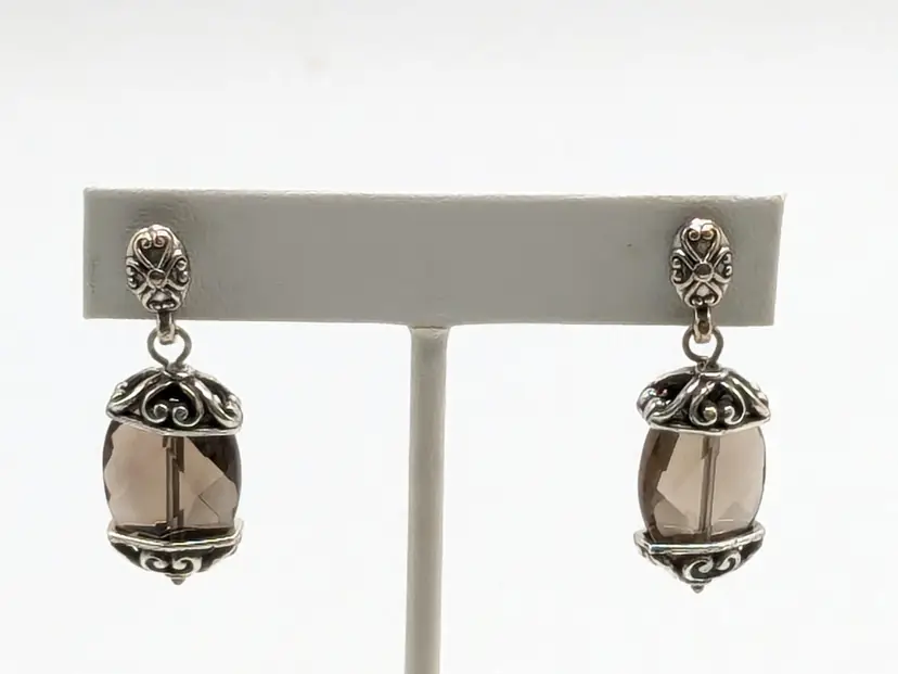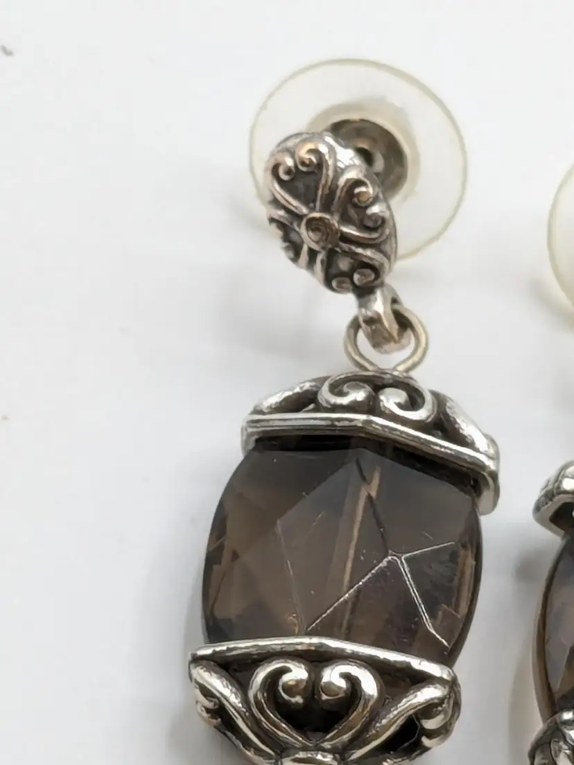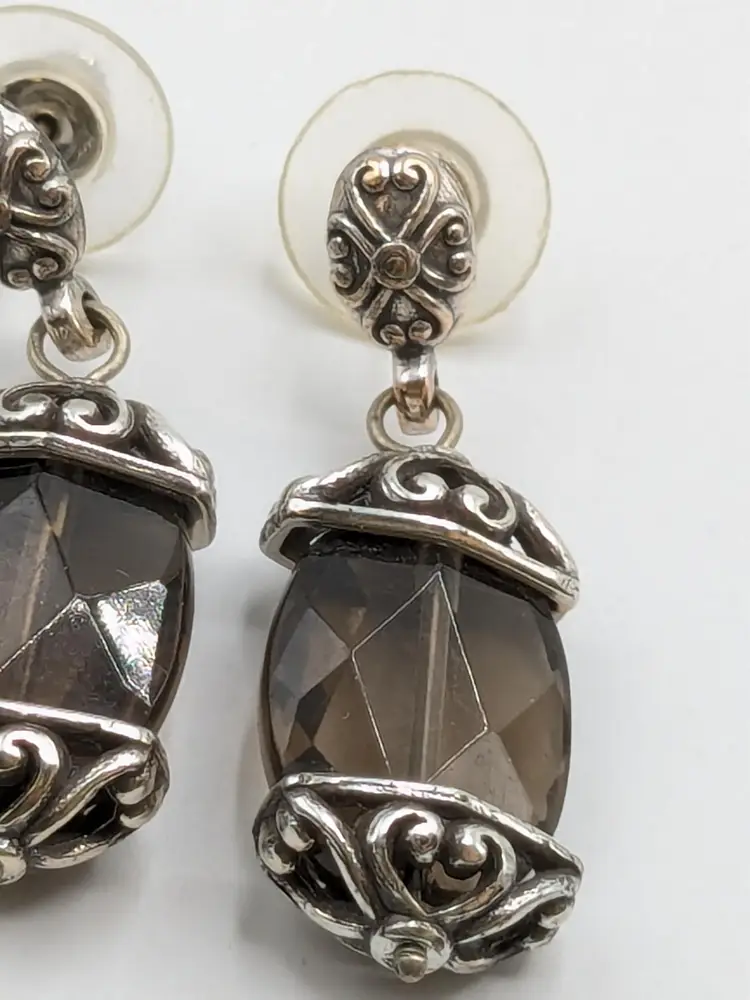 Good condition. Features faceted smoky quartz stones set in ornate silver. Earrings measure 1.3/8" in length.