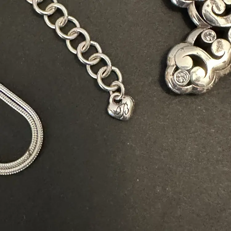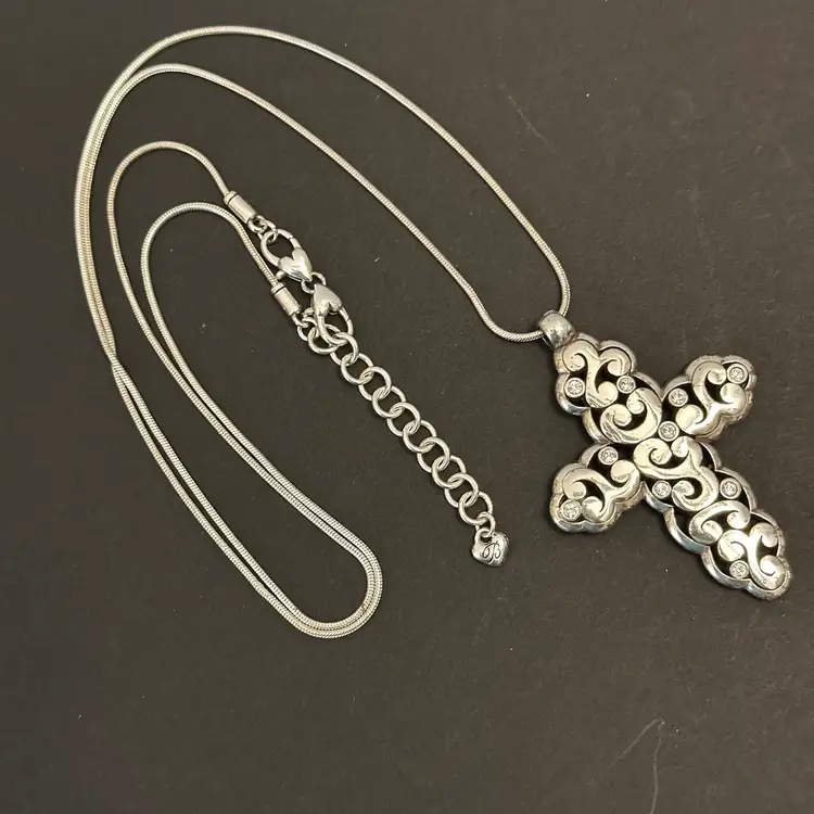 This is a Brighton Silver Ornate Cross Necklace featuring intricate scrollwork patterns and a delicate chain. Chain measures 32” with 2” extension. Cross measures 2 5/8” length x 1 7/8” wide.