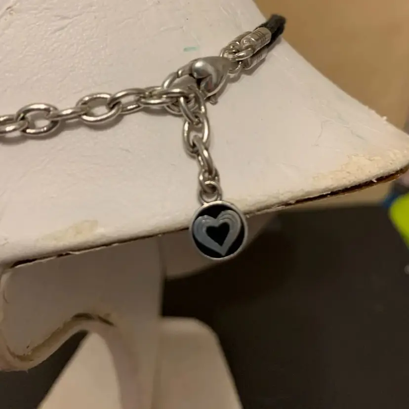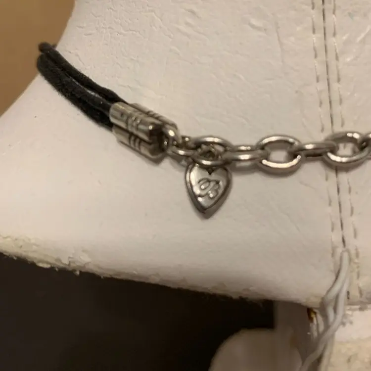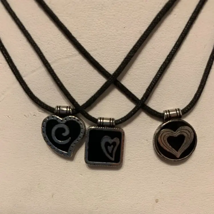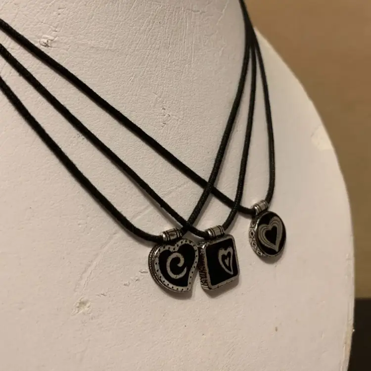 Unique Brighton piece. A little more edgy than most Three charms each hang in a black cord Charms all have different designs of hearts on them Brighton hang tag in place In very good condition Can be worn from 14-17 inches