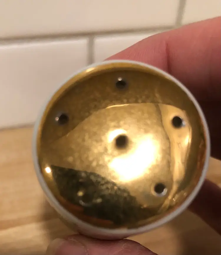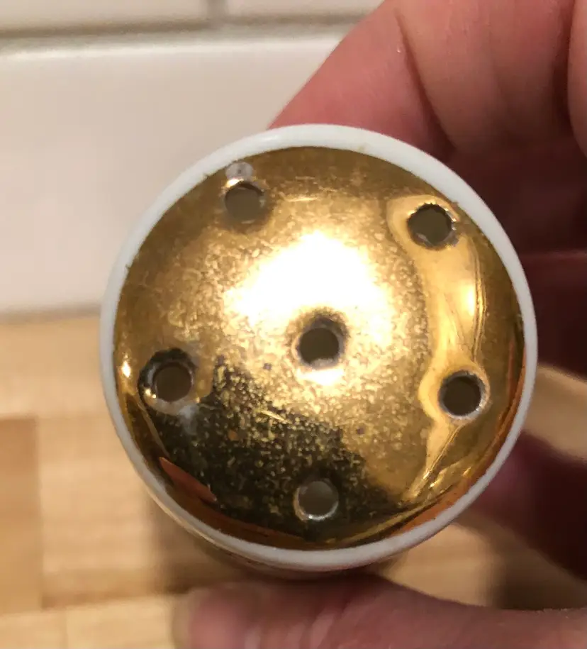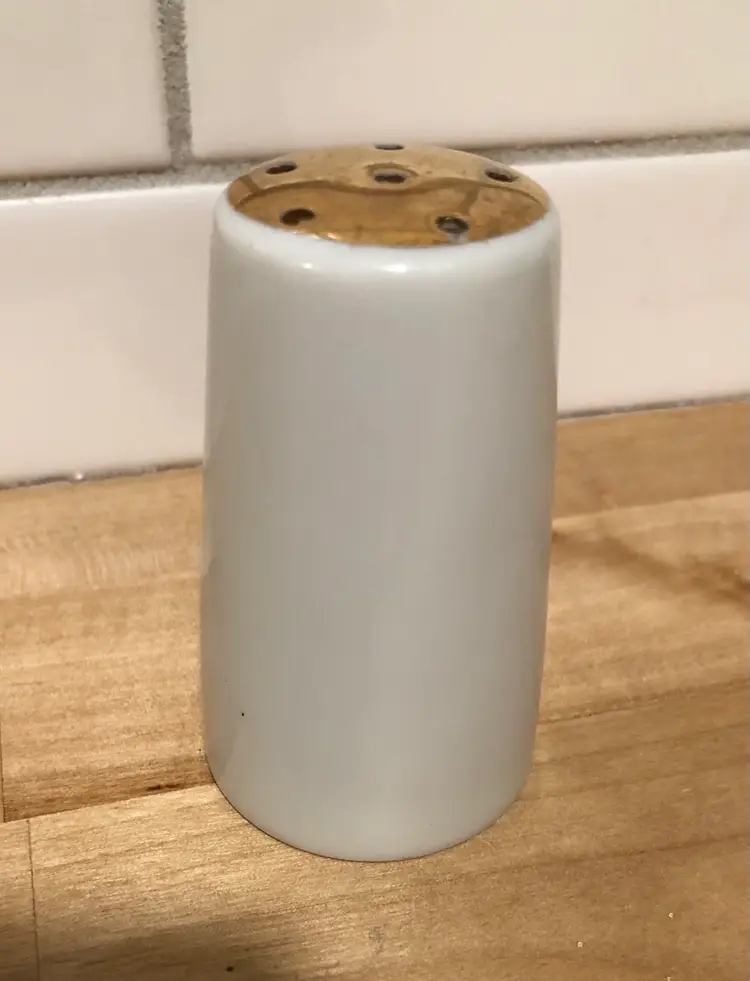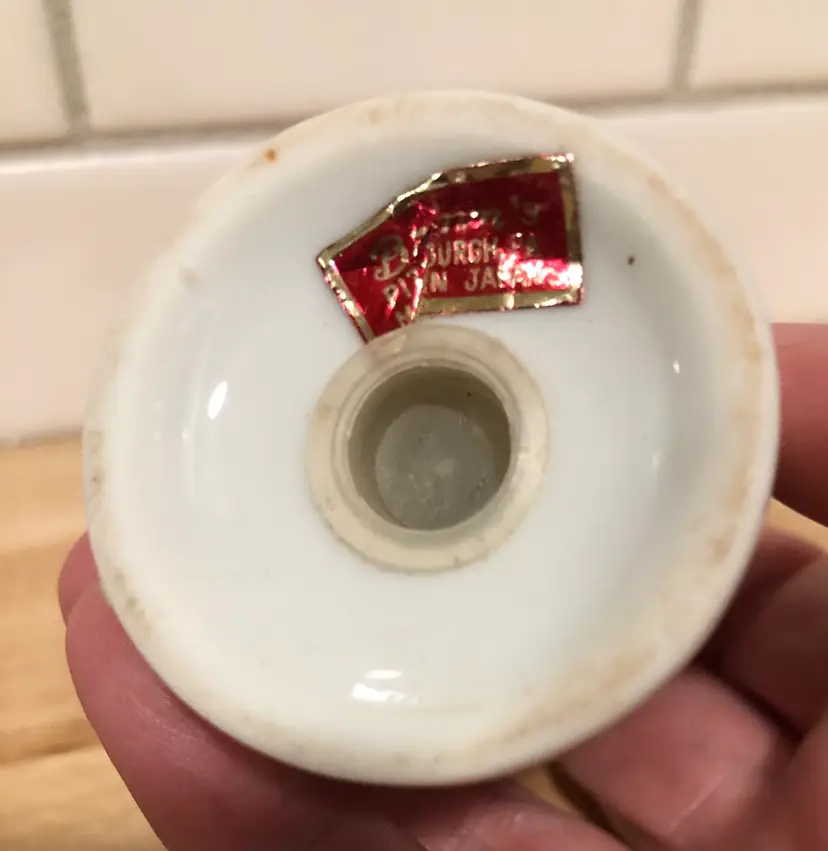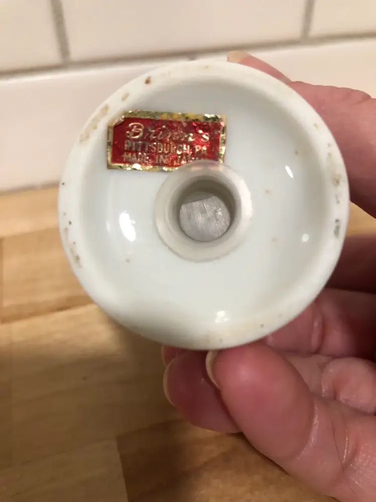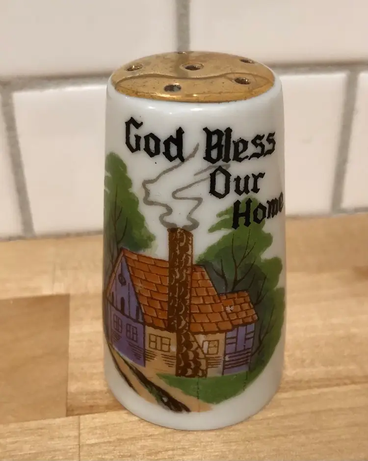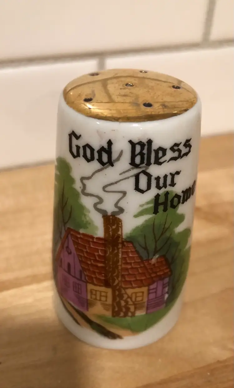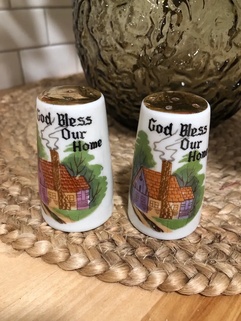 Lovely pair of vintage salt & pepper shakers made by Brinn’s China of Pittsburgh, PA. (Although the shakers were made in Japan.) “God Bless Our Home”, what a beautiful sentiment. This pair is in nice condition, both have have their rubber seals on the bottom, each has a makers label and there are no chips or cracks.