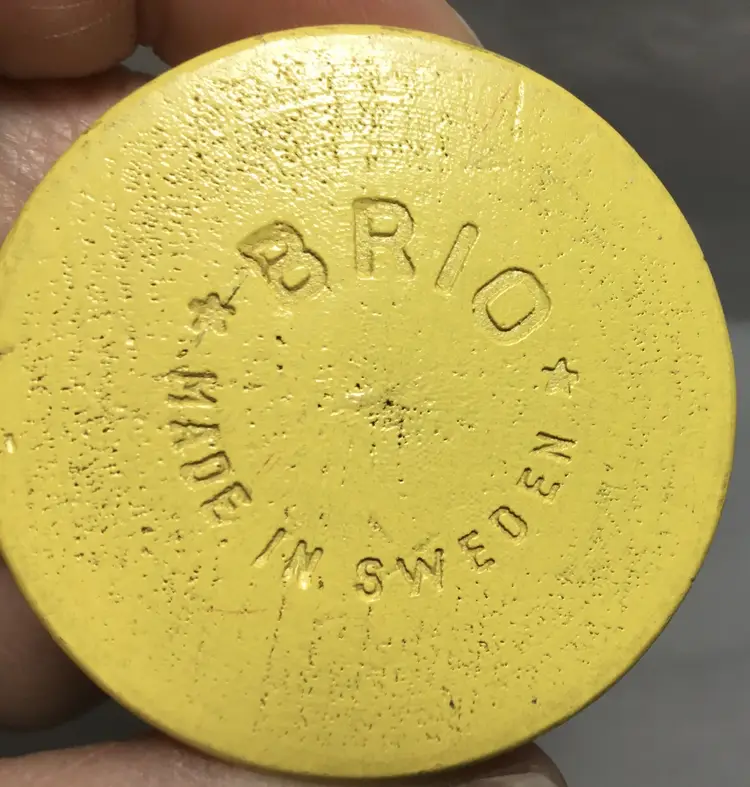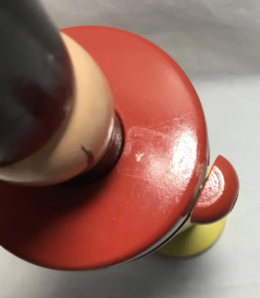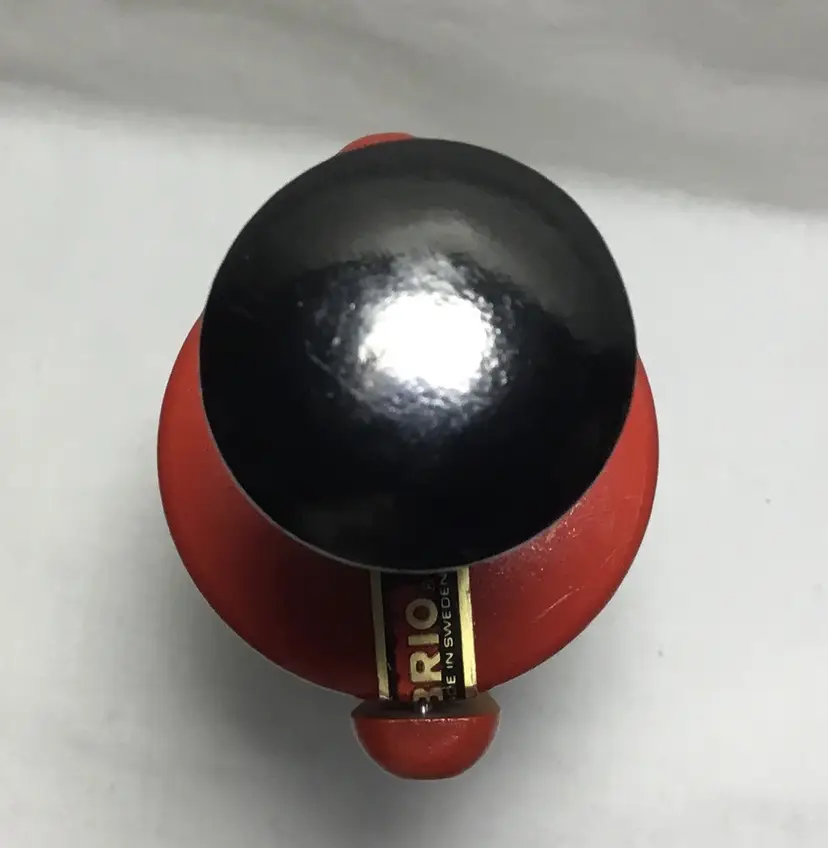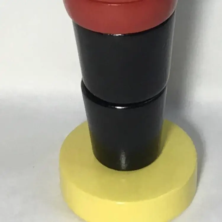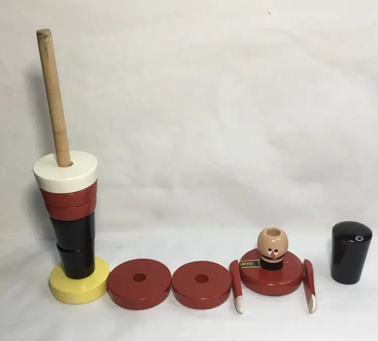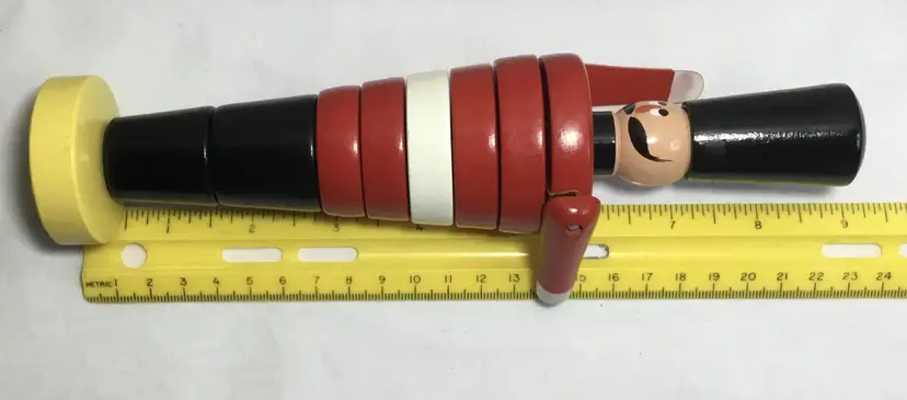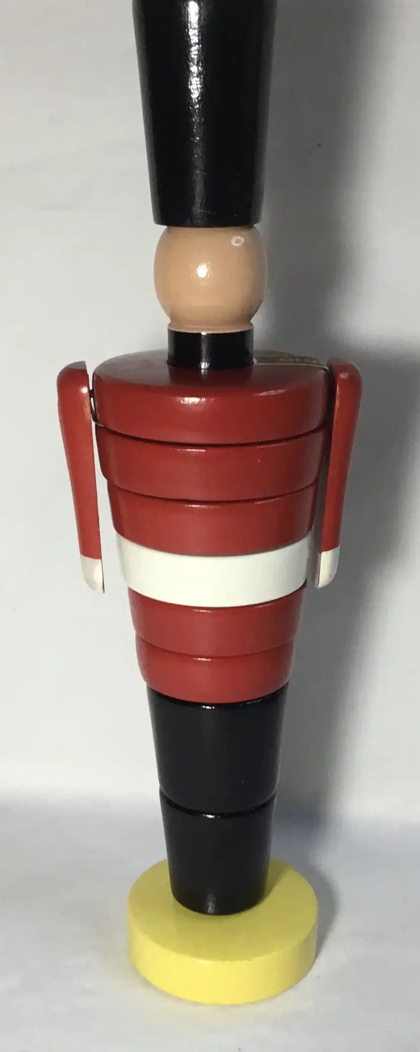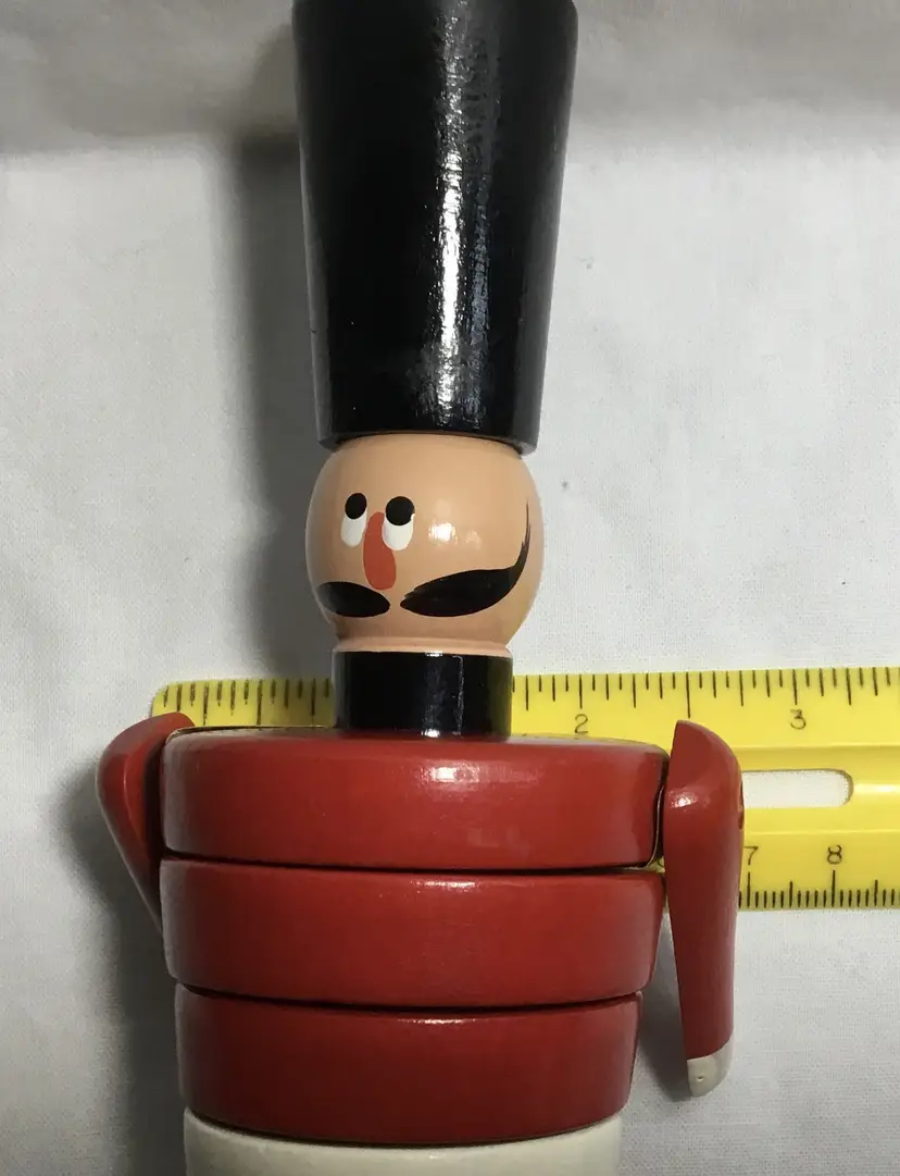 9 inches tall by 2.5 inches wide at shoulders, wooden stacking toy painted like an old-fashioned soldier. Tall black hat, round head with painted face with long mustache, red wooden discs for uniform jacket, white for belt, black discs for legs, on a round wooden stand. Wooden dowel goes through each disc piece and the head and hat, arms swing free on small nails or screws. Very nice condition, could easily be a home decor piece. Most likely made in the 1960s. Very good condition, one Brio sticker epaulet missing (See all photos.)