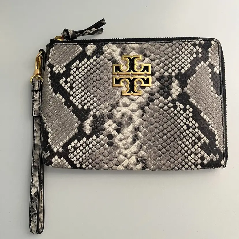 This Britten Large Leather Zip Pouch Wristlet in Natural Embossed Snake is in excellent condition. The exterior embossed snake leather and interior black fabric Tory lining are pristine. The wristlet strap is removable so you can carry as a clutch. 2 large slip pockets, and zipper change pocket 14k Gold Tone Hardware