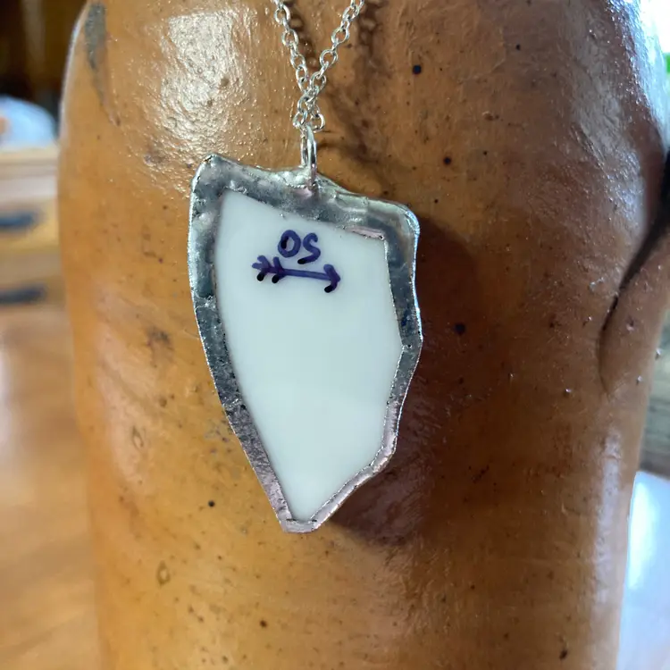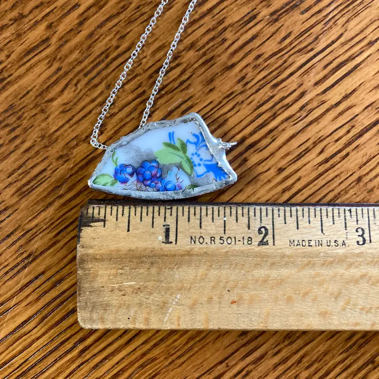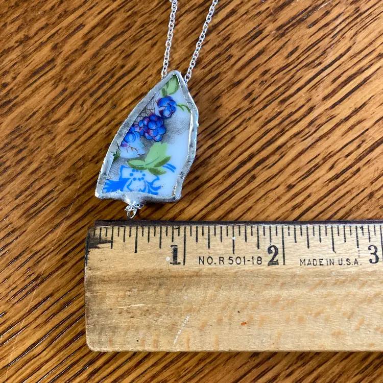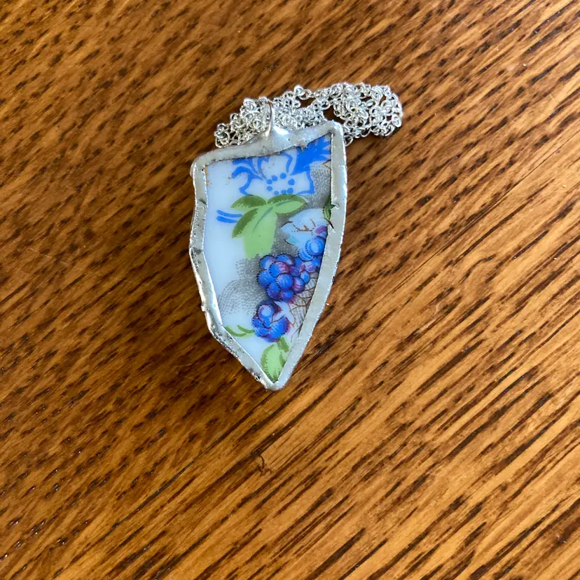 Handcrafted pendant featuring a charming blackberry fruit design. This piece is uniquely made, capturing the beauty of broken turned new. This 7/8 in x 1.5 pendant makes it the perfect everyday accessory. A one-of-a-kind statement piece that celebrates the art of handmade.