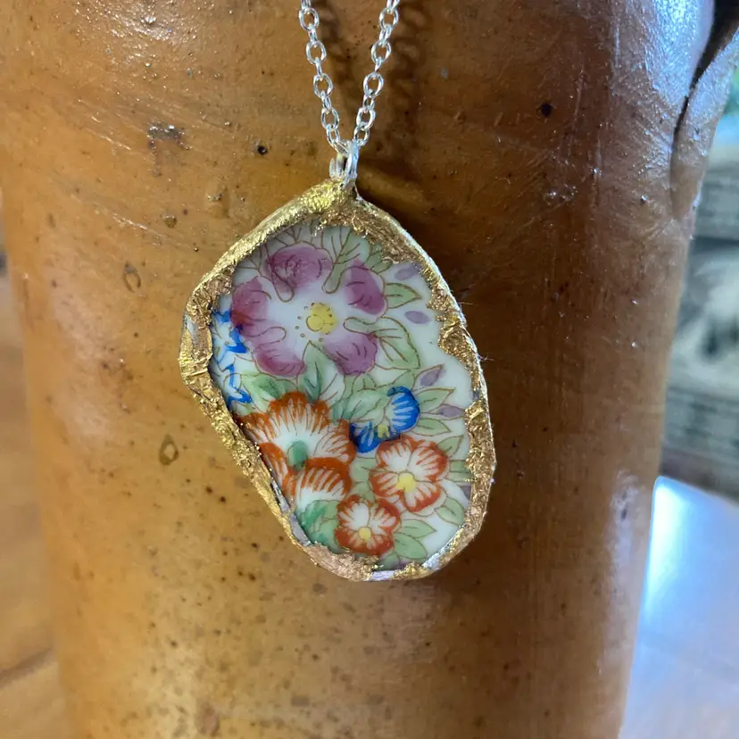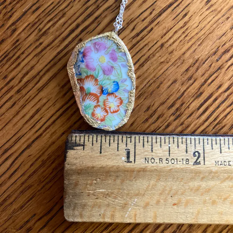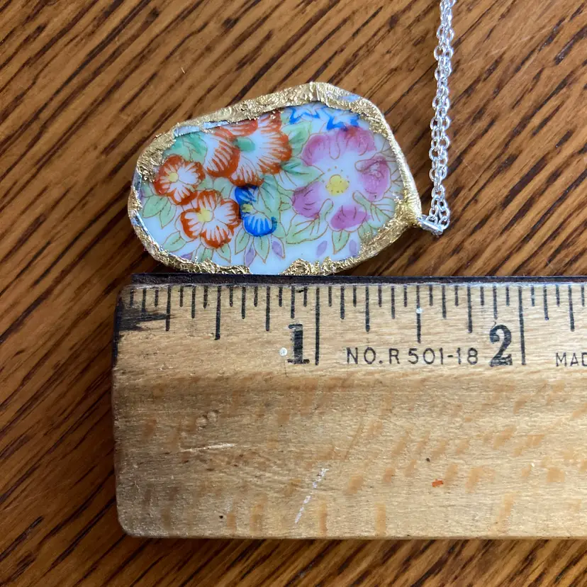 Wear a piece of artisan charm with this handcrafted ceramic pendant necklace. This broken pottery pendant features delicate floral details, creating a one-of-a-kind accessory that celebrates imperfection and craftsmanship. The 1" x 1.5" pendant is unique adding character and warmth to any outfit. Perfect for pottery lovers and those who appreciate handmade beauty.