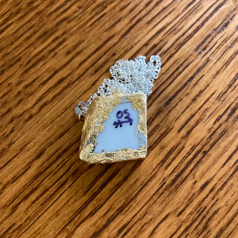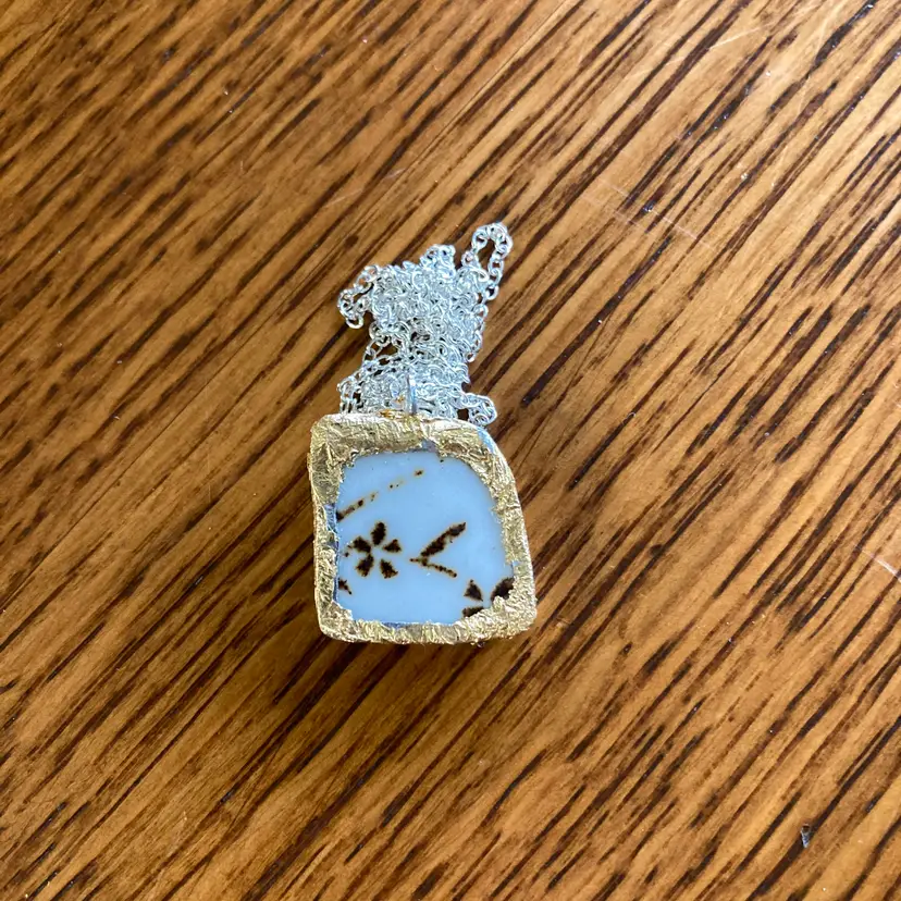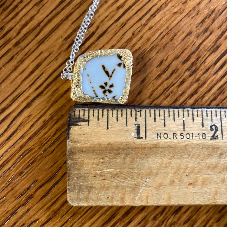 Wear a piece of artisan charm with this handcrafted pendant necklace featuring a delicate floral design on a Sierra Stoneware plate fragment. This broken pottery tile is carefully selected and transformed into a wearable treasure, making this necklace beautifully unique. The petite 3/4" pendant captures rustic elegance with a modern twist—perfect for pottery lovers and those who appreciate one-of-a-kind handmade jewelry. A sweet reminder that broken things can become something wonderful.