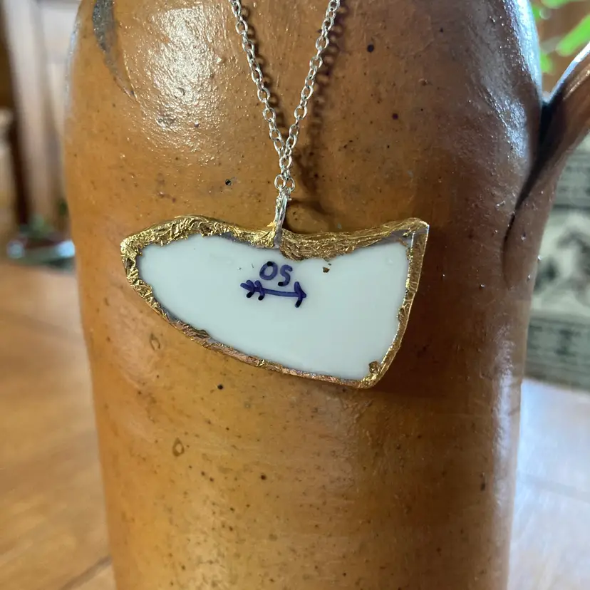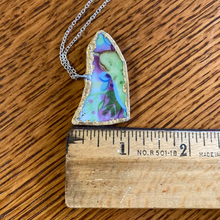 Wear a little piece of magic. This sweet pear pendant is hand crafted from a broken plate, lovingly reimagined into a tiny fruit treasure. At 1 5/8 in x 1 in, it's the perfect for everyday charm. No two are alike, your necklace is as unique as you are. A quirky, heartfelt accessory for anyone who loves handmade things with soul.