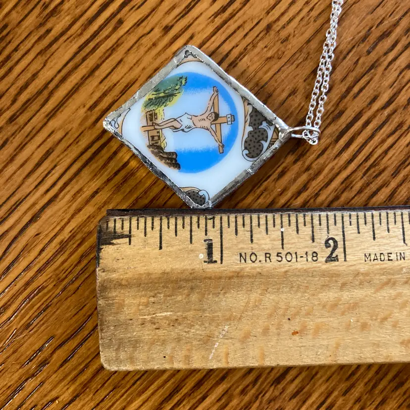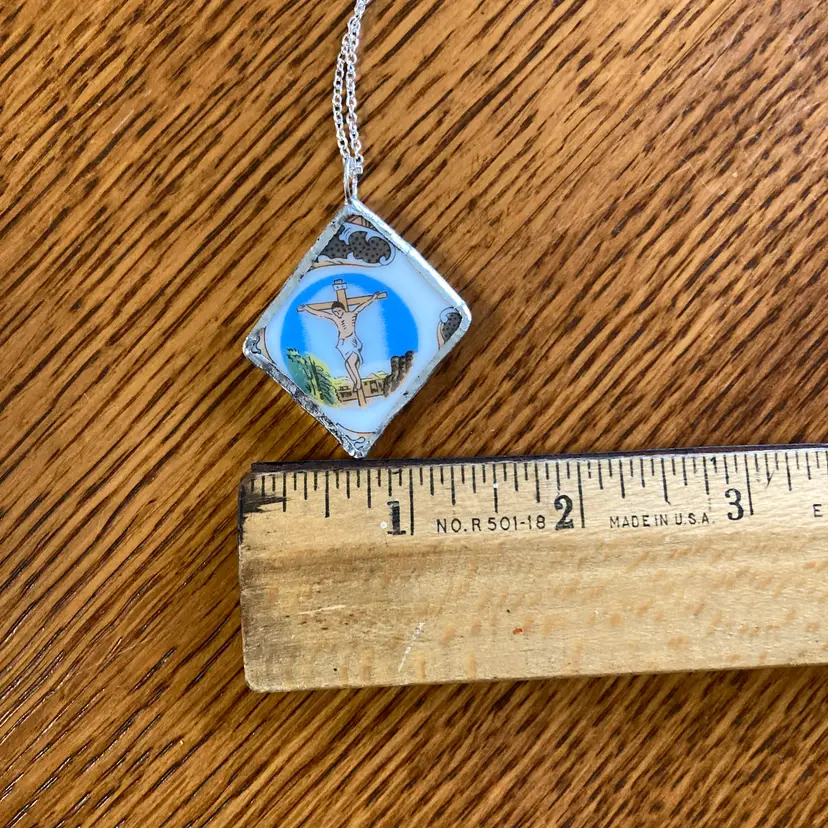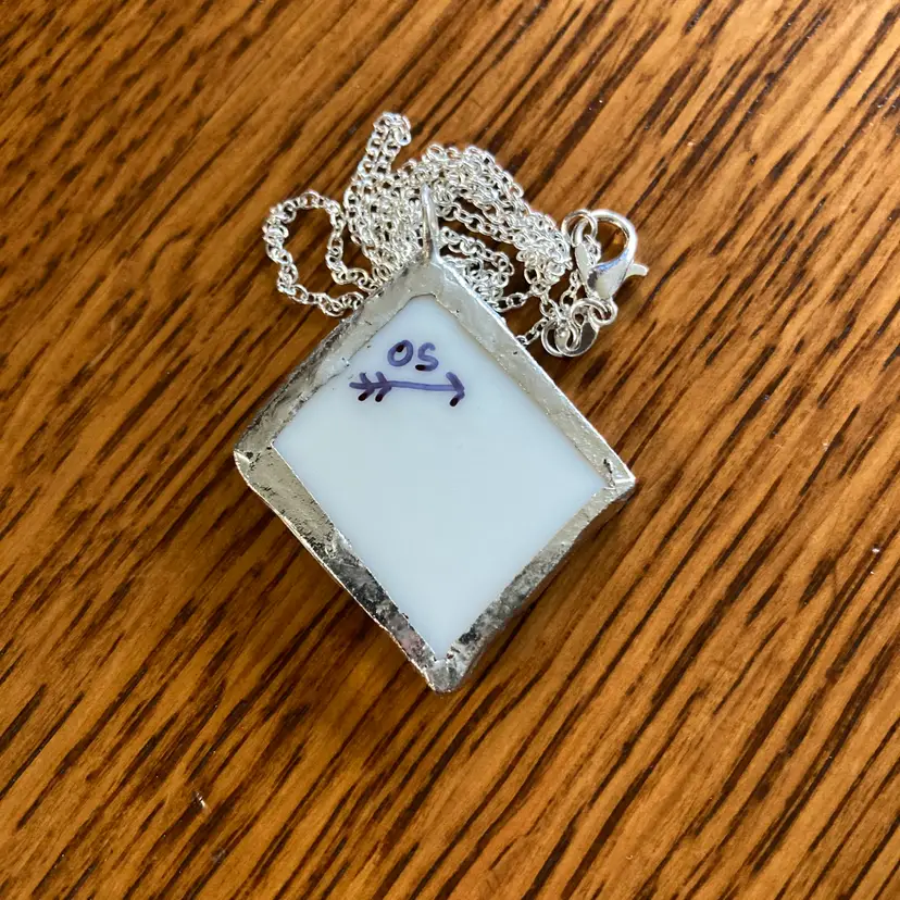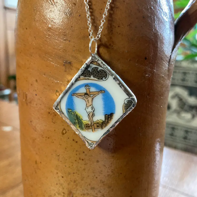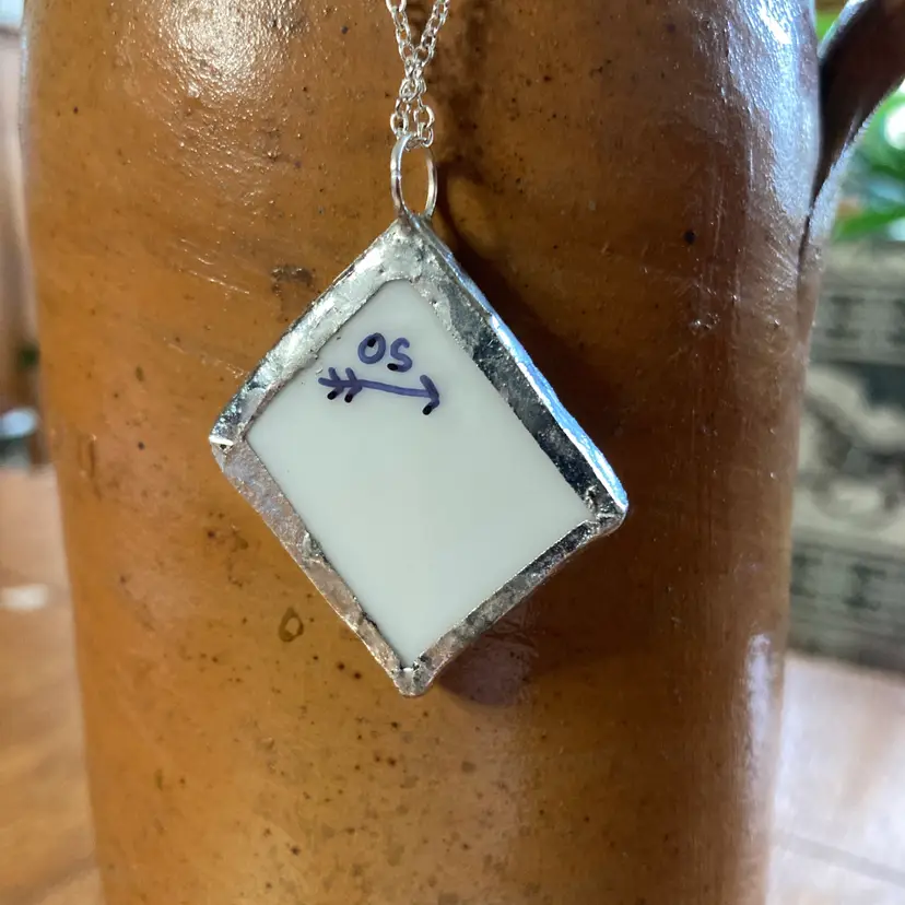 This handcrafted pendant celebrates the beauty of imperfection, featuring a broken plate piece mounted on a necklace. Each artisan-made piece is unique, with authentic ceramic fragments that tell their own story. Making it a meaningful accessory for wearers. Measuring 1 3/8 in x 1.5 in, the pendant is substantial enough to make a statement while remaining comfortable for daily wear. Perfect for those who appreciate one-of-a-kind, handmade jewelry with character and purpose.