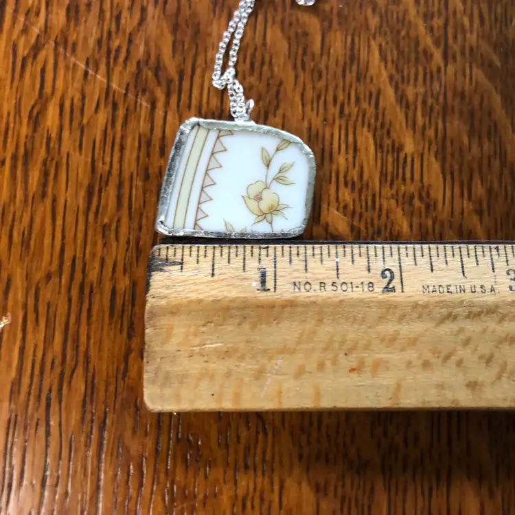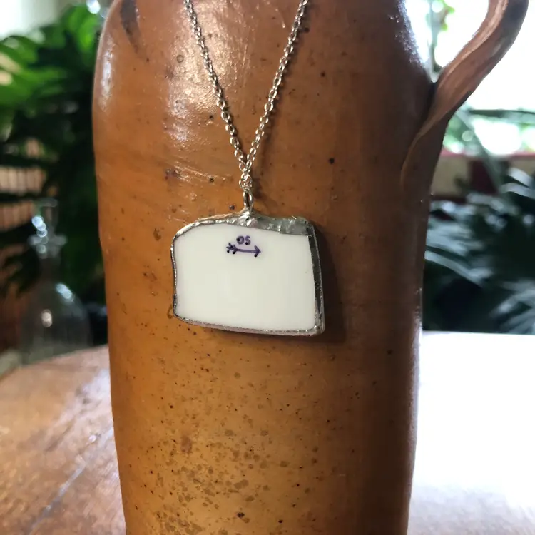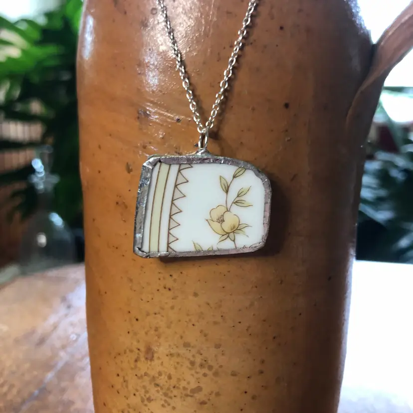 This playful pendant necklace showcases a unique piece of broken pottery from a Japanese rose garden plate, carefully handcrafted into a charming 1.25in by 1in treasure. Perfect for those who love jewelry with a story and a splash of garden whimsy. Carry a quirky slice of art and history wherever you go!