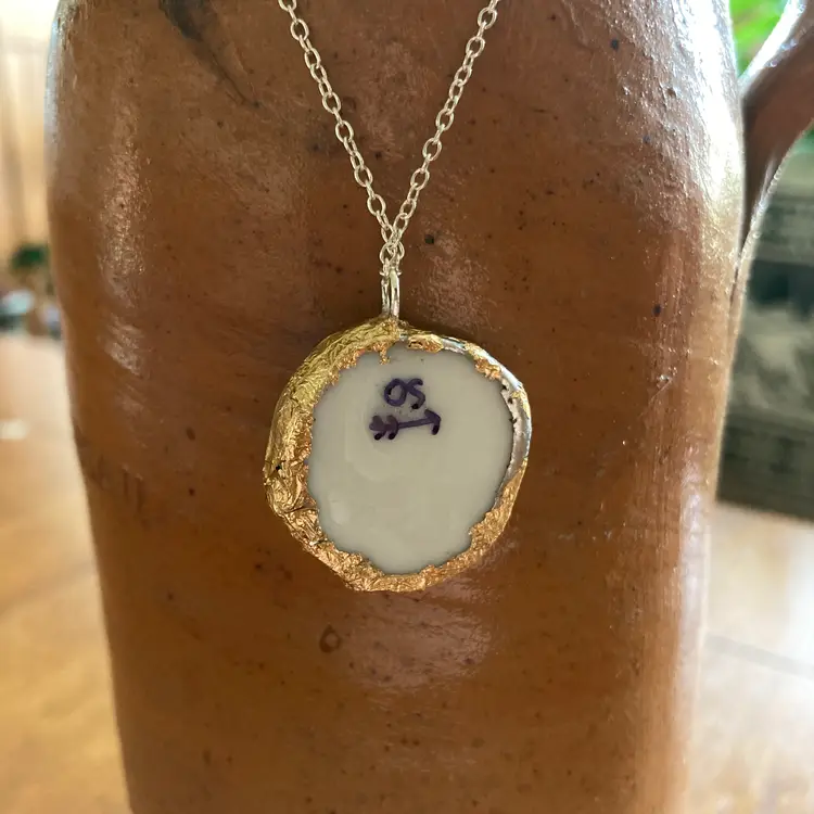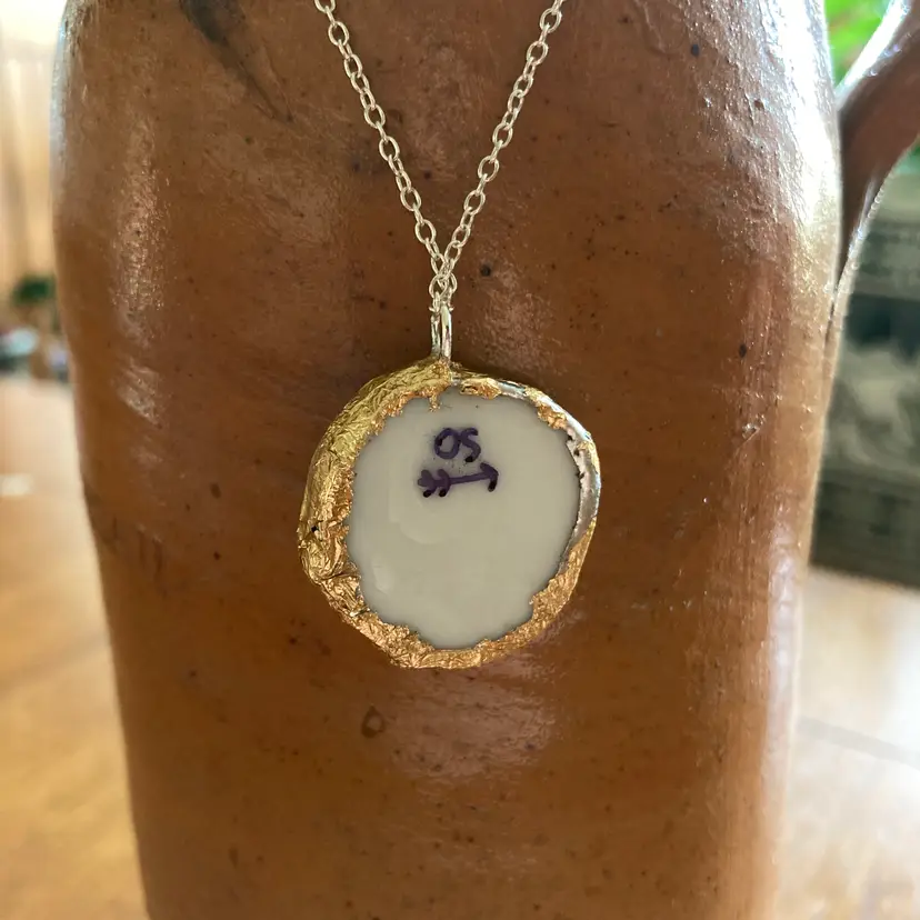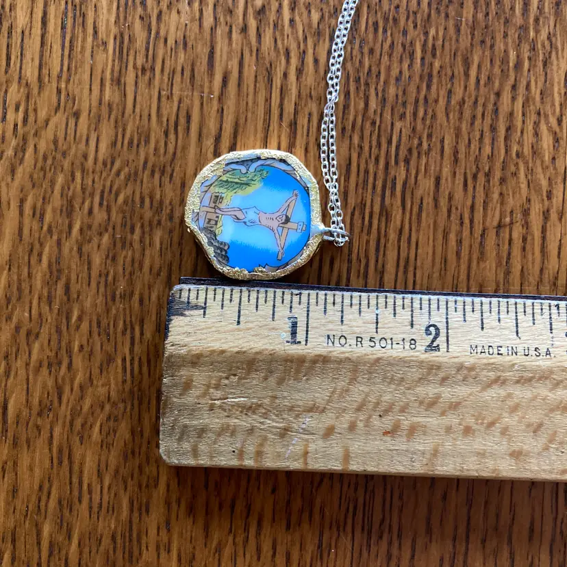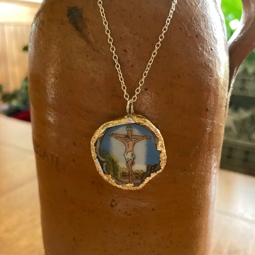 This distinctive pendant transforms broken fragments of a Christian religious plate into wearable art. Measuring 1" x 1", this handcrafted piece is a truly singular accessory. Suspended on an adjustable necklace, it serves as a tangible reminder of faith and the beauty found in restored imperfection.