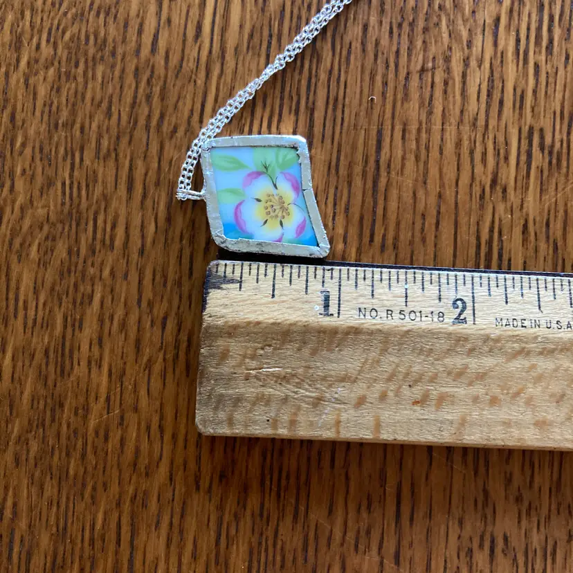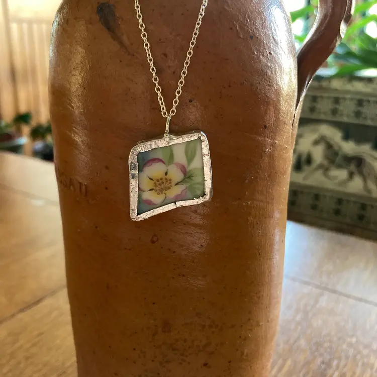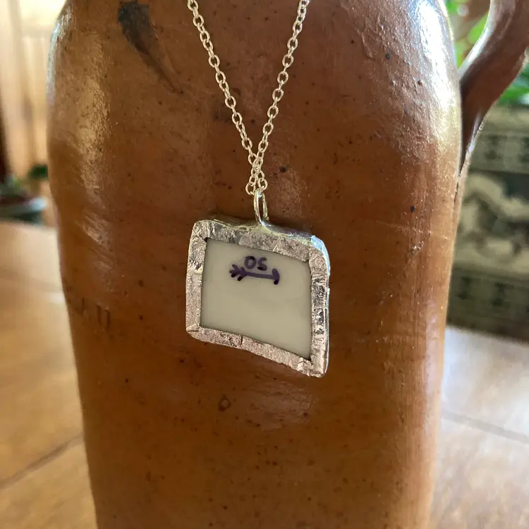 This handcrafted pendant features a fragment of a Christian religious plate. Measuring 1 inch by 7/8 inch, this one-of-a-kind piece celebrates the beauty found in imperfection and broken things made whole. Perfect for individuals seeking meaningful, wearable art that tells a story of restoration and grace.