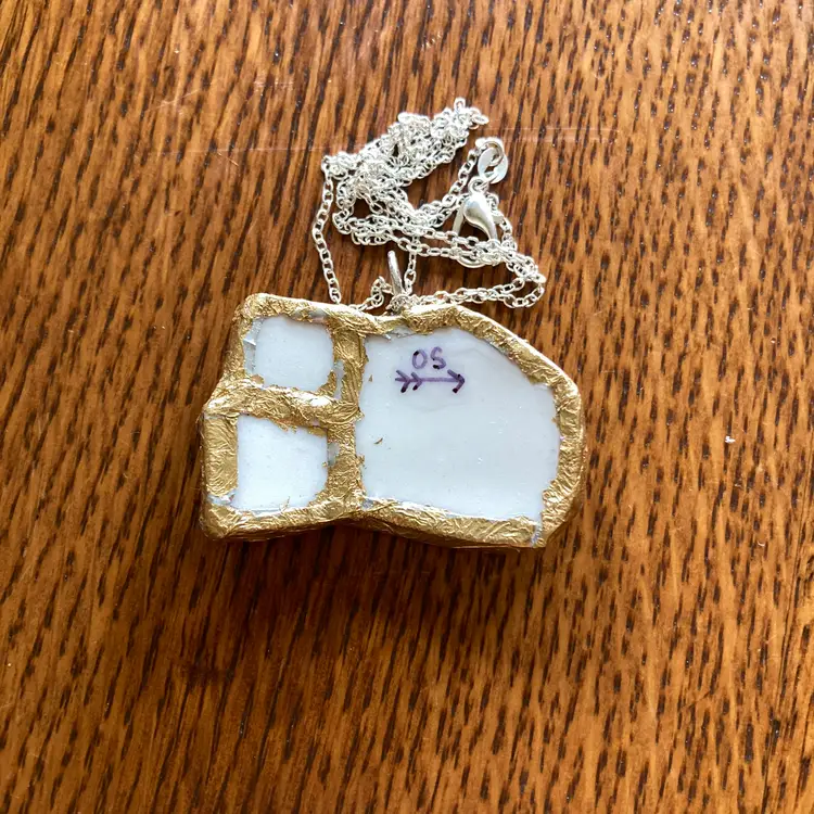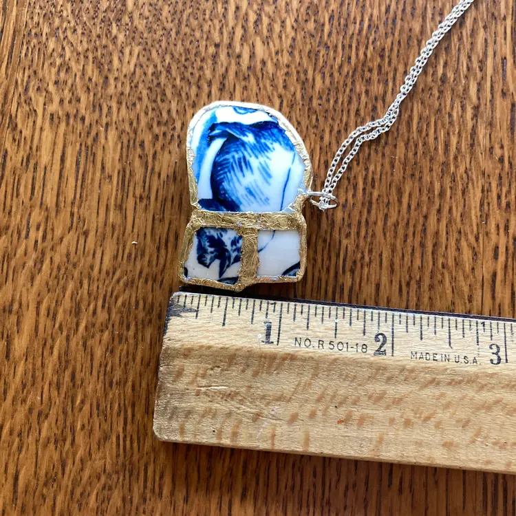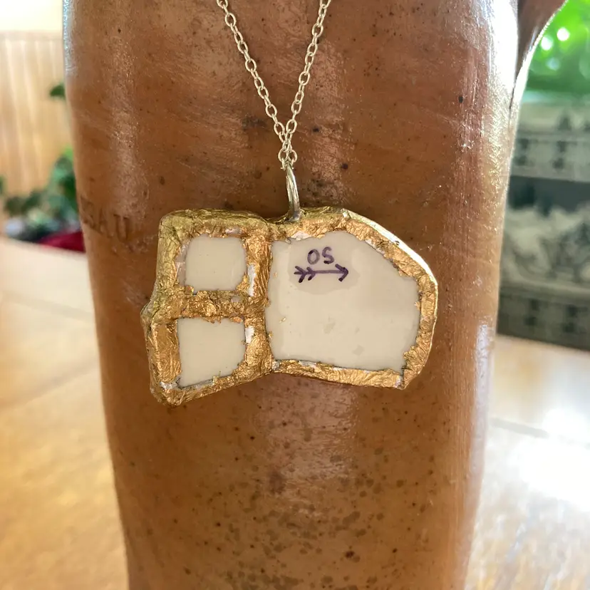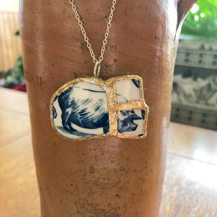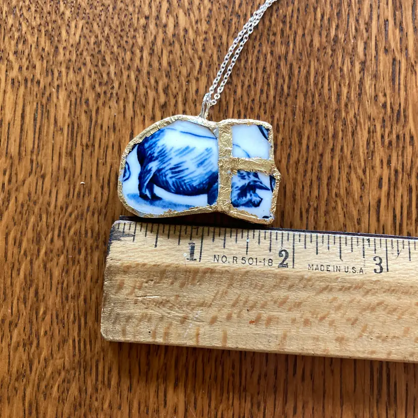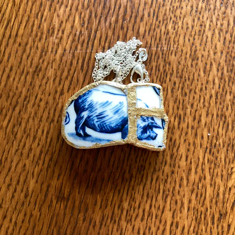 Wear a piece of art with this one-of-a-kind pig pendant. Salvaged from a discontinued Molly Hatch mug, this handcrafted necklace captures the whimsical charm of the original ceramic design. The reclaimed plate shard is carefully created with artistic detail. At 1.75 by 1 1/8 inches. Perfect for those who value sustainable craftsmanship and distinctive, conversation-starting jewelry.