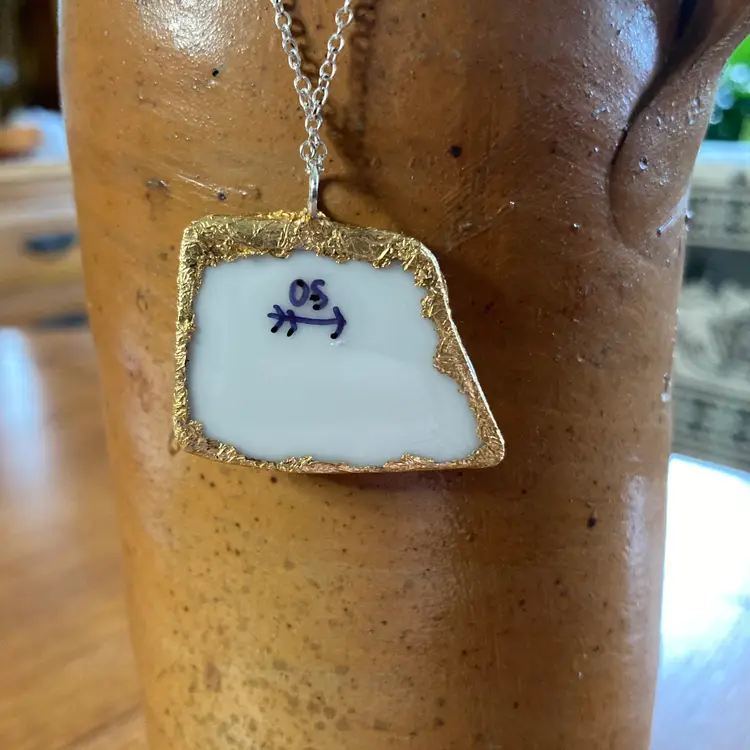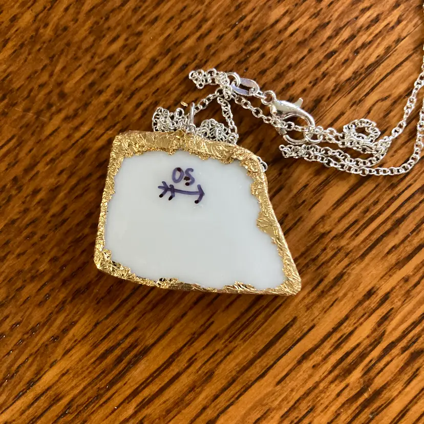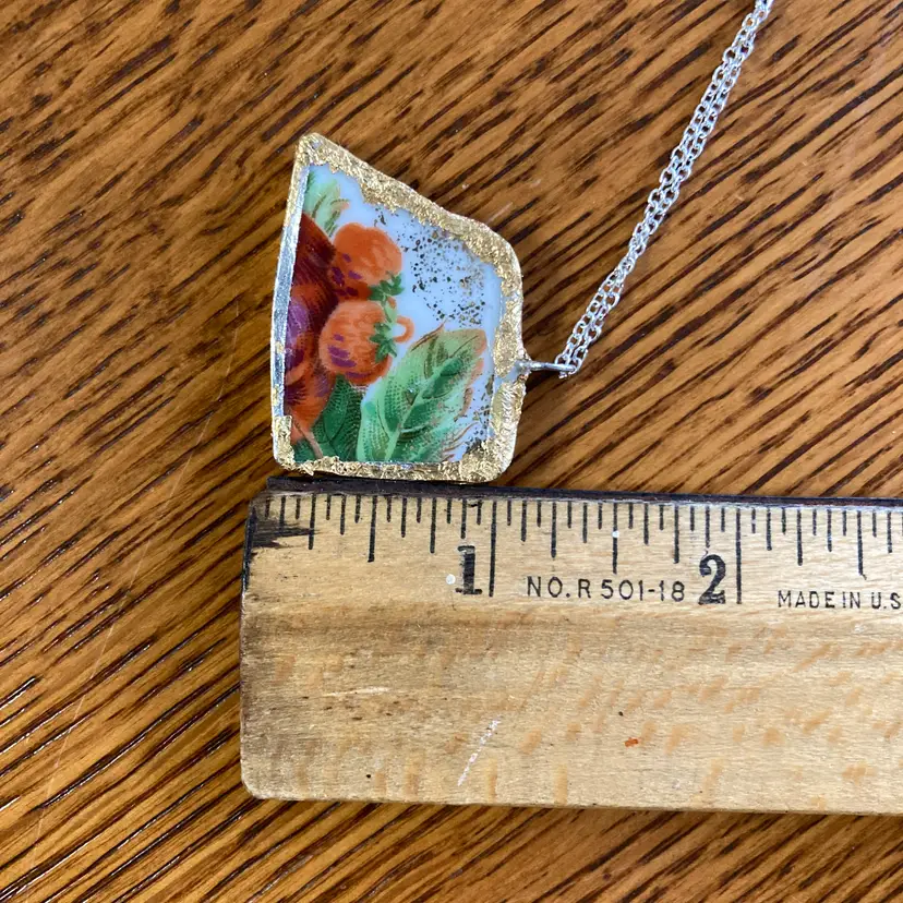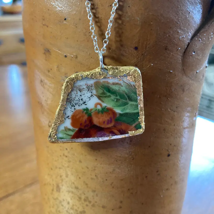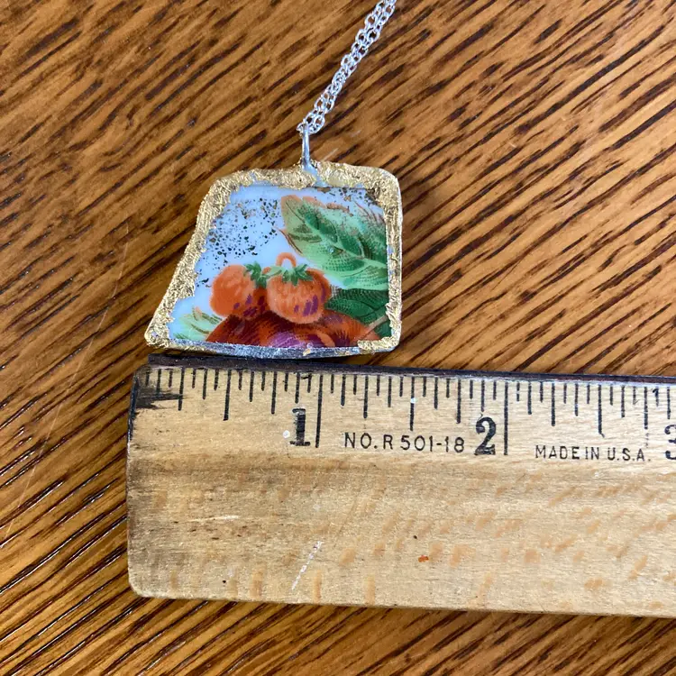 Sweet strawberry pendant crafted from a broken plate, handmade into a delightful 1 3/8" x 1" necklace. This piece is uniquely one-of-a-kind, celebrating the beauty found in broken. Perfect for fruit lovers, pottery collectors, and anyone drawn to quirky, handmade jewelry with character. A wearable work of art that tells a story.