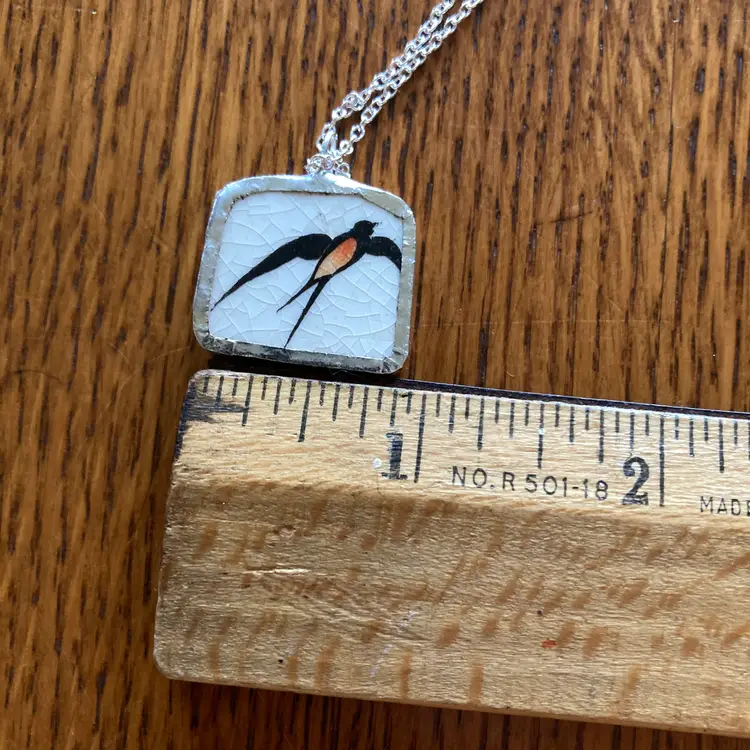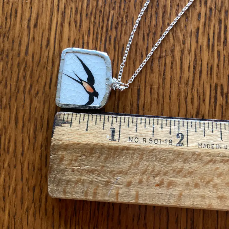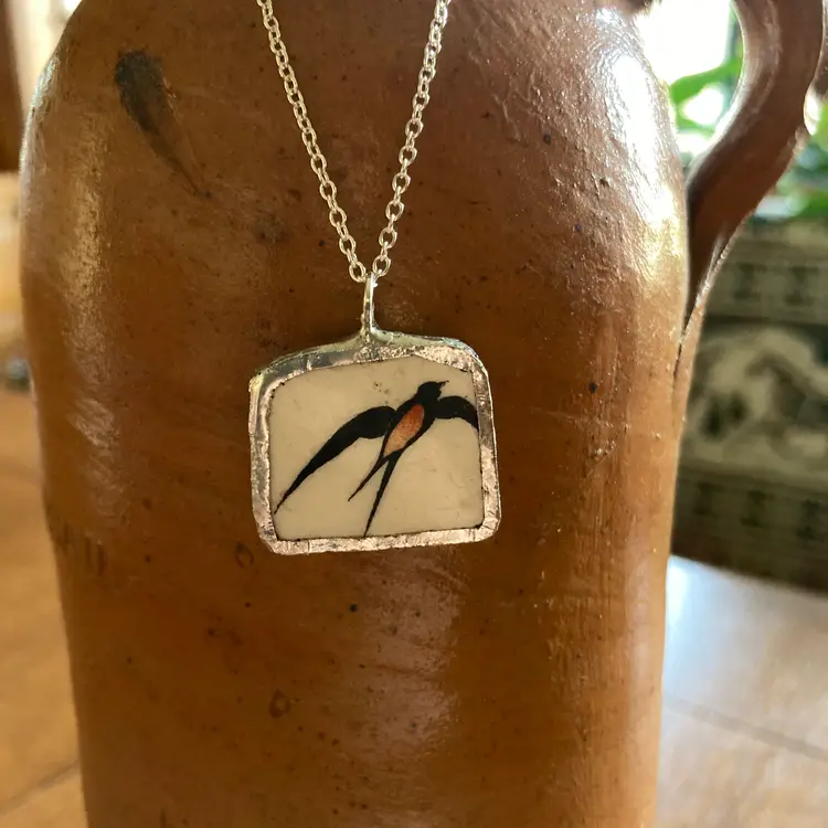 Drift into wonder with this enchanting handcrafted swallow pendant, where broken pottery fragments are lovingly reimagined into wearable art. This piece captures the delicate grace of a bird in flight. The artisan-made necklace whispers stories of transformation—where imperfection becomes beauty, and scattered pieces find new purpose close to your heart. A gentle reminder that broken things can soar