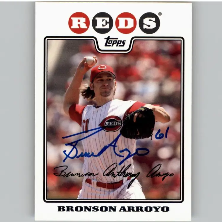 Authentic 2008 Topps baseball card featuring Bronson Arroyo of the Cincinnati Reds, complete with his signature. A must-have for Reds enthusiasts and collectors of baseball memorabilia. Every purchase supports Signatures For Soldiers and their mission to assist homeless and disabled veterans.