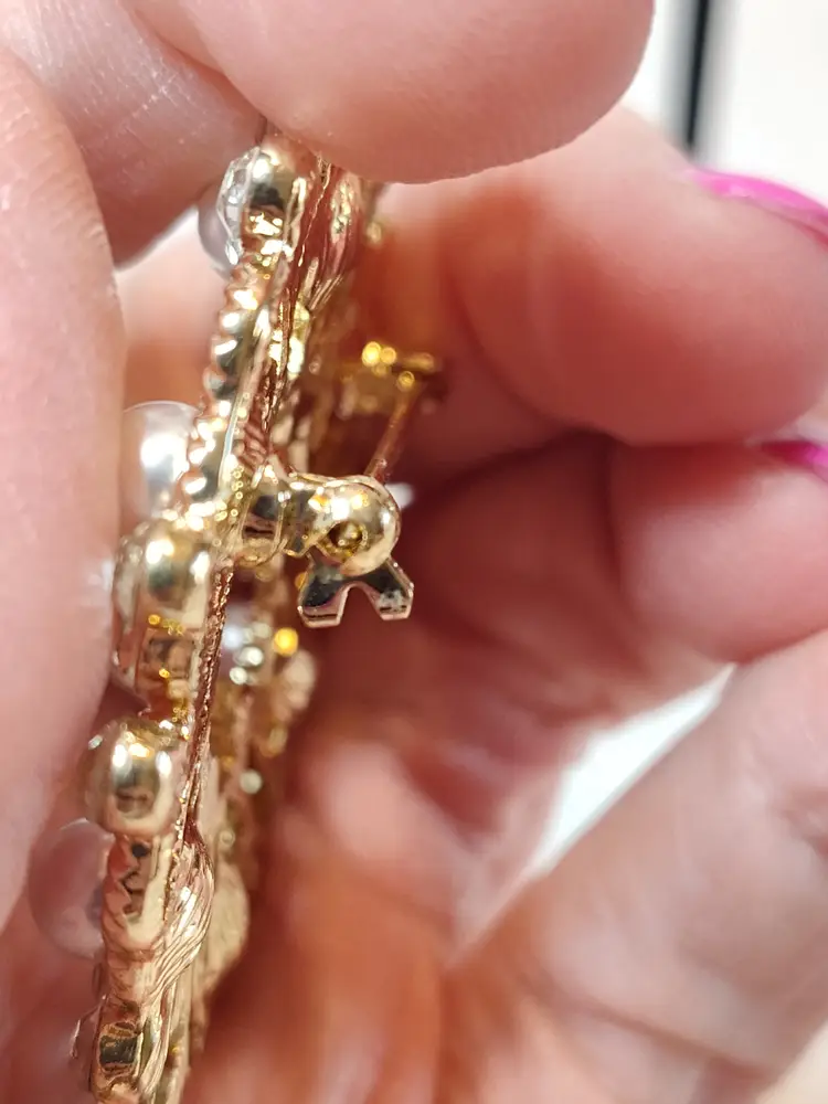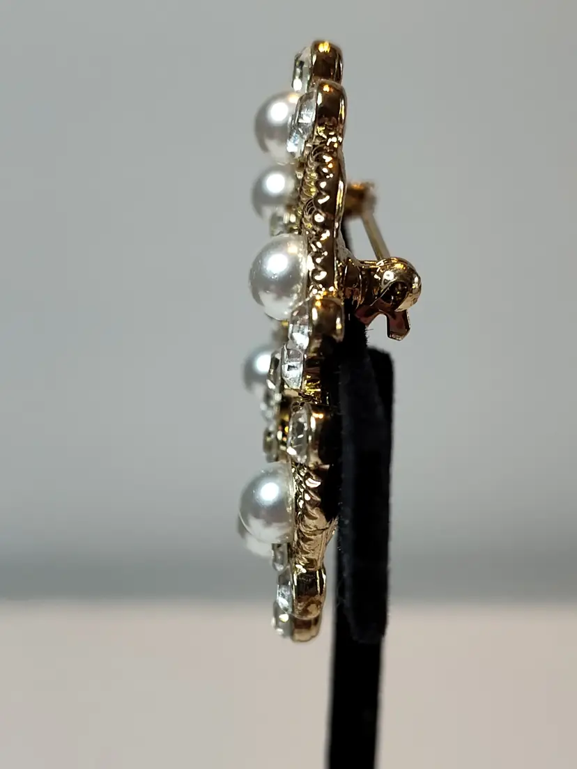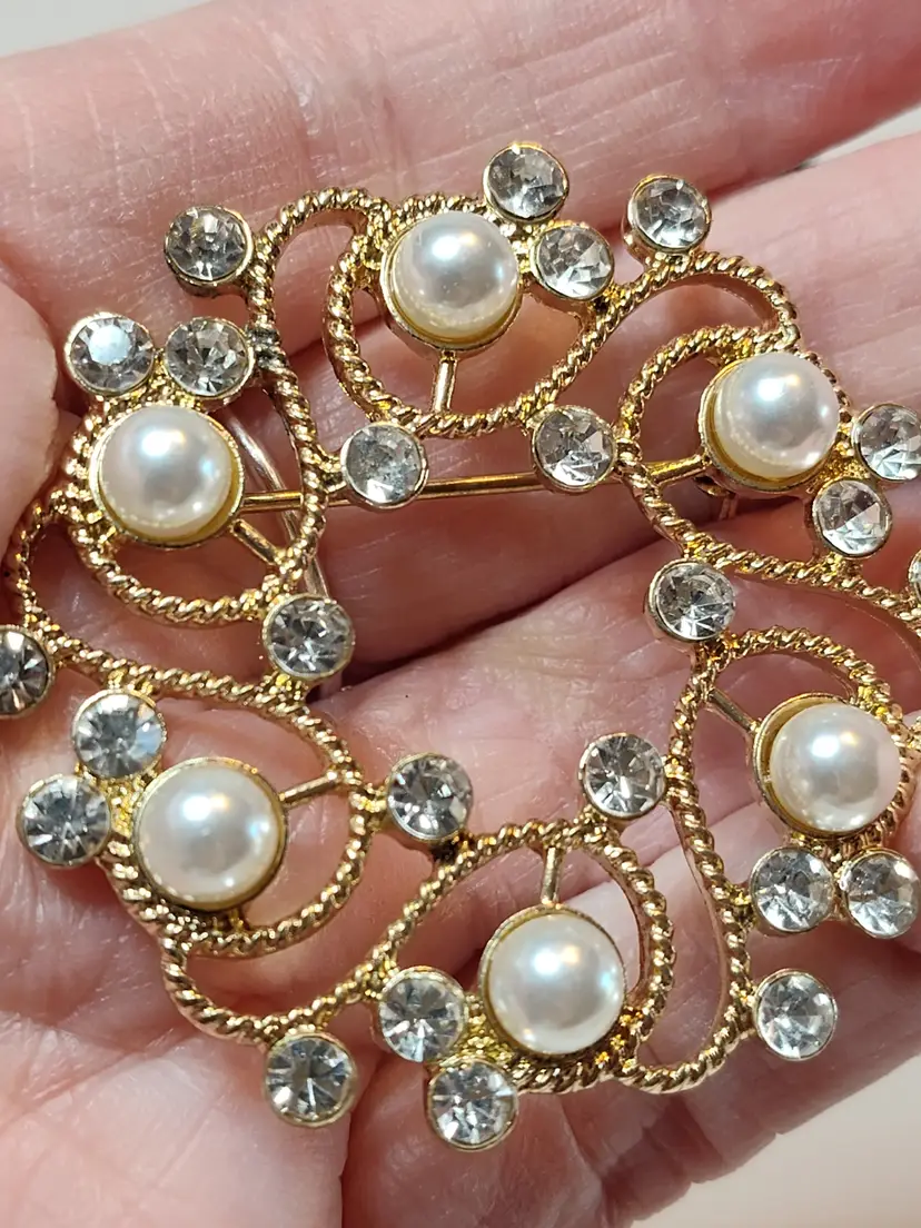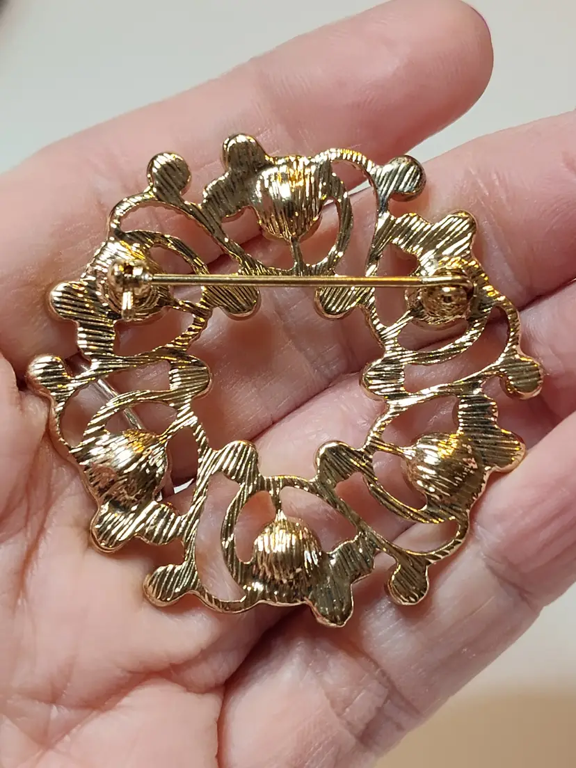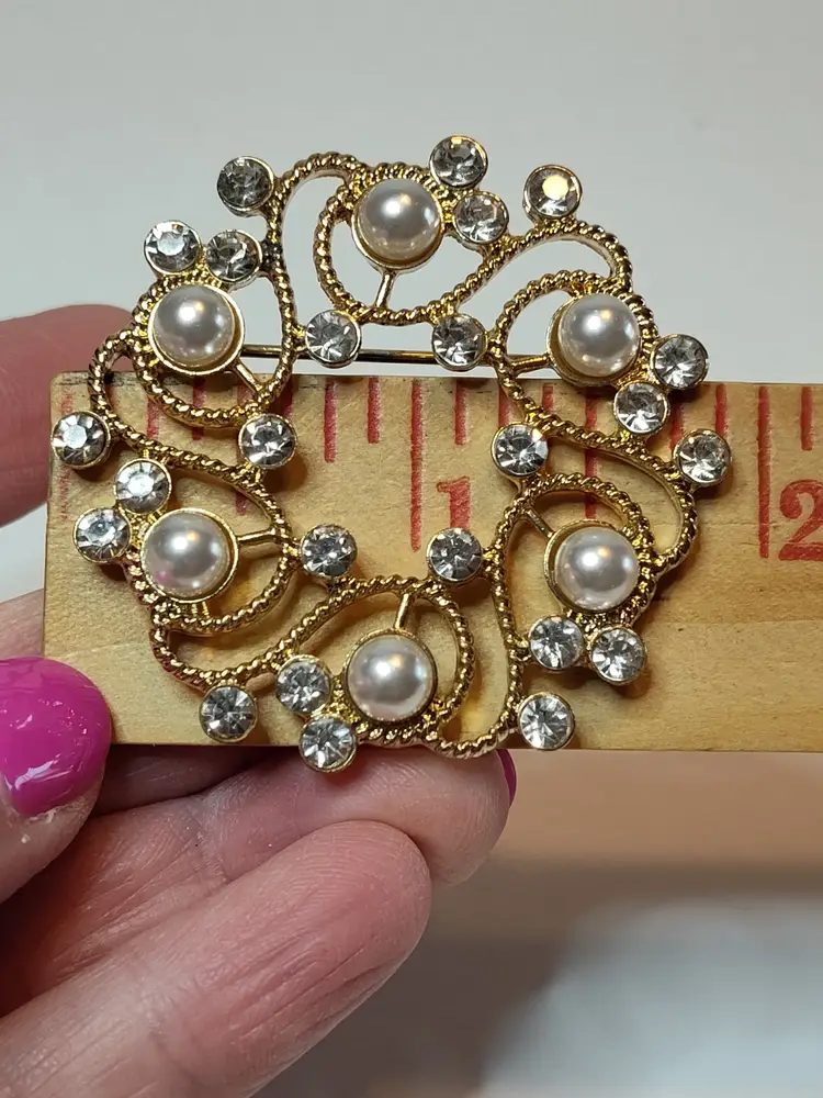 2" gold tone faux pearl & rhinestone wreath brooch- no mark