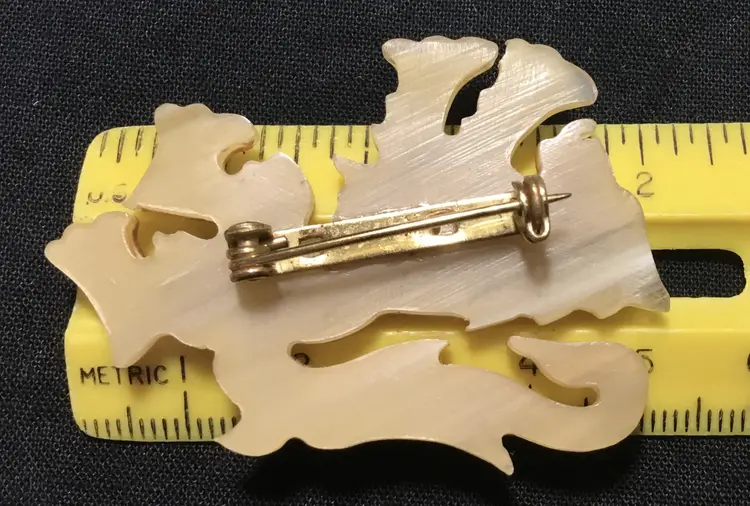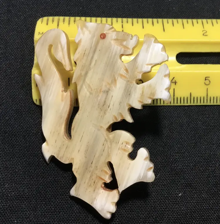 2 inches tall by 1.5 inches wide, carved horn figure of rampant lion. Translucent beige and white figure standing on hind legs, front paws reaching out, tongue sticking out. Orange tinted or painted eye, pale orange highlights on carved fur details. Safety clasp on back.