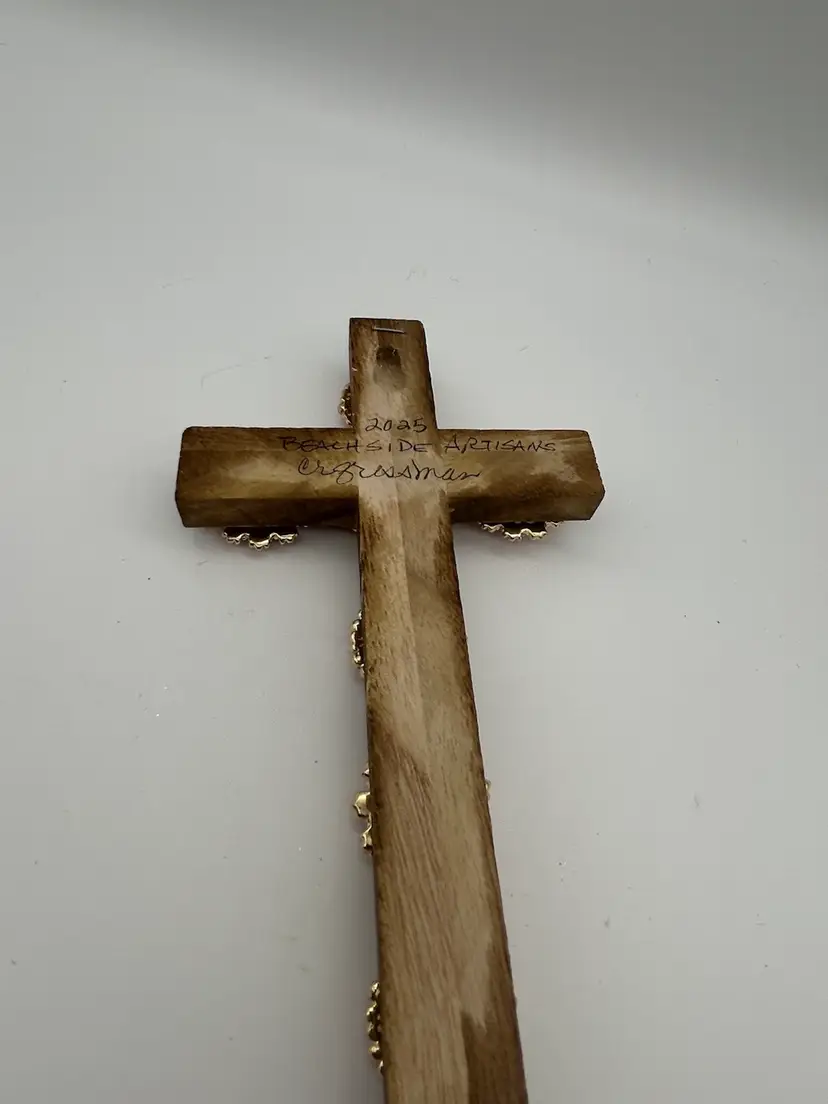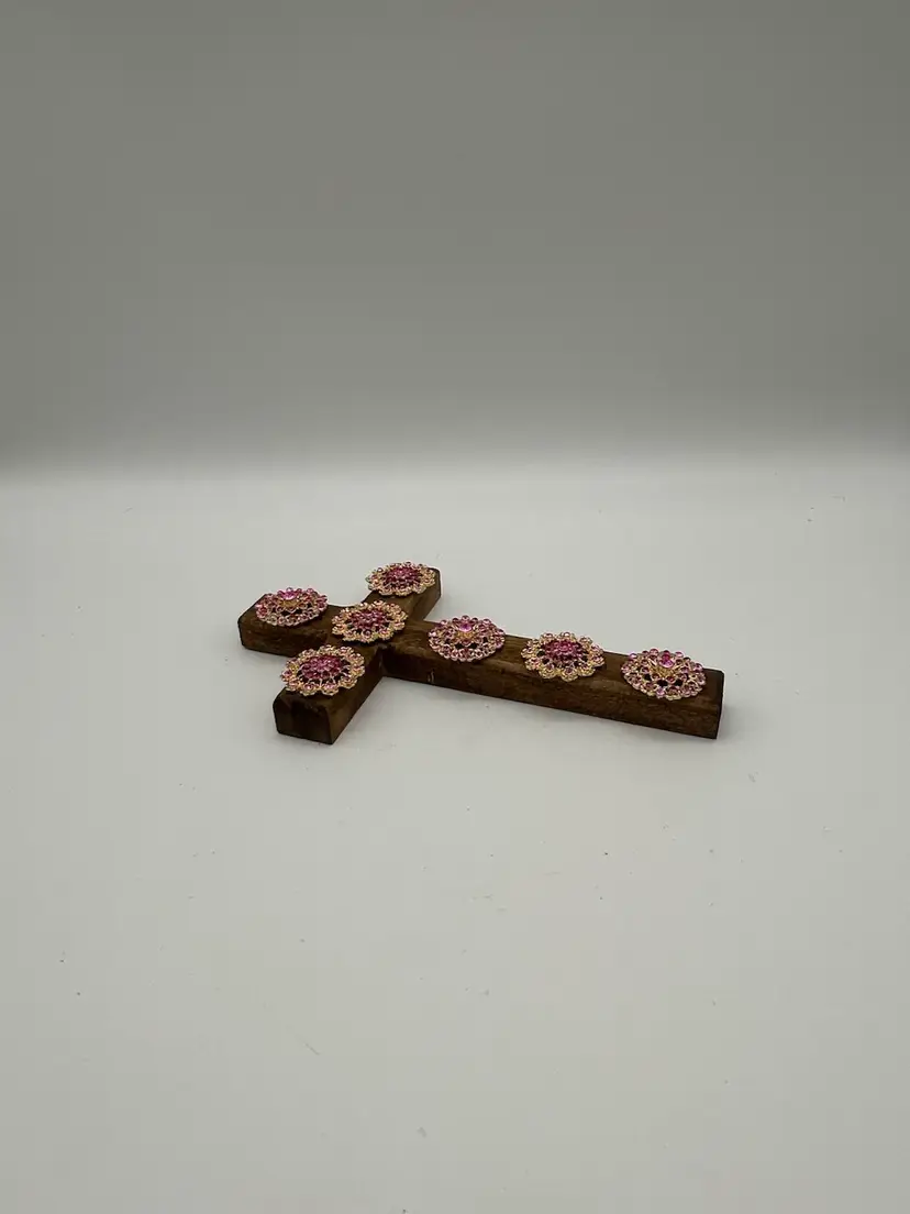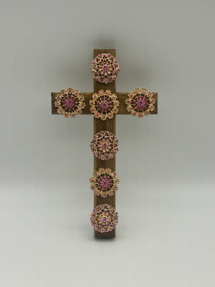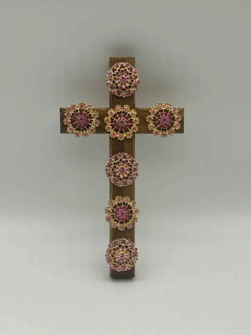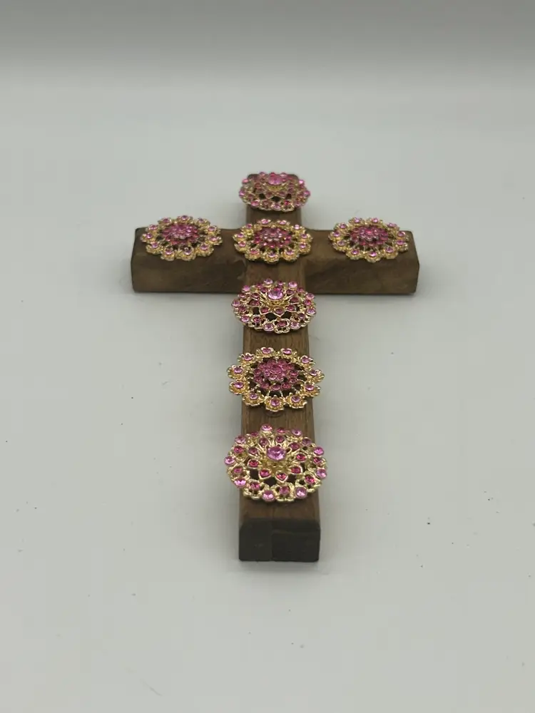 This wooden cross has been stained and then embellished with brooches that I have repurposed. It measures approximately 8” tall and 4 1/2” wide. I do take special order requests. Please message me if you would like to choose different colors of brooches.