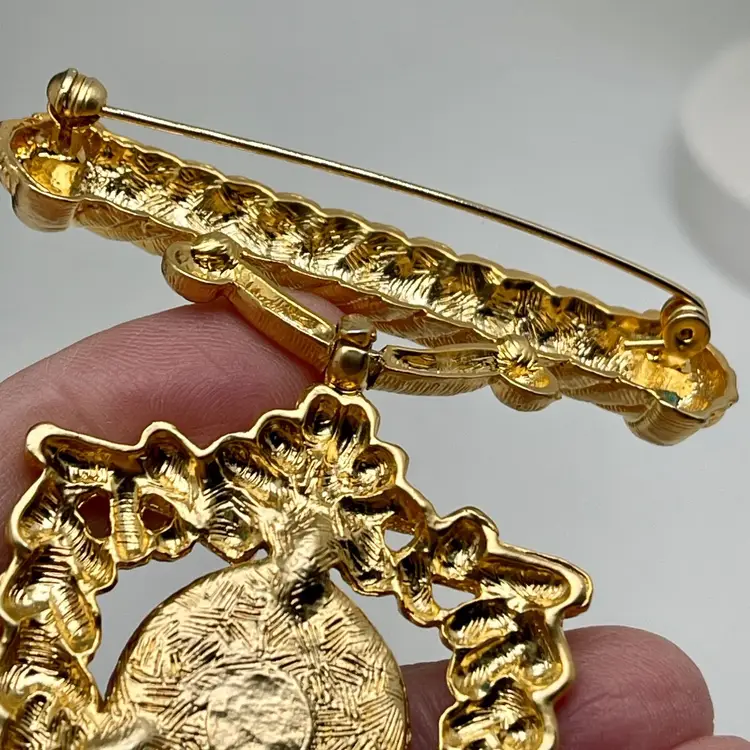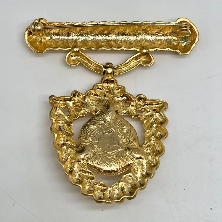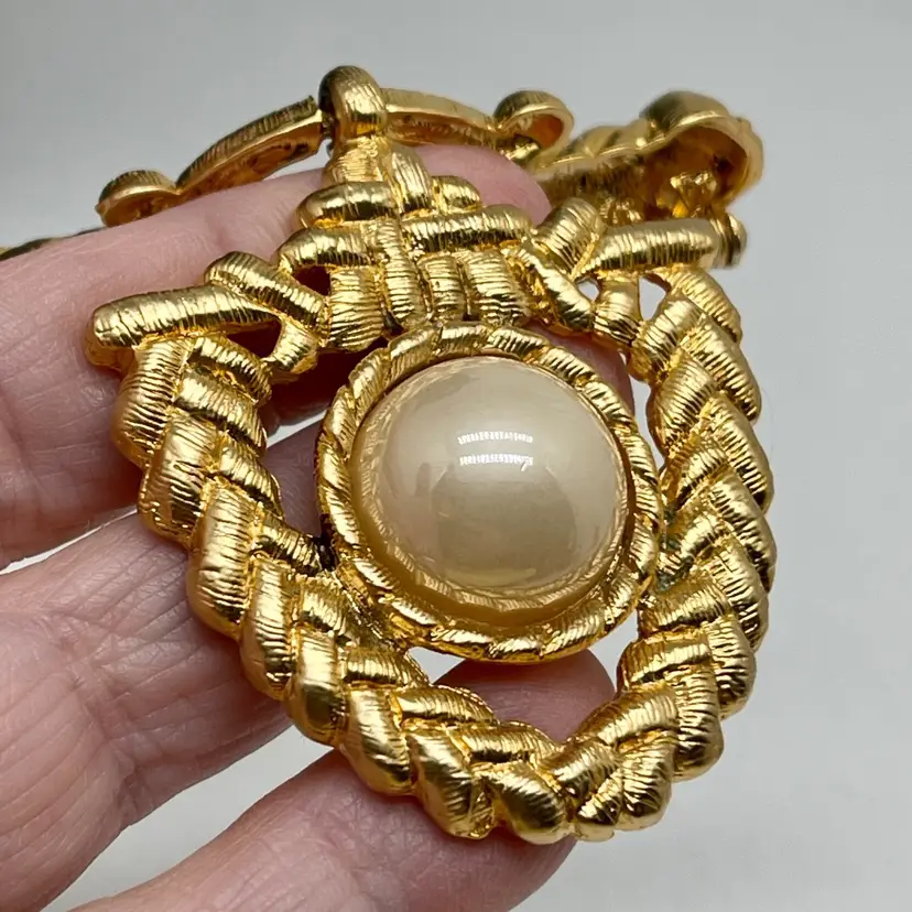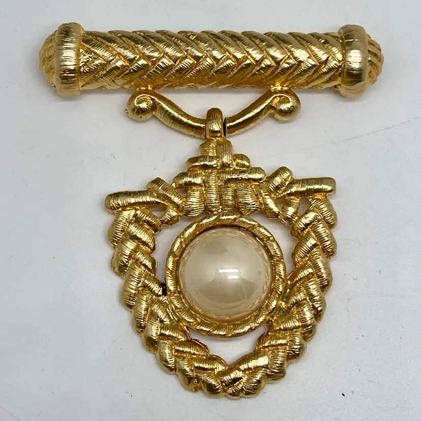 This gold-tone brooch is designed after military metals. It's a bar with a hinged braided shield with a large faux pearl cabochon. It's 1.75" long. Vintage from the 1980s. Several high-end designer houses used a similar design. Perfect for a jacket or coat lapel!