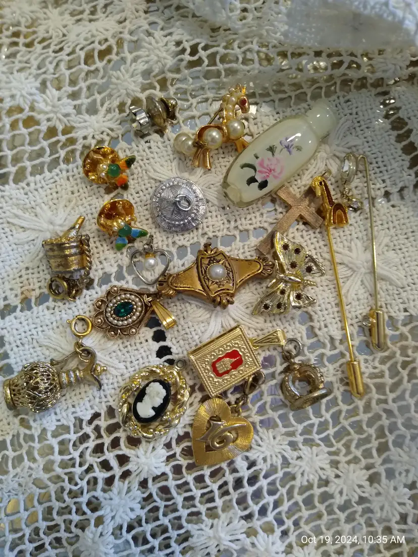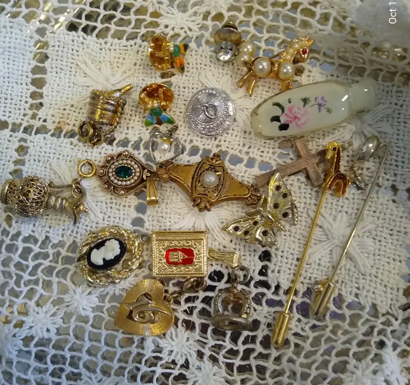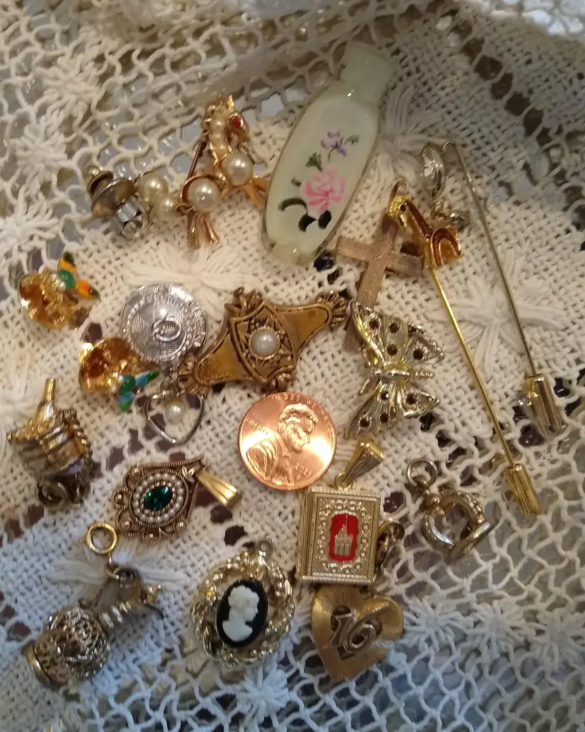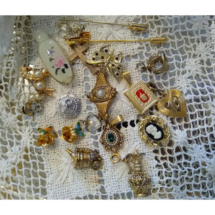 A delightful assortment of tiny vintage brooches, pins, charms and pendants featuring floral designs, cameos, and whimsical charms. Perfect for adding a touch of nostalgia to any outfit. In good pre-owned condition.