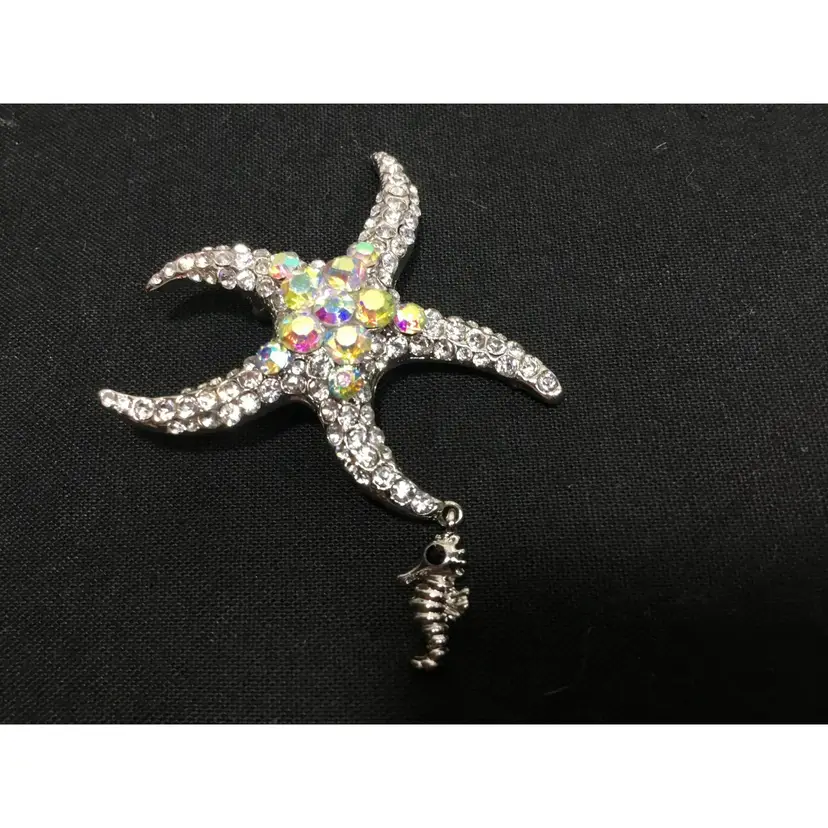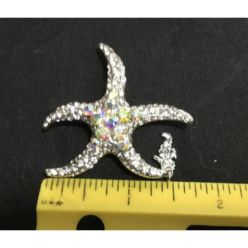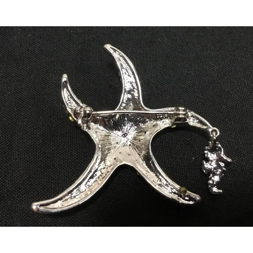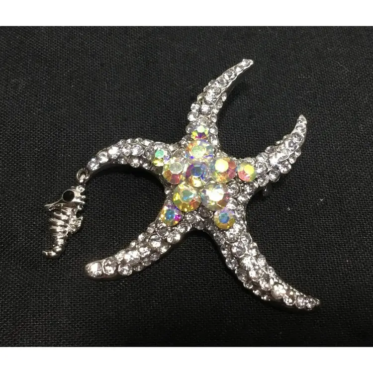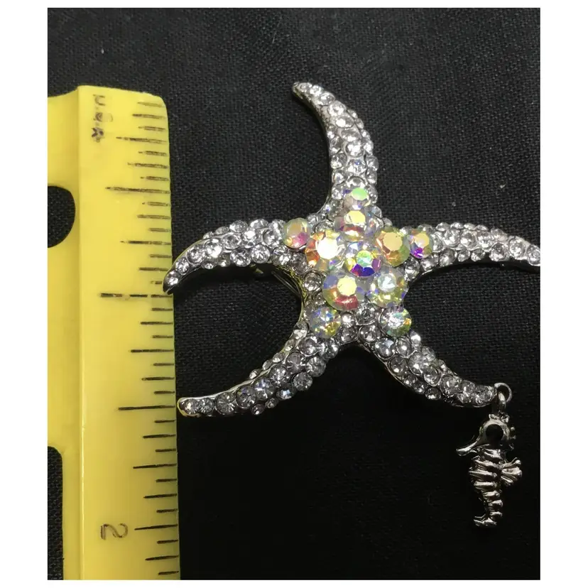 1.5 inch wide by 2 inches tall, silver tone star fish with tiny sea horse dangle. Clear rhinestones with large, AB coated rhinestone in the center. Unbranded, locking safety clasp.