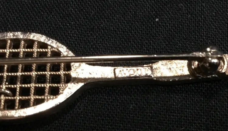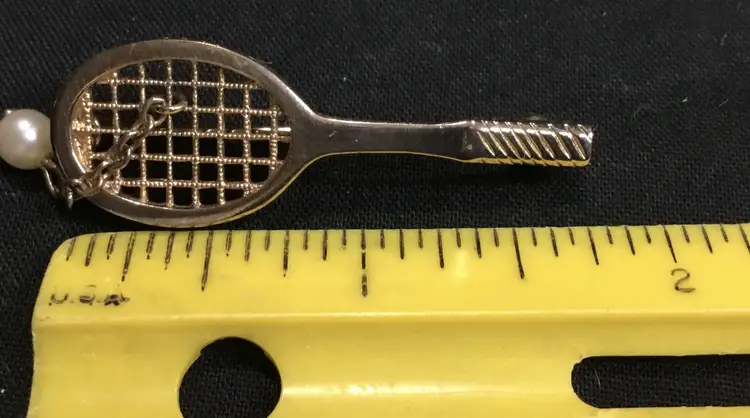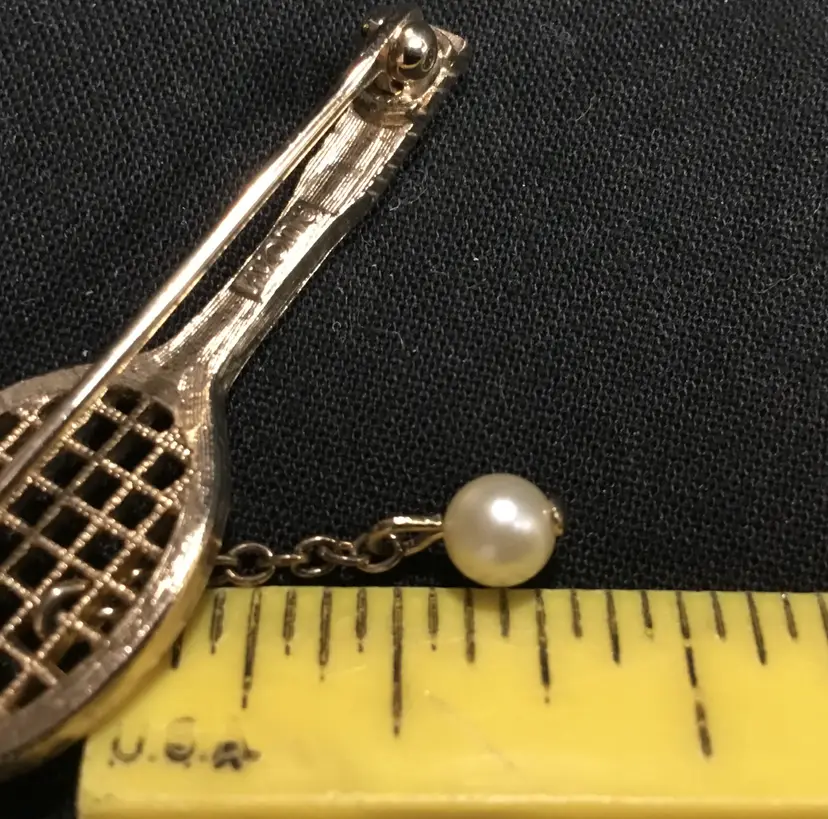 1.75 inches long by 5/8 inch wide. Gold tone metal tennis racquet with textured grip and textured strings. "Tennis" ball attached on 3/4 inch chain. Ball is a faux pearl. Safety catch. Vintage 1976 Avon. Some wear of gold tone. (See all photos.)