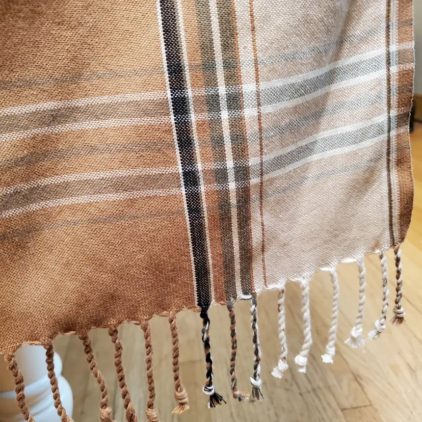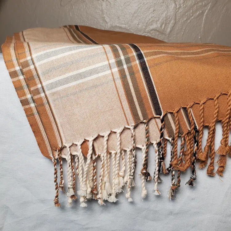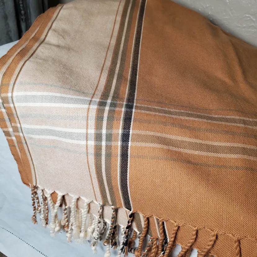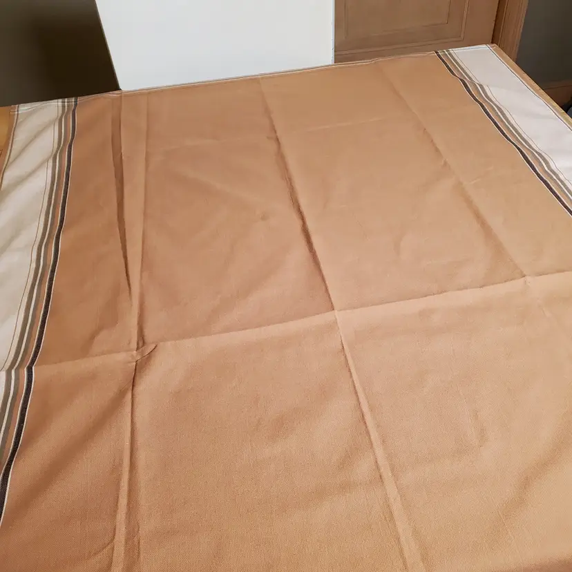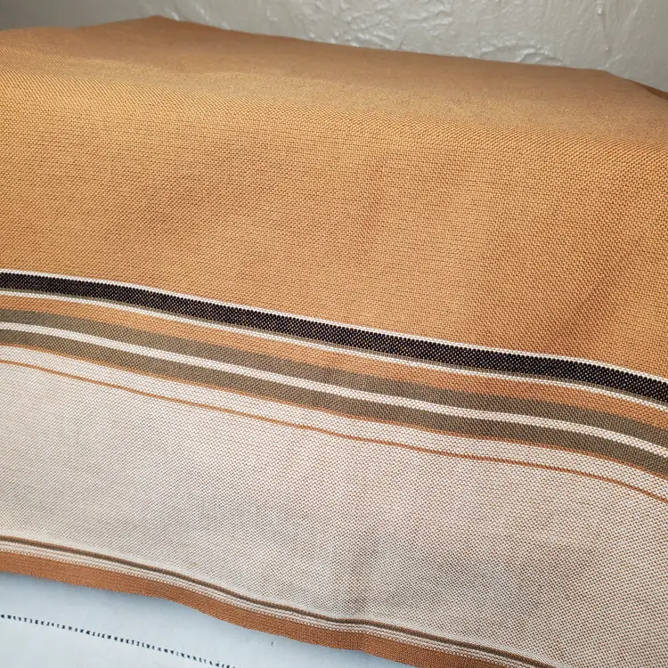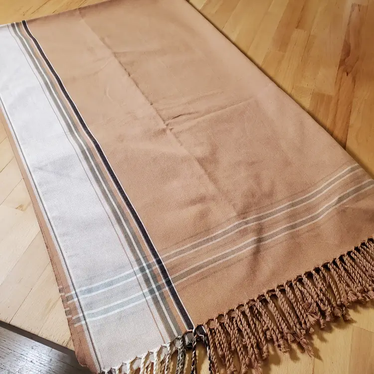 This is the perfect little cloth for using as a small tablecloth, topper, table/dresser scarf, etc. for your dining table or any display area. 38" x 60" w/o fringe. In very good condition with only one tiny light spot (see photo) that you'd really have to hunt for.