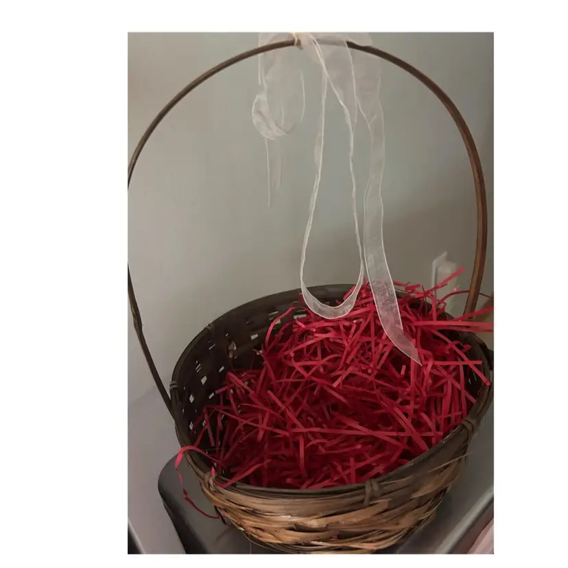 Brown wicker basket with red decorative fill. Perfect for gifts or home decor.