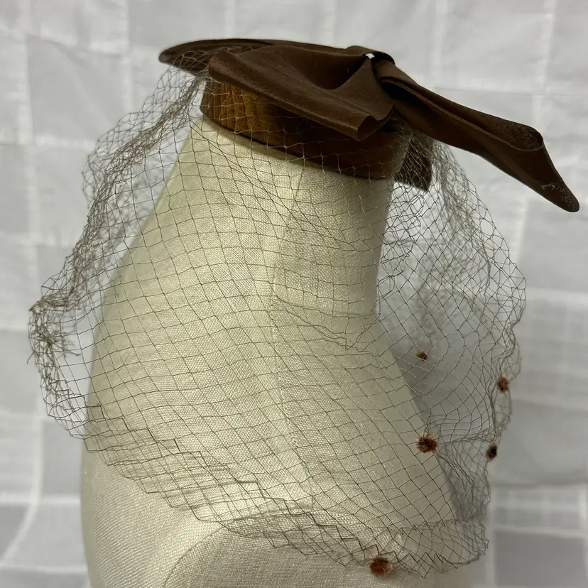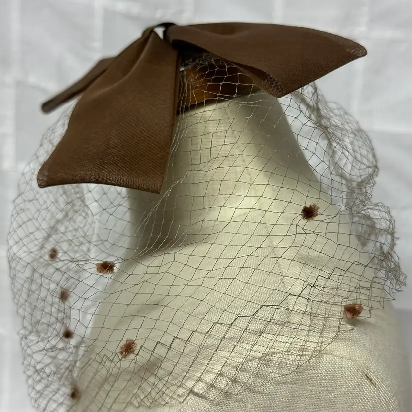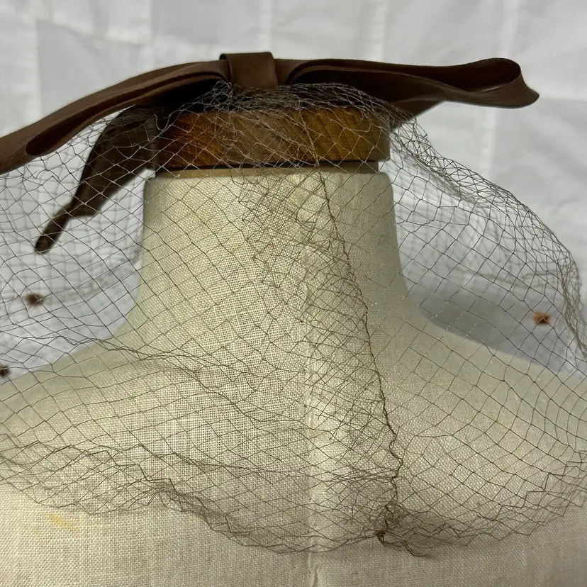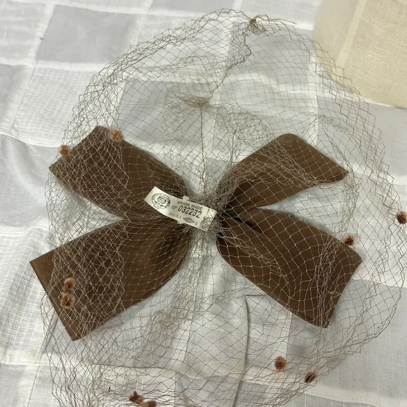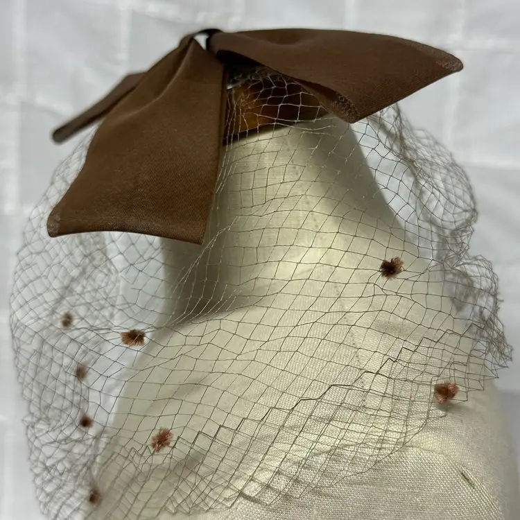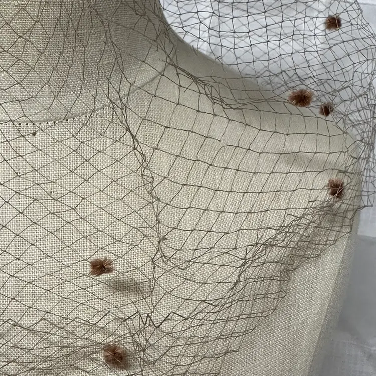 This is pretty!! I am unsure to exactly measure it, but it was in with the three other hats I have listed measuring 20.5”, so I am assuming it would fit the same. As far as I can tell, the netting is in nice shape. There are matching pom pom like pieces threaded in the netting. No staining that I can see on bow. Overall nice condition. There is no overt smell that I can smell.