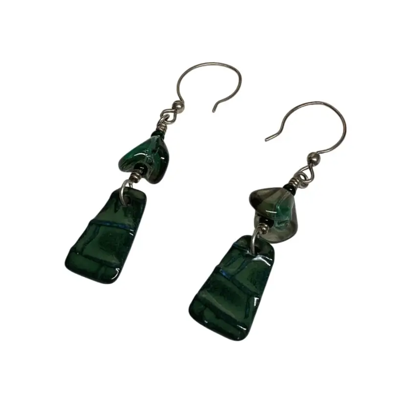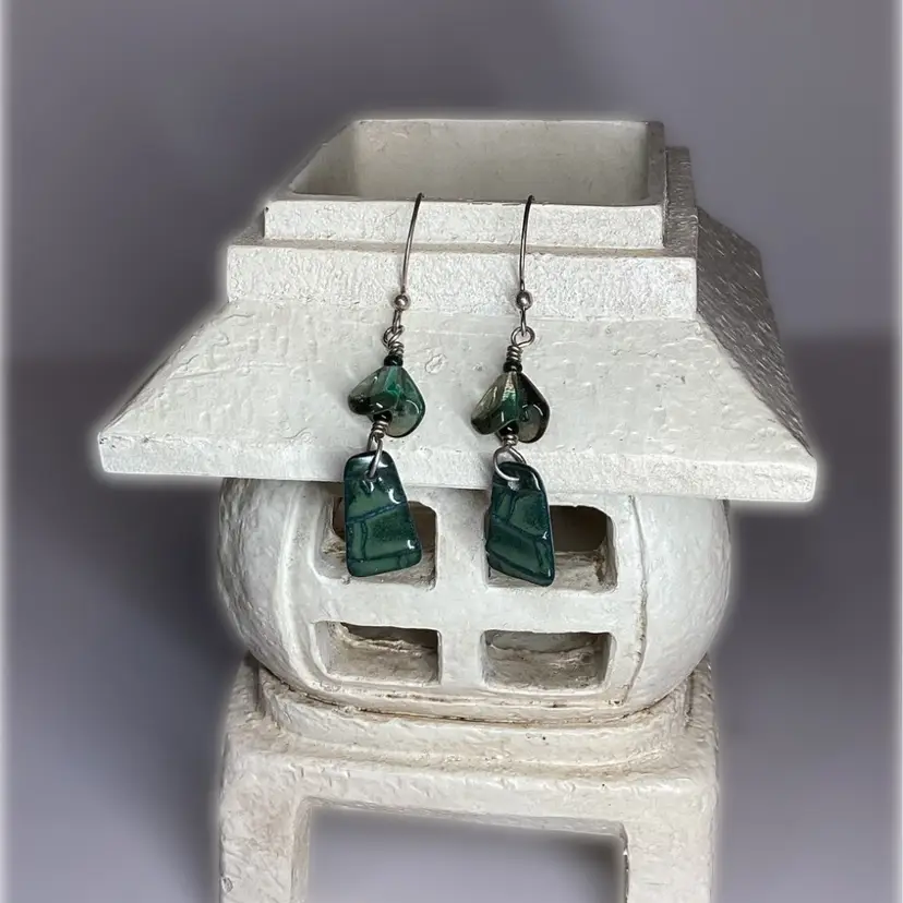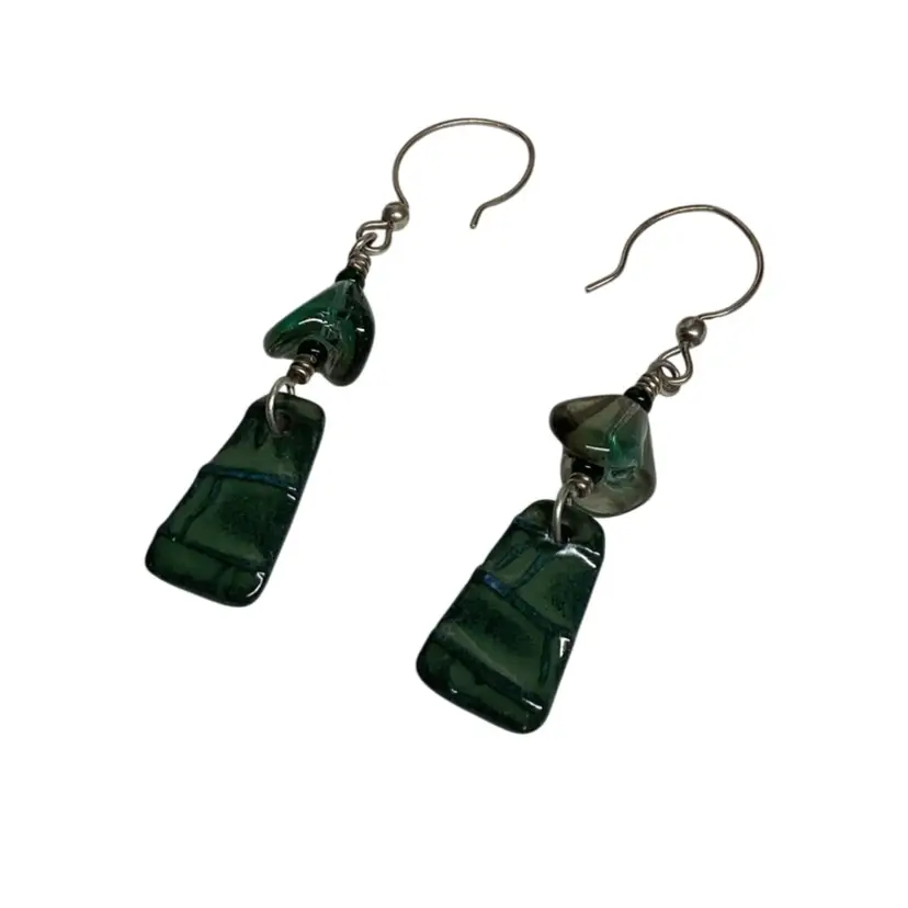 Dress them up or down, these earrings are just as comfortable with jeans or date night attire. They have a boho vibe with their hand made ceramic drop in a dark green with lighter highlights, paired with an ombré green to gray tulip Czech glass bead. The earring is approximately 2.75” long on a sterling silver round hook. The round ear wire used to arrange the earring is also sterling silver. These earrings were hand made by me in my Lancaster, PA jewelry studio. #earrings #ooak #ceramic #green #handmade