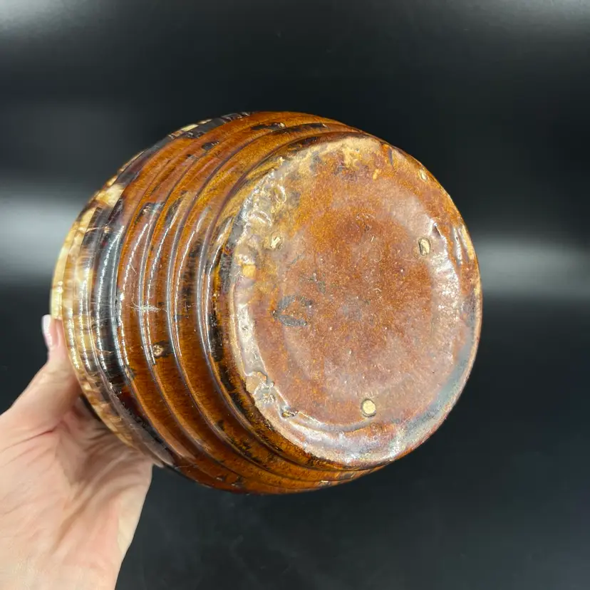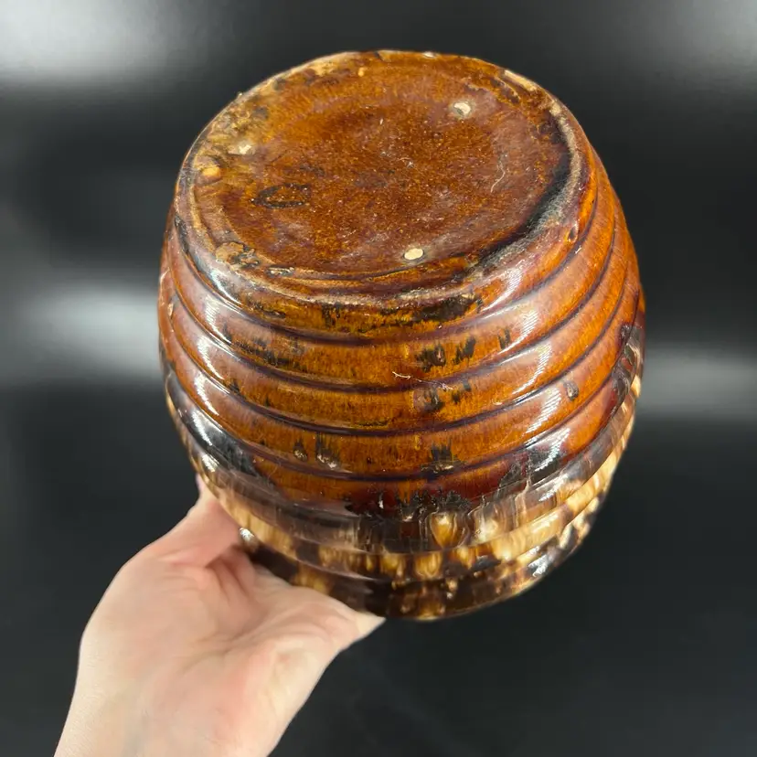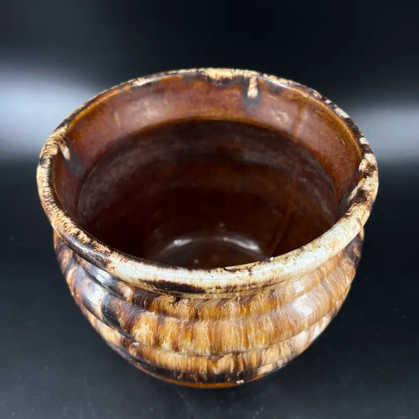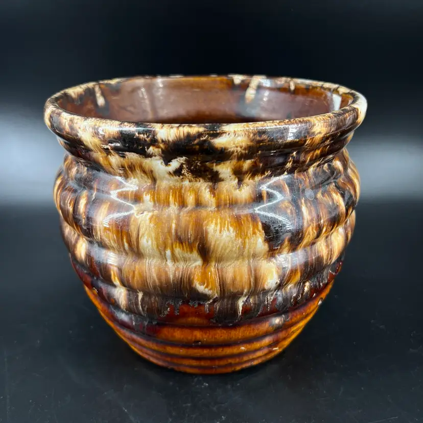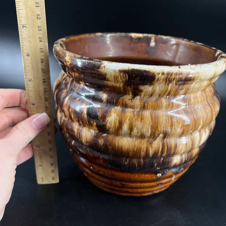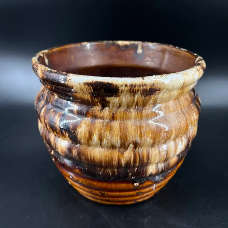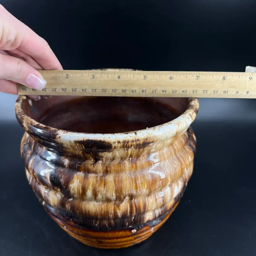 This brown drip planter has a ribbed design. There are no markings or signatures. It measures approx 6” tall and 7” wide. There are no chips or cracks.