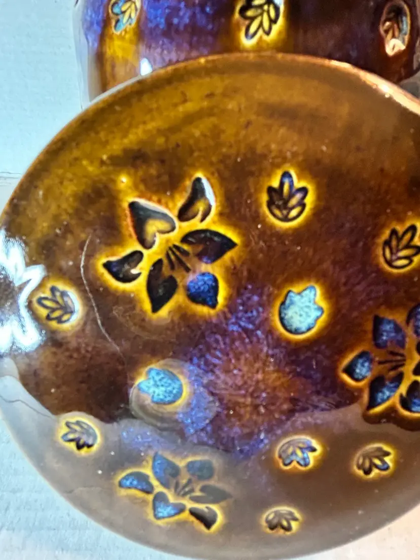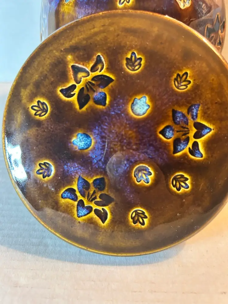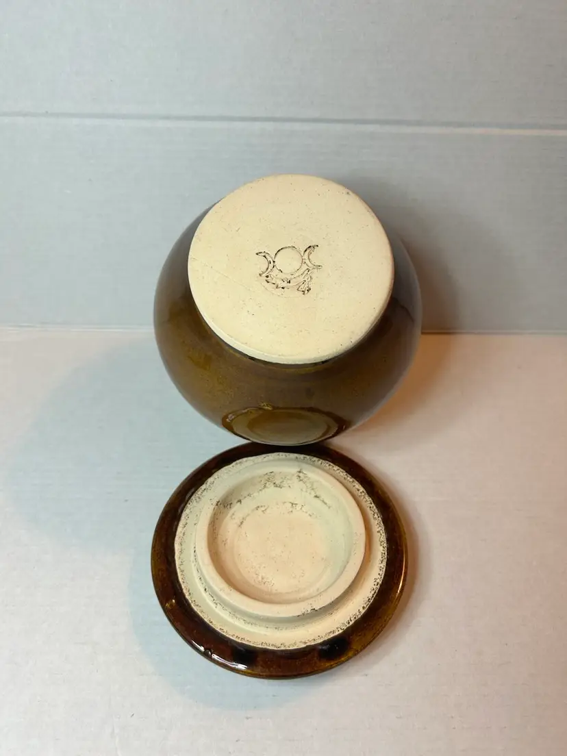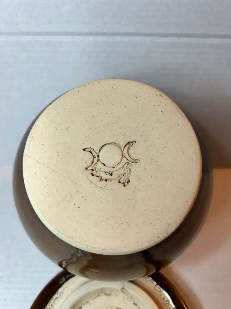 The Brown Glaze Studio Pottery Art Ginger Jar features a unique design with a stamped triple goddess symbol, adding an artistic and symbolic touch to your decor. Made with a brown glaze, this jar is both functional and aesthetically pleasing, perfect for displaying on a shelf or using as a decorative piece in your home.