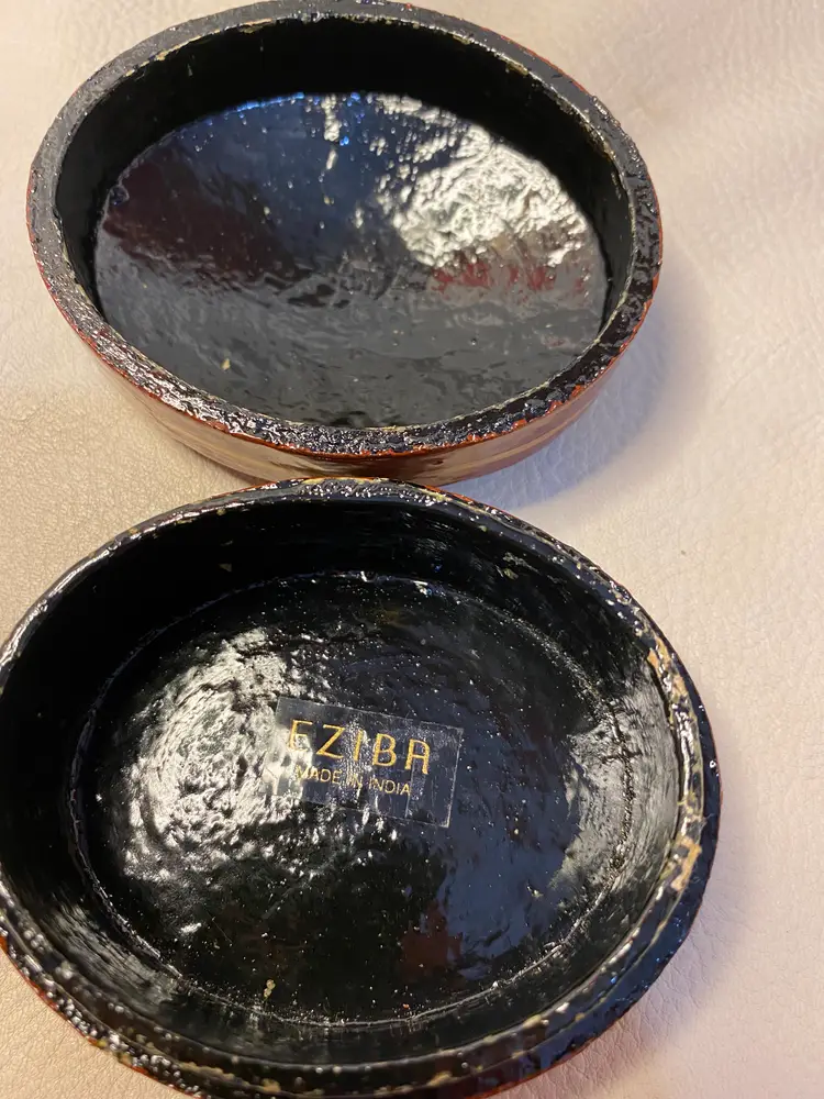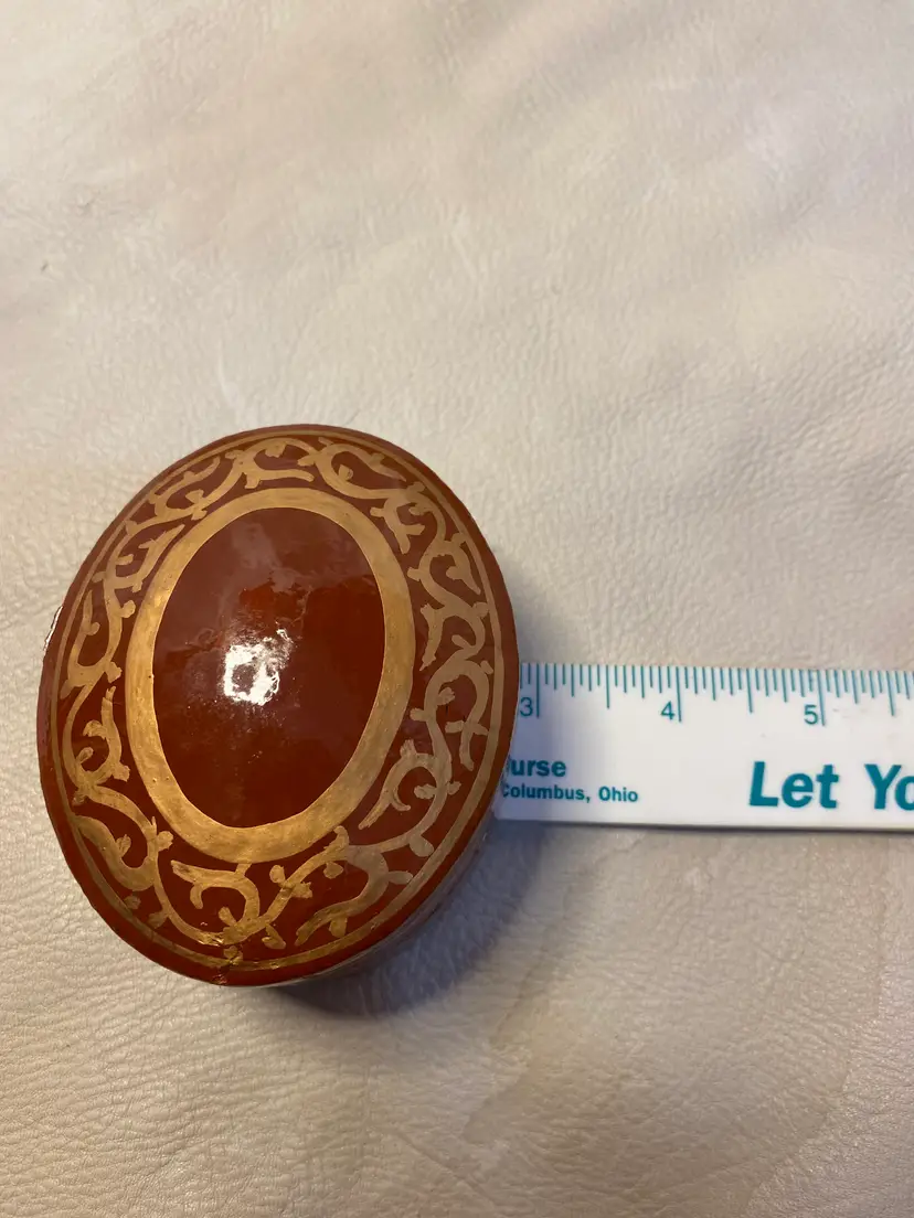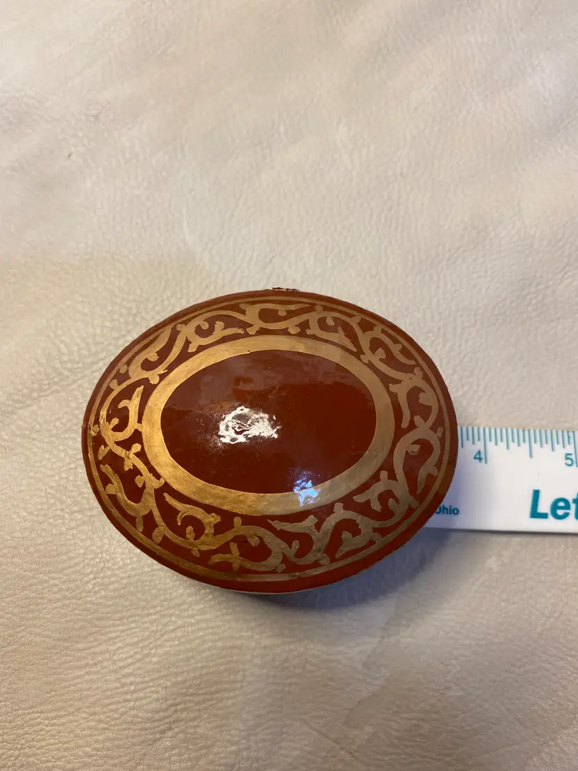 Few small nicks on inside of lid. No splits or cracks . Measurements are 3” wide x 3 3/4” long. Original sticker on box. Nice gold designs, coloring is good.