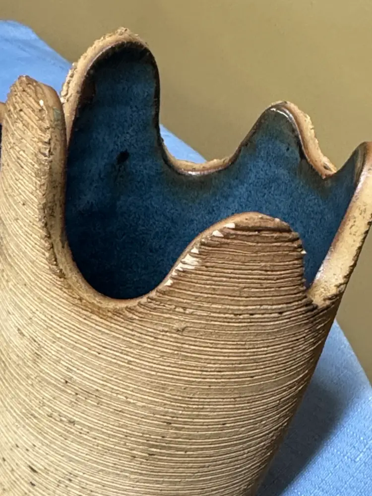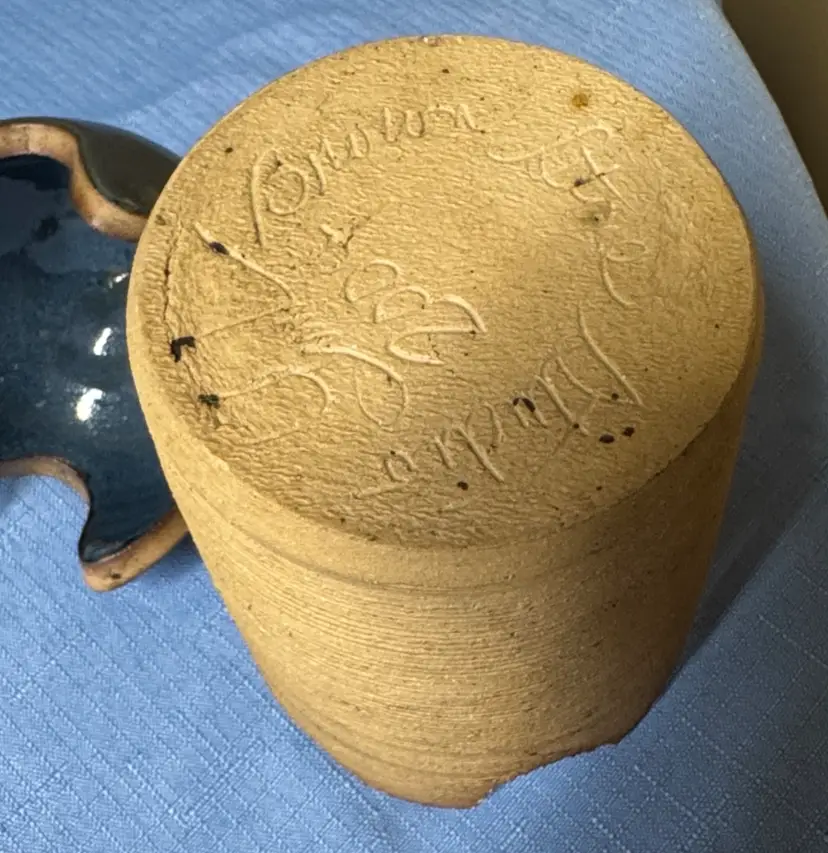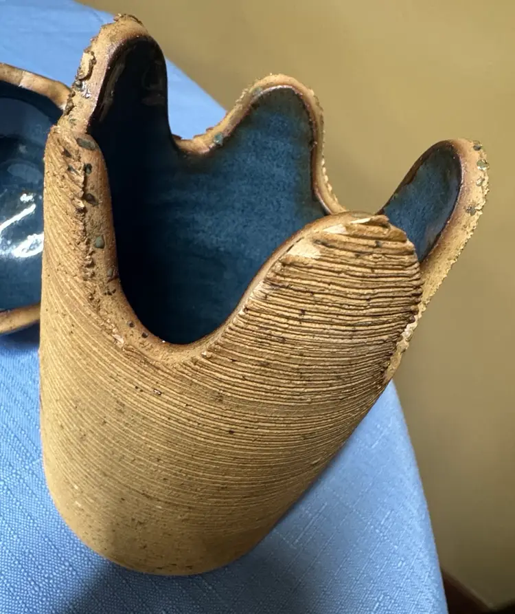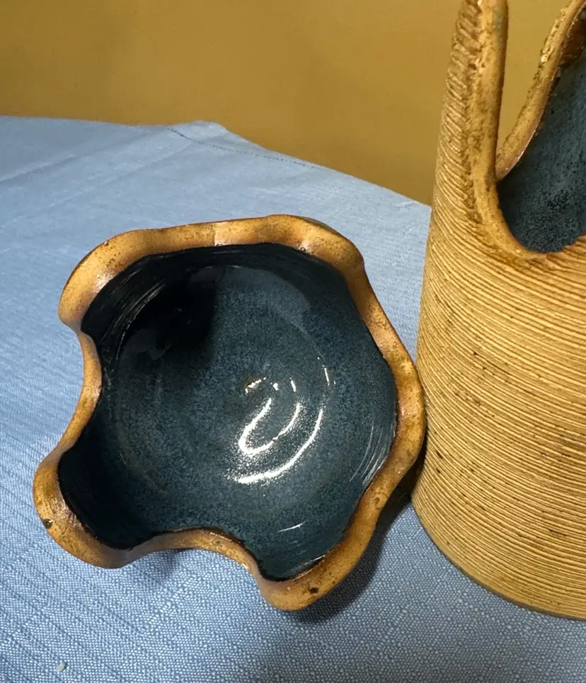 Stylish handcrafted ceramic jar featuring a glossy blue top and textured tan body. The blue color adds a subtle pop while the tan body offers warm, natural appeal. Perfect for adding artisanal charm to any room. Brown Stone Studios Art Pottery Lidded Jar Blue and tan Artist Signed dated 2004 7” tall about 3.25” diameter Unique design in good condition there are some rough spots on the top edge of the bottom piece. (405327261)