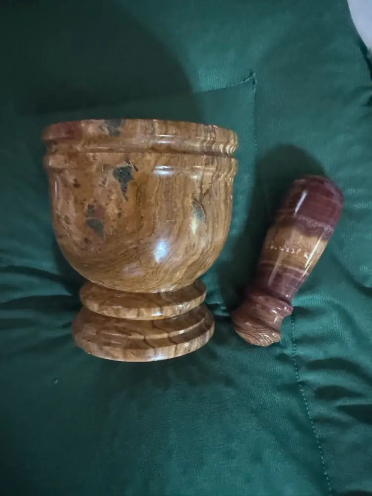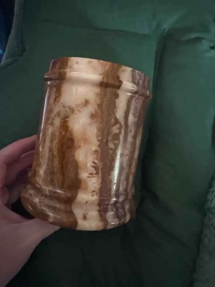 This Brown / White Onyx Set is a stunning addition to any home decor collection. The set includes a beautiful Onyx Canister and a matching Mortar / Pestle, perfect for grinding spices or herbs. Together, these pieces would make a great gift for any occasion or a stylish addition to your own home. The intricate patterns and textures of the brown and white onyx make this set a unique and eye-catching piece. Extremely heavy!!! Real Onyx