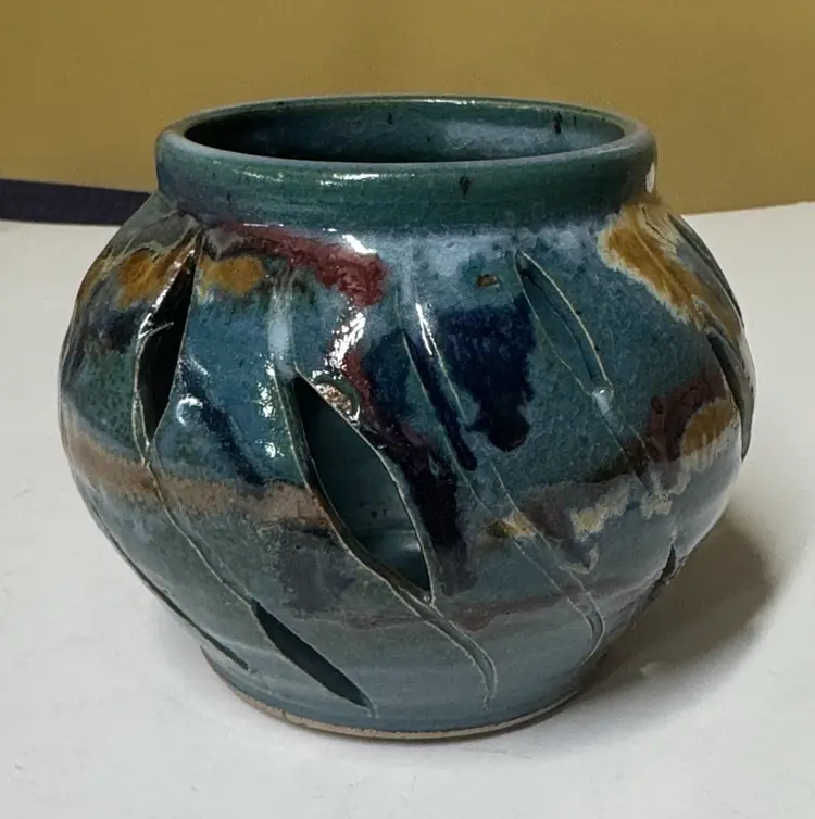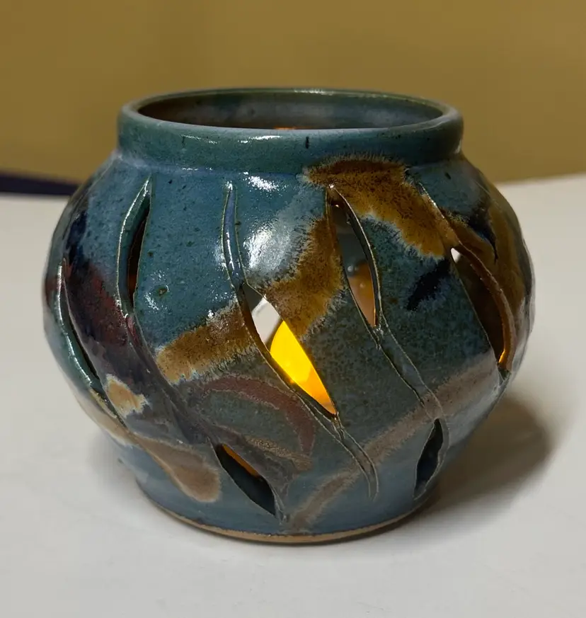 Bruce Odell Pottery TEALIGHT candle bowl Vase – Signed Art Studio Piece Dated 97 3.75” tall 4.5” wide 2.75” opening on top World Campion Artist. Featuring a beautiful blend of blue and brown hues, this piece adds a touch of elegance to any room. Excellent condition with no breaks or chips (63120265)