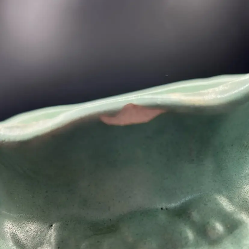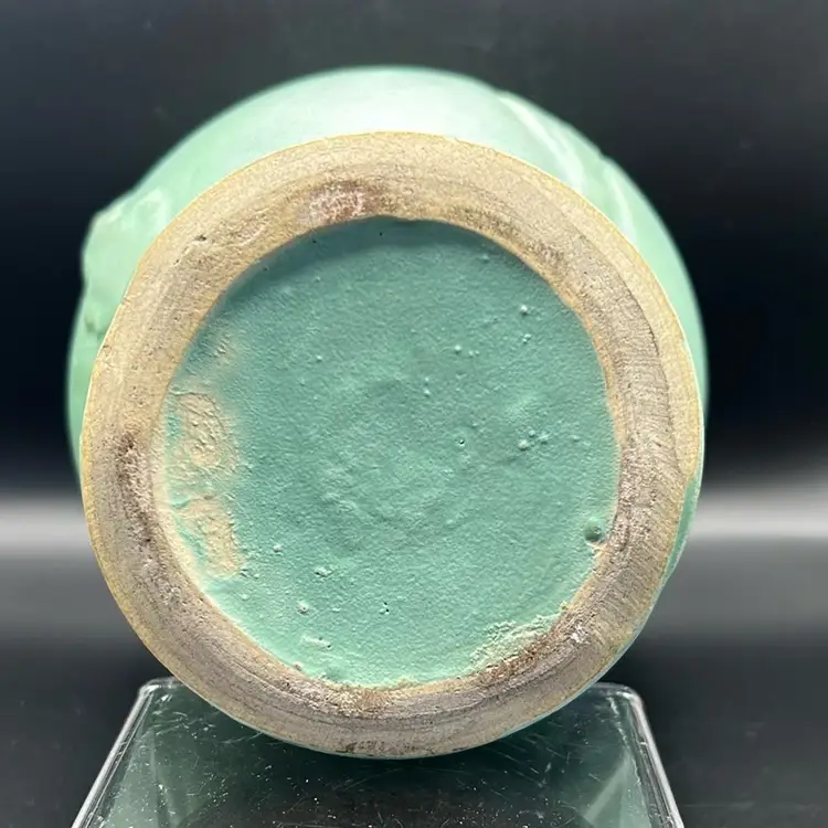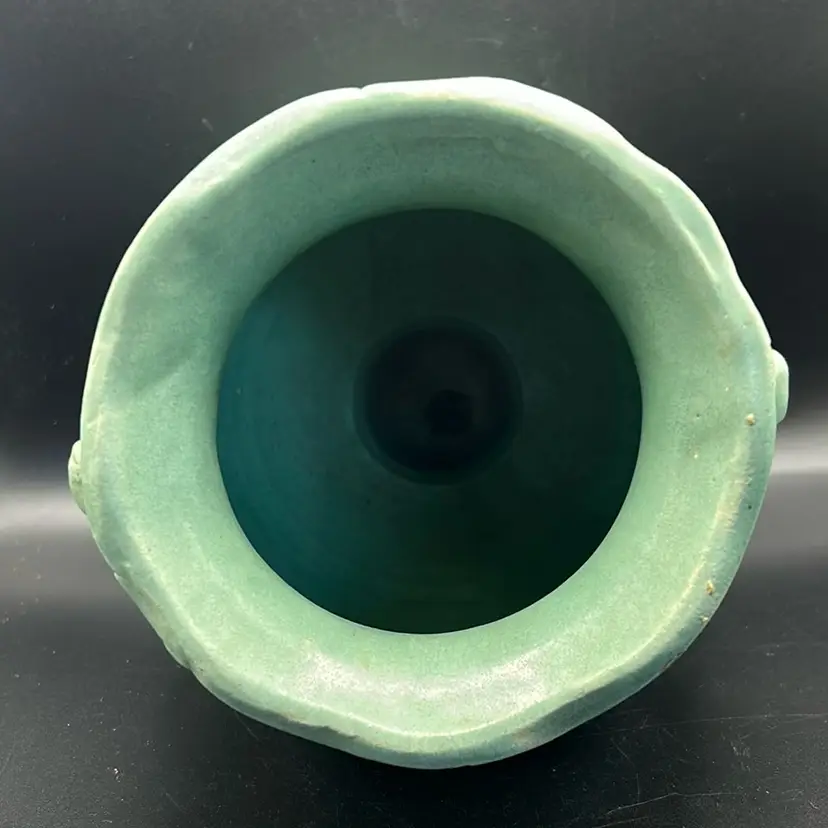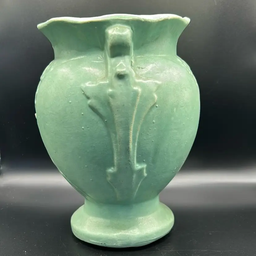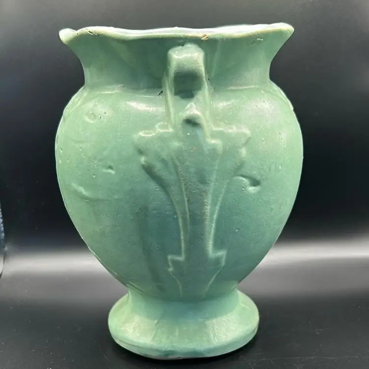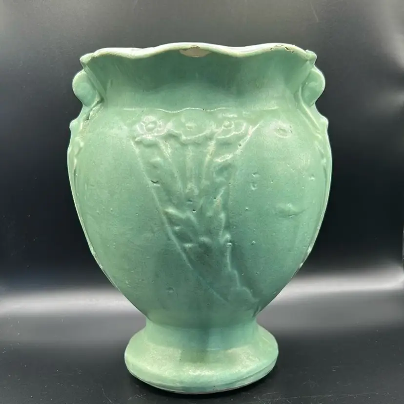 This piece is a vintage brush McCoy pottery vase. It is model 740 with a Mac green sea foam glaze featuring a floral design. It is from the mid 20th century. It does have one chip on the rim as featured in the pictures this piece stands 7 inches tall and is 4 1/2 inches wide.