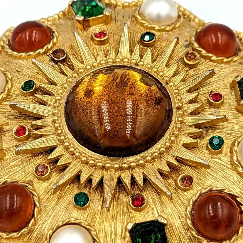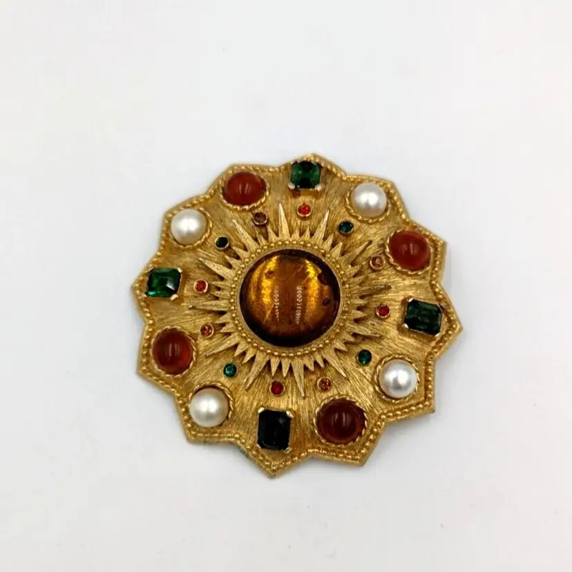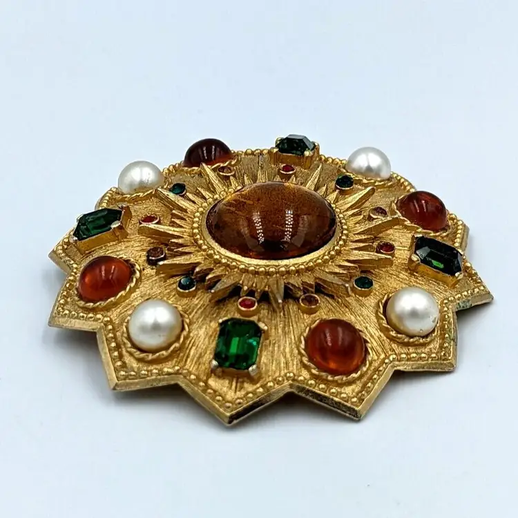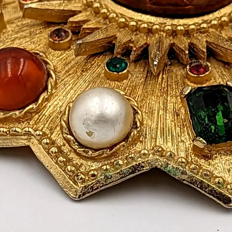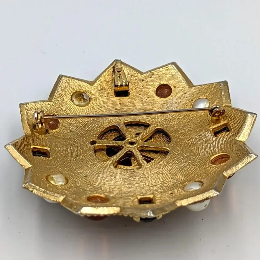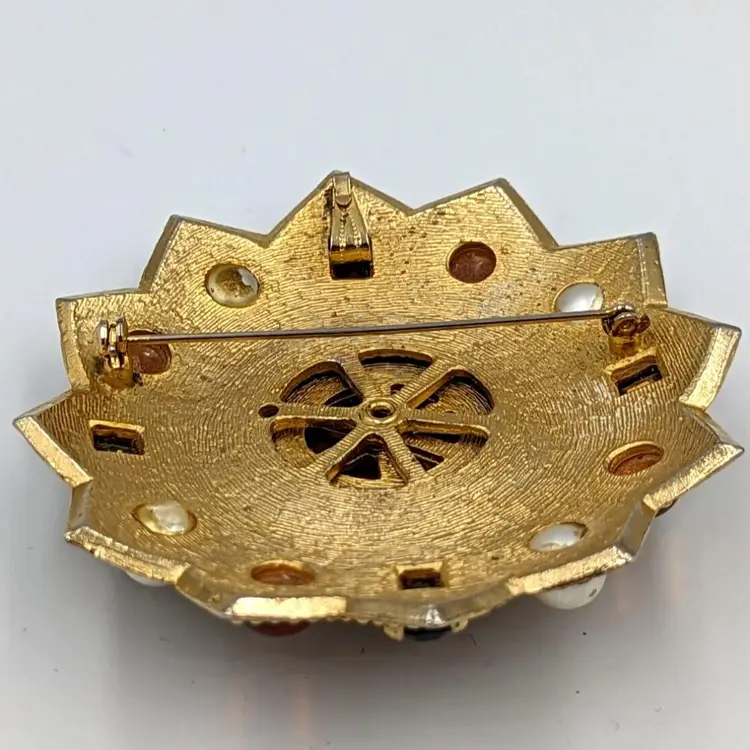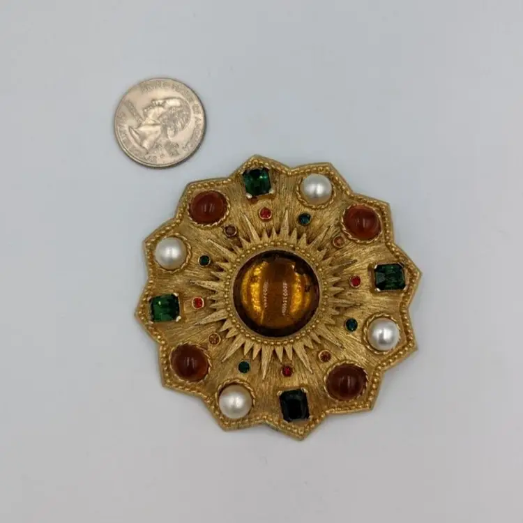 Brushed Gold Tone Statement Brooch Big Unmarked Glass Cabochons Faux Pearl Pin/Pendant 2.75" diameter Unmarked Good vintage condition