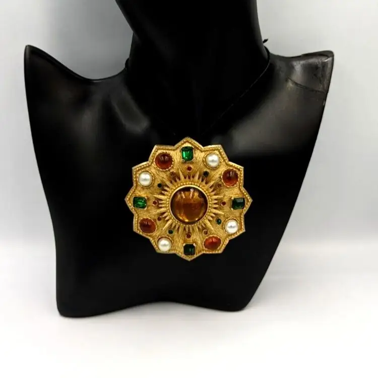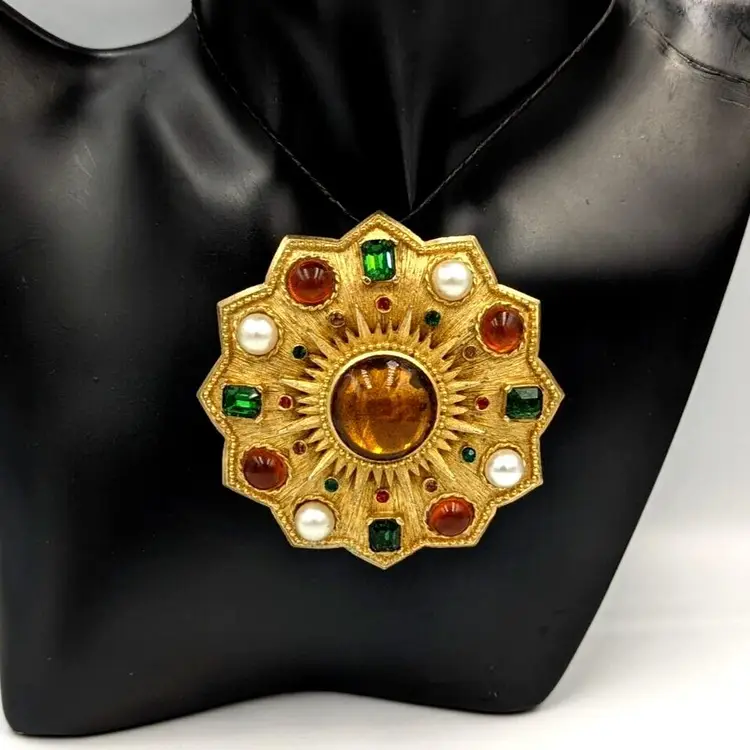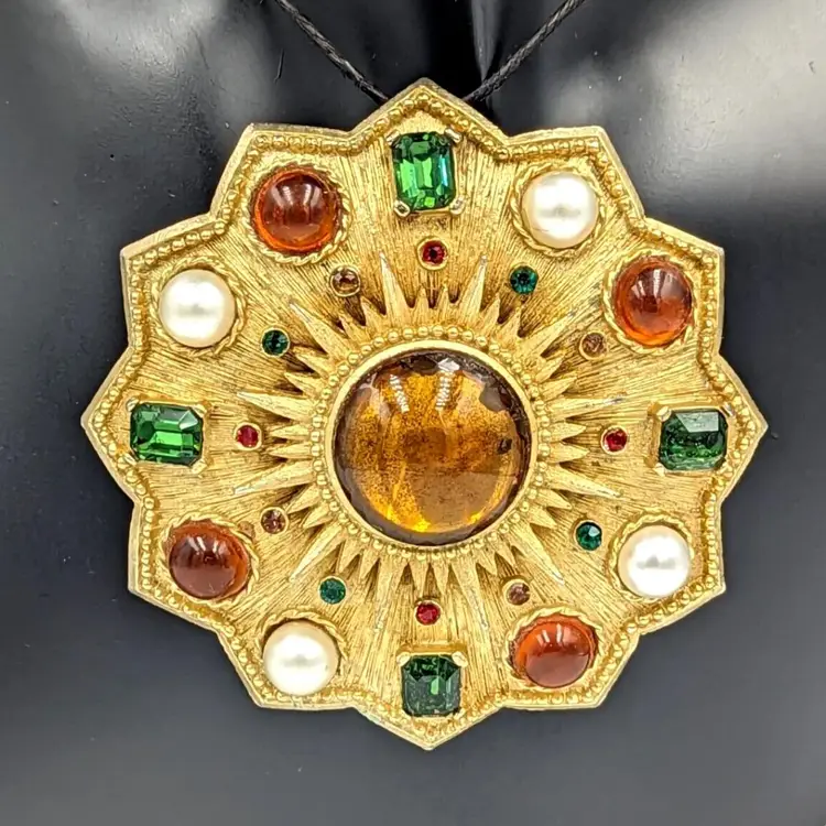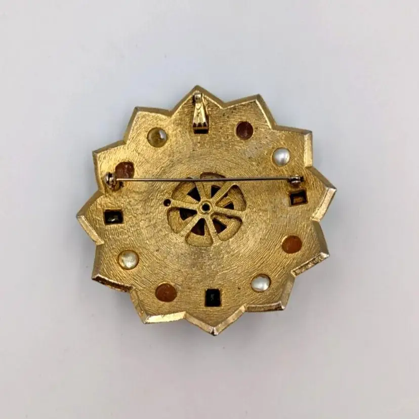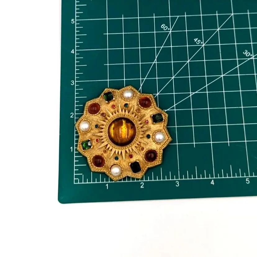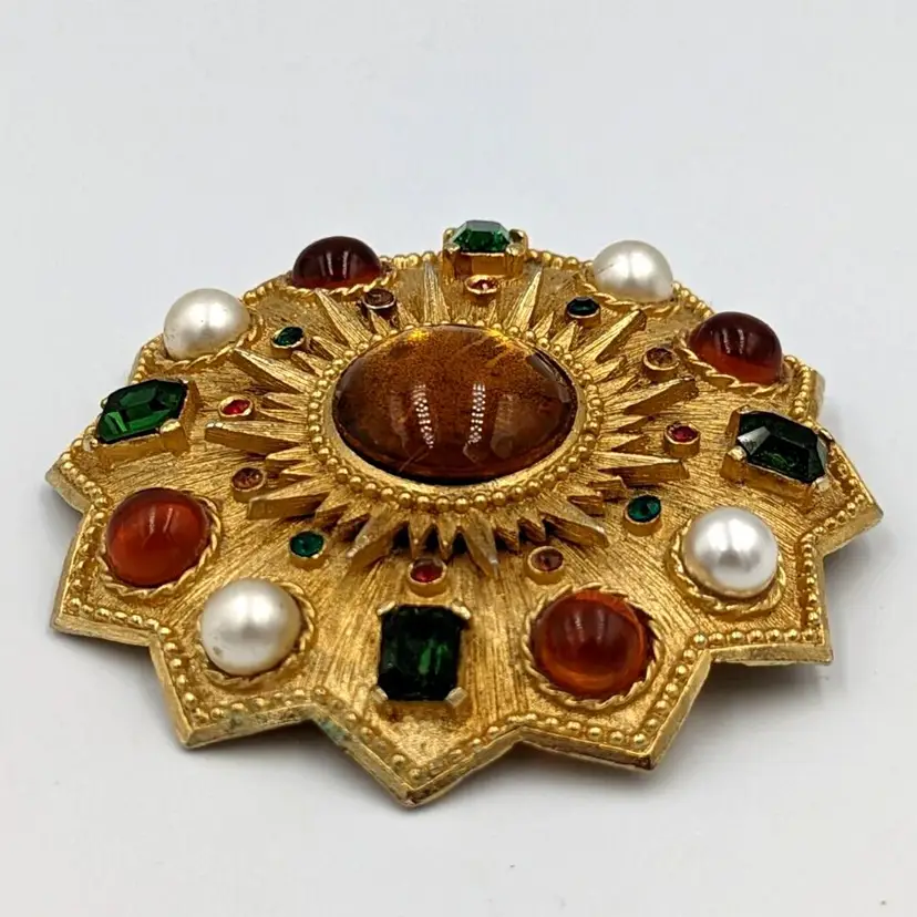 Brushed Gold Tone Statement Brooch Big Unmarked Glass Cabochons Faux Pearl Pin/Pendant 2.75" diameter Unmarked Good vintage condition