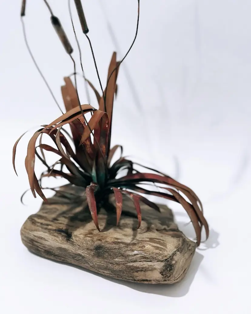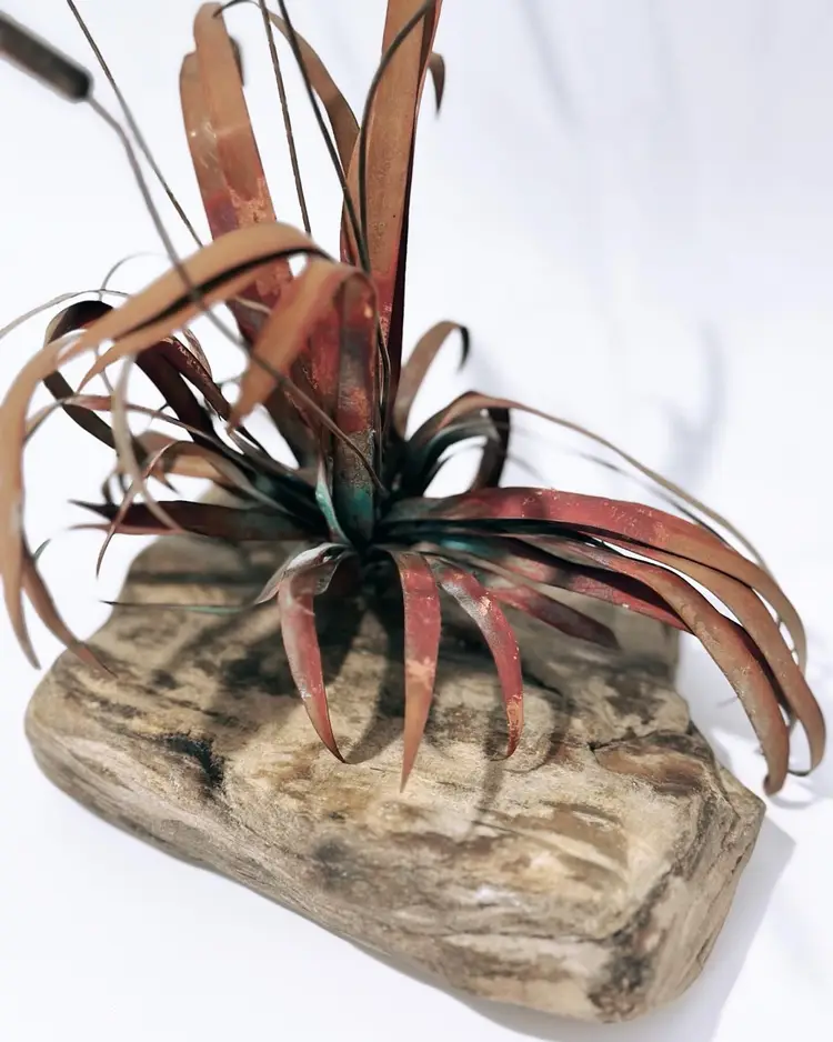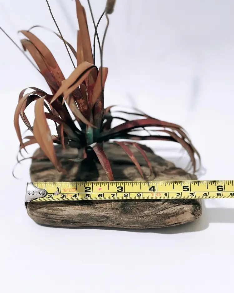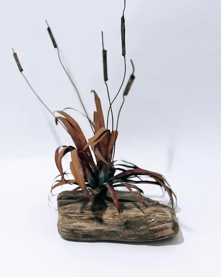 This unique sculpture is a beautiful addition to any art collection. The piece features brass, metal, and stone materials, and is designed in the style of brutalism. The sculpture depicts cattails growing out of a stone rock base, making it a perfect representation of nature.