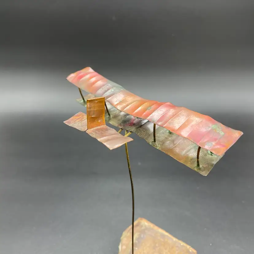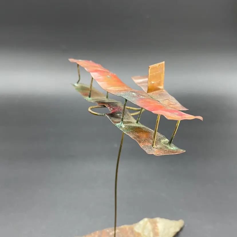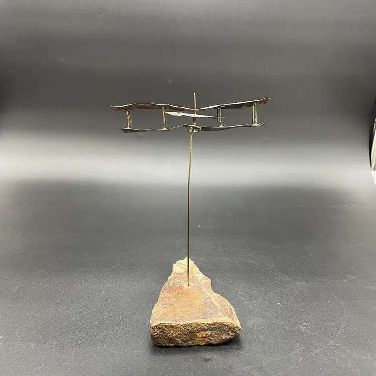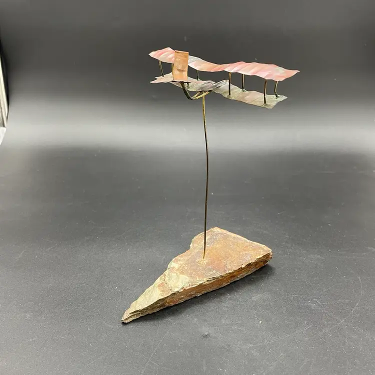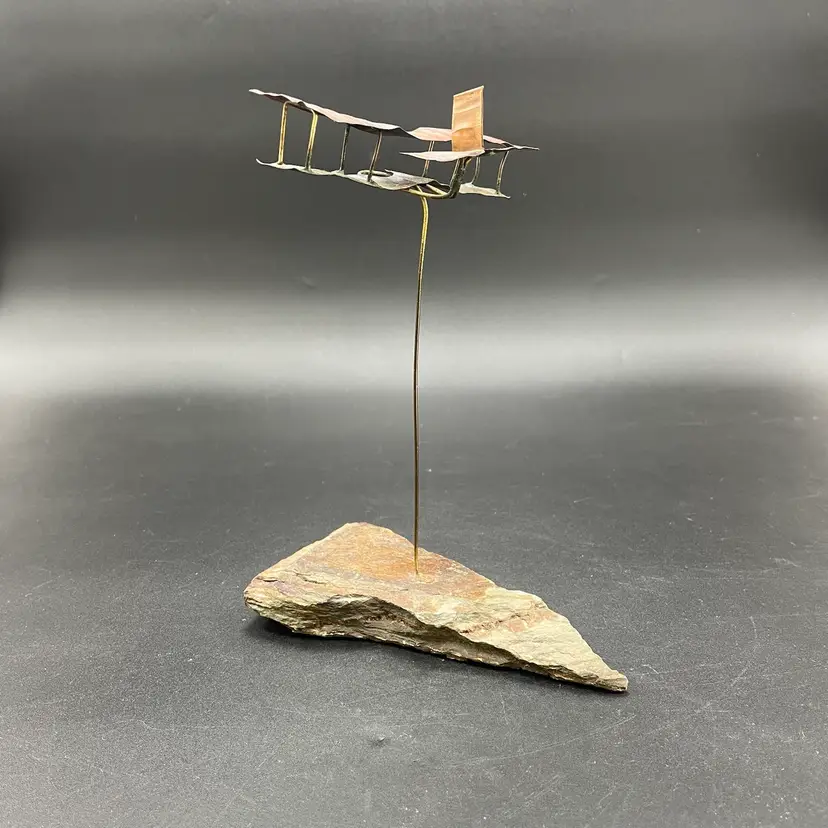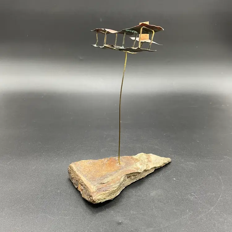 This is a vintage 1972 handcrafted torch cut metal and stone kinetic art sculpture featuring a bi-plane in flight. Measures approximately 8" tall from the highest point of the plane to the base x 6" long. Signed and dated by artist. No major flaws.