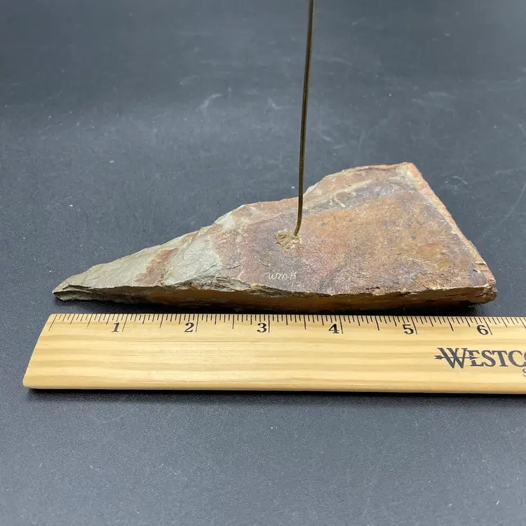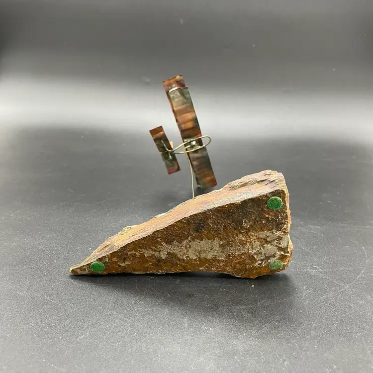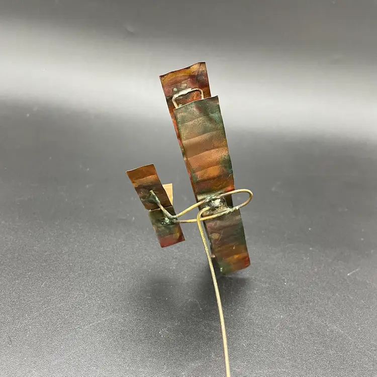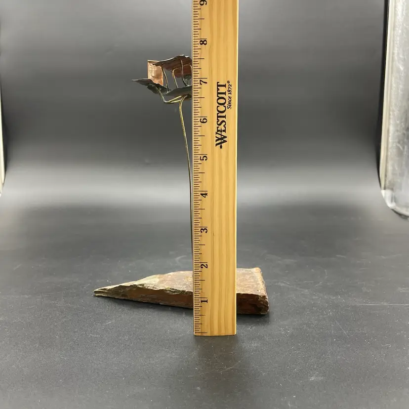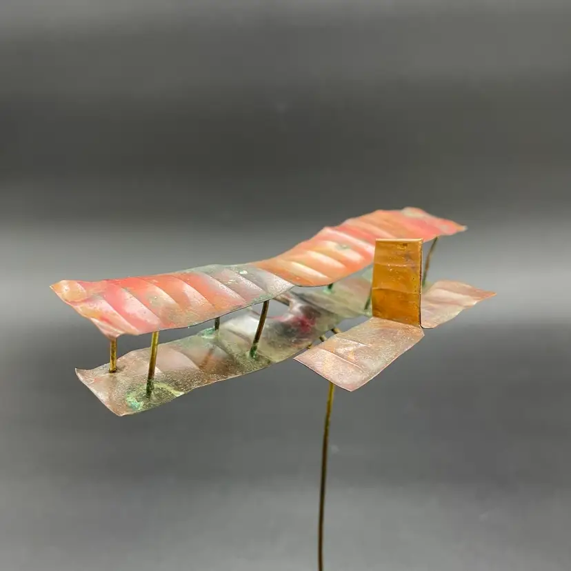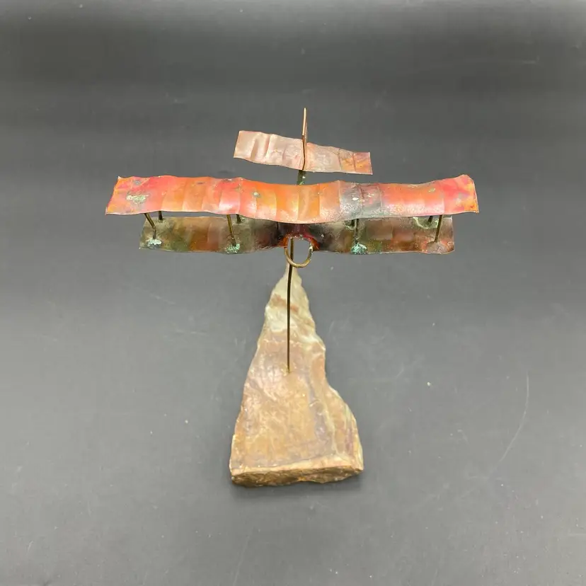 This is a vintage 1972 handcrafted torch cut metal and stone kinetic art sculpture featuring a bi-plane in flight. Measures approximately 8" tall from the highest point of the plane to the base x 6" long. Signed and dated by artist. No major flaws.