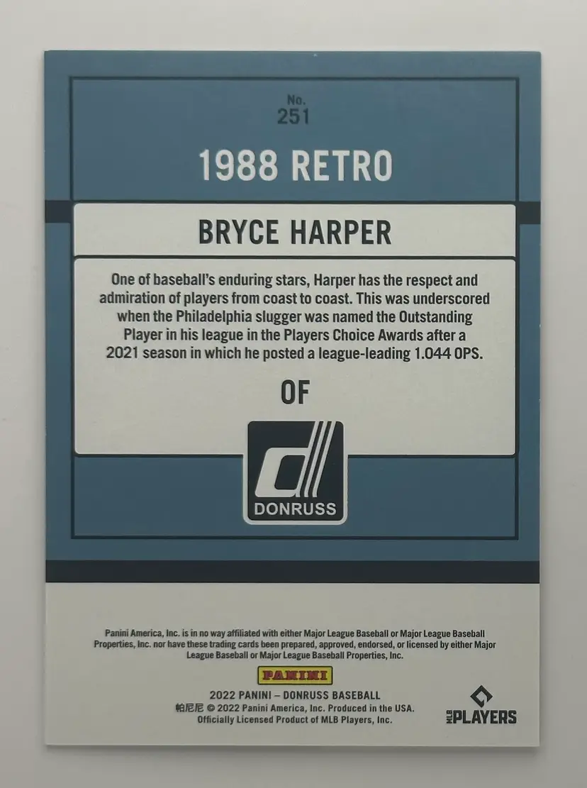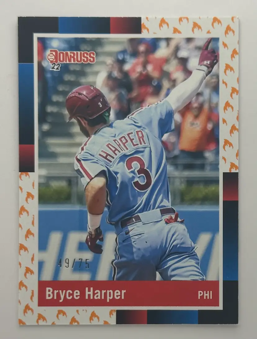 Snag this limited edition Bryce Harper card from the 2022 Donruss series, numbered 49 out of 75, showcasing the Phillies star in action.
