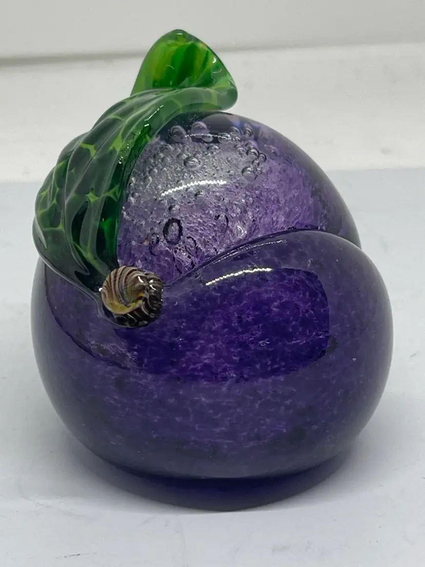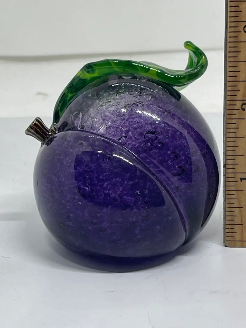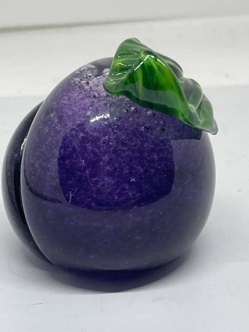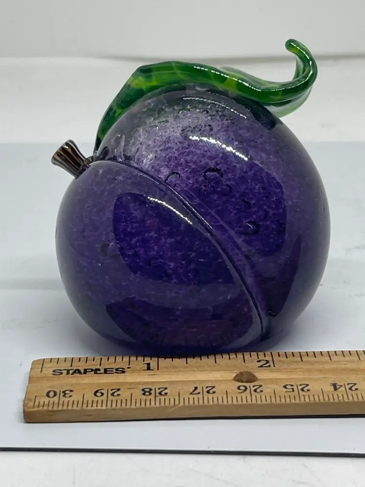 Gorgeous plum paperweight with realistic stem and curled leaf. Dated and signed